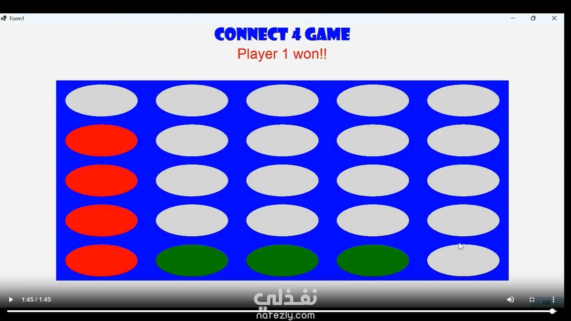هذا المشروع هو تطبيق للعبة Connect 4 تم تطويره باستخدام لغة C# وتقنية Windows Forms. اللعبة عبارة عن شبكة من الأعمدة والصفوف يقوم فيها اللاعبون بإسقاط الأقراص، والهدف هو تكوين أربع قطع متتالية بشكل أفقي أو رأسي أو قطري. مميزات المشروع: 1) وضع اللعب بين لاعبين (Player vs Player) - يتيح لشخصين اللعب على نفس الجهاز. - كل لاعب يختار دوره بالتناوب لوضع القرص الخاص به. 2) وضع اللعب ضد الكمبيوتر (Player vs Computer) - يحتوي على منطق حيث يختار الكومبيوتر أماكن الحركة بناءً على قواعد محددة داخل الخوارزمية. 3) واجهة رسومية سهلة الاستخدام (GUI) - تم تصميمها باستخدام Windows Forms. - تعرض الشبكة، الأقراص الملونة، ودور اللاعب الحالي. - تتفاعل مباشرة مع المستخدم عند الضغط على الأعمدة. 4) اكتشاف الفائز - يقوم التطبيق بفحص الشبكة بعد كل حركة لمعرفة إذا تم تكوين 4 قطع متتالية. - في حال الفوز، تظهر رسالة توضح اللاعب الفائز.
