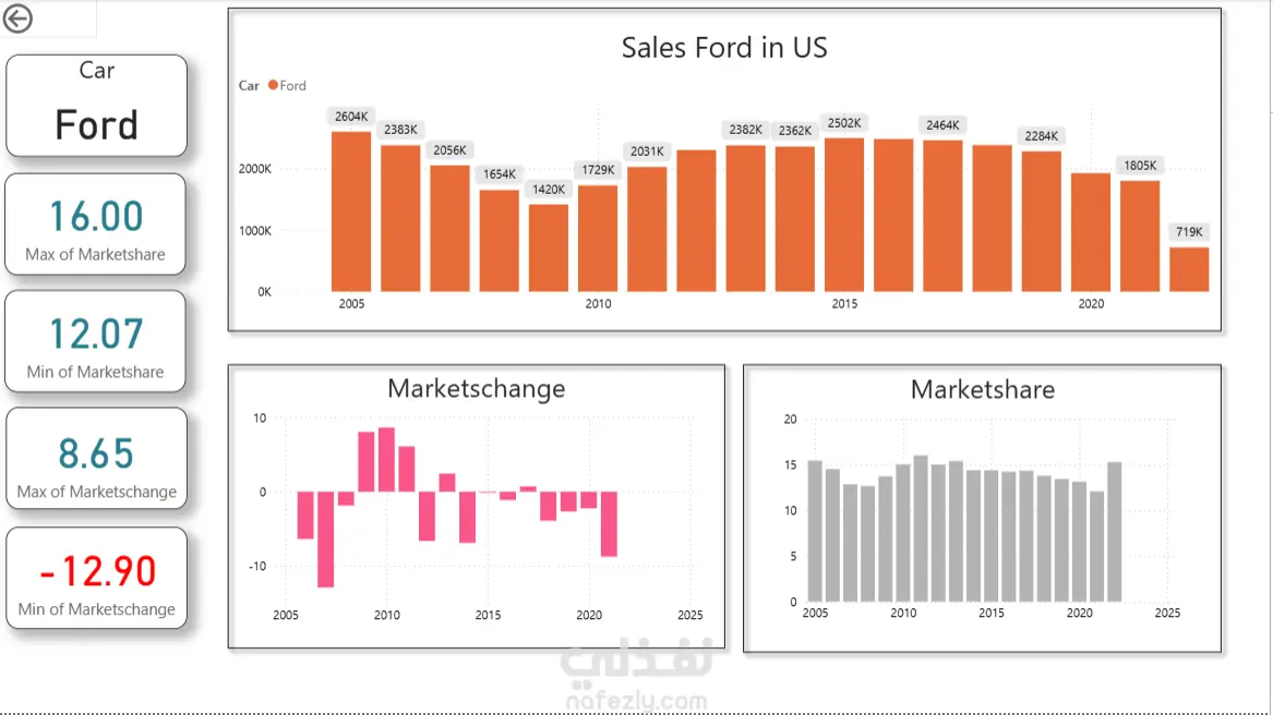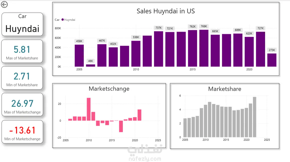 المخرج النهائي: لوحة تفاعلية على Power BI جاهزة لعرض وتحليل بيانات المبيعات والحصة السوقية وأداء السيارات.