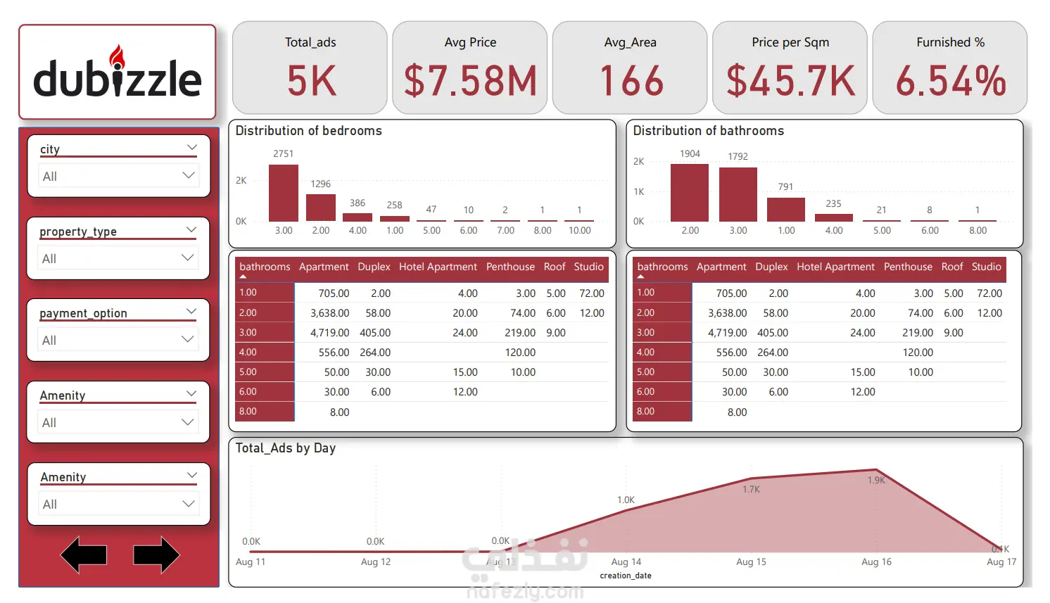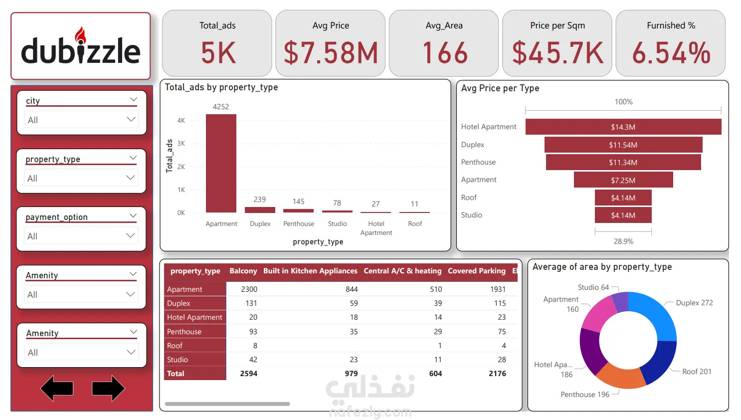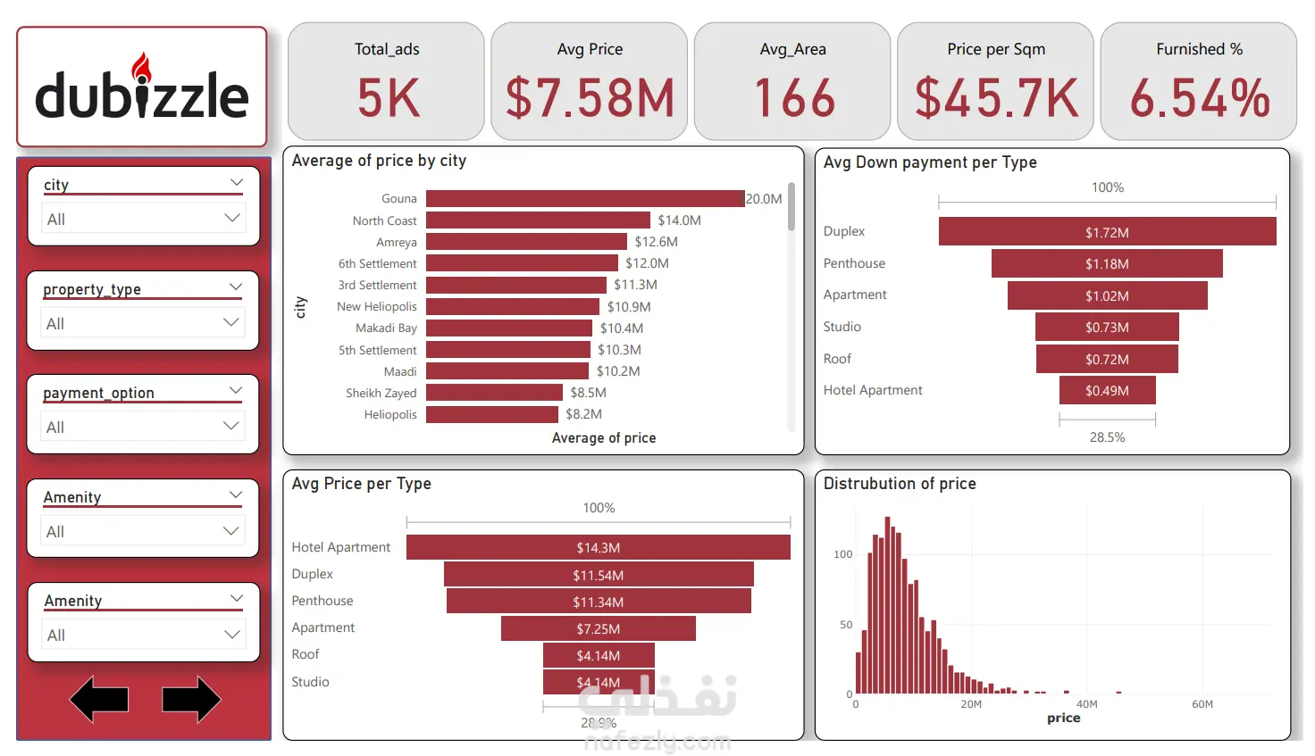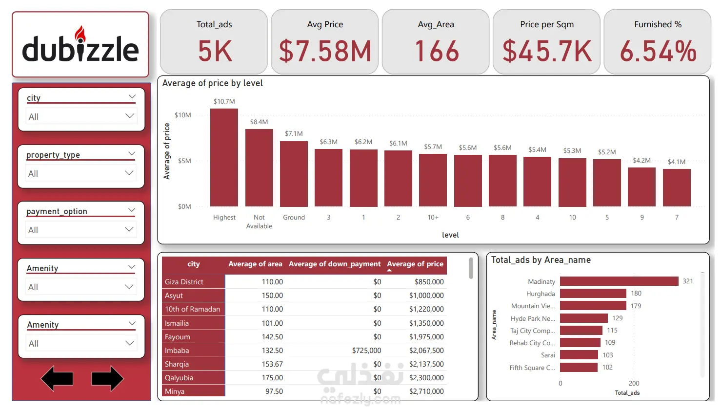 المشروع يركز على تحليل بيانات العقارات (شقق ودوبلكس للبيع) المجمعة من منصة Dubizzle المصرية. يشمل المشروع: Web Scraping لجمع 5 آلاف إعلان باستخدام Python (Requests + BeautifulSoup). تحليل استكشافي للبيانات (EDA) لفهم التوزيعات والاتجاهات. نماذج تعلم آلي للتنبؤ بالأسعار باستخدام Gradient Boosting، Random Forest، وغيرها. لوحات تحكم Power BI لعرض التوزيعات والمؤشرات الرئيسية. تطبيق ويب تفاعلي Streamlit للتنبؤ بأسعار العقارات. أهم المراحل والتقنيات: تنظيف البيانات: pandas، معالجة القيم الفارغة، استخراج ميزات جديدة (مثل: price_per_sqm، has_garden). EDA: معظم العقارات غير مفروشة (93.46%) علاقة قوية بين السعر والمساحة (0.85) وعدد الغرف (0.72) والحمامات (0.68) أعلى الإعلانات منتصف الأسبوع النمذجة: أفضل نموذج: Gradient Boosting (R² = 0.99، MAE = 167K EGP) أهم المتغيرات: المساحة، عدد الغرف، الموقع، عدد الحمامات لوحات Power BI: تحليل الأسعار حسب المدينة ونوع العقار توزيعات الإعلانات والمرافق إمكانية التصفية حسب المدينة، النوع، المرافق تطبيق Streamlit: واجهة إدخال بيانات تفاعلية (المساحة، الغرف، المدينة، المرافق) عرض السعر المتوقع مع مقارنة بالمناطق الأخرى التقنيات المستخدمة: Python (Scraping/EDA/ML)، Pandas، Scikit-Learn، Power BI، Streamlit.