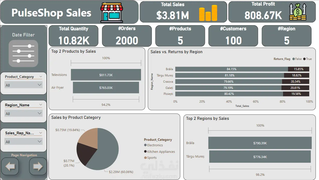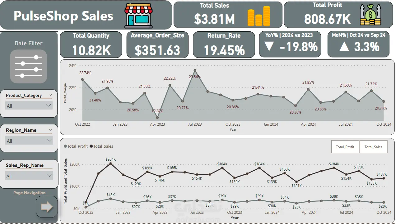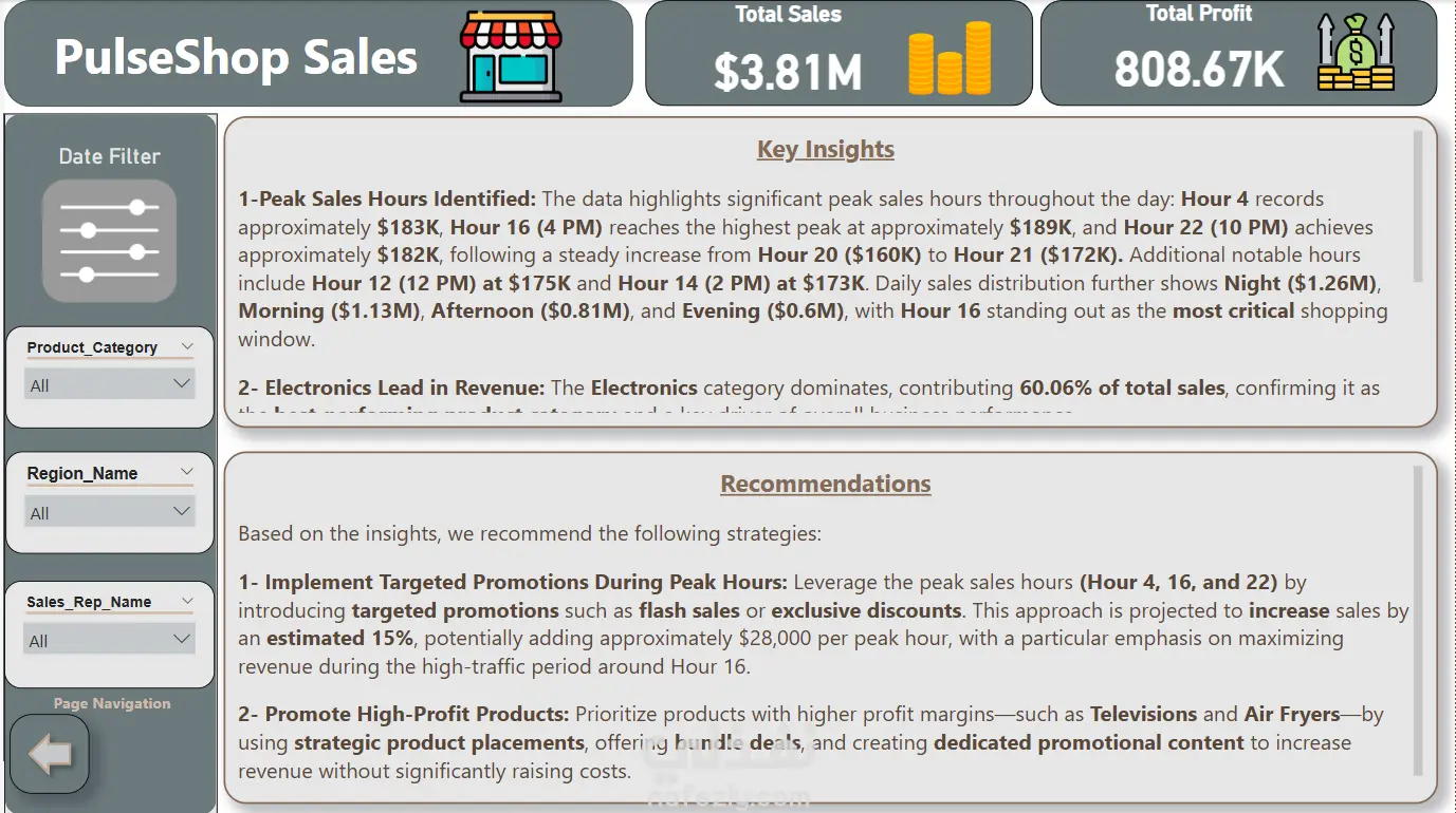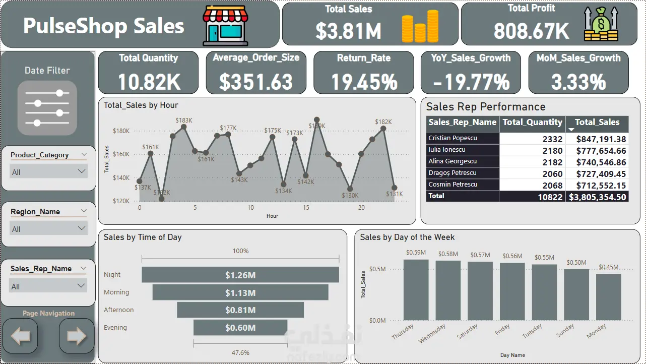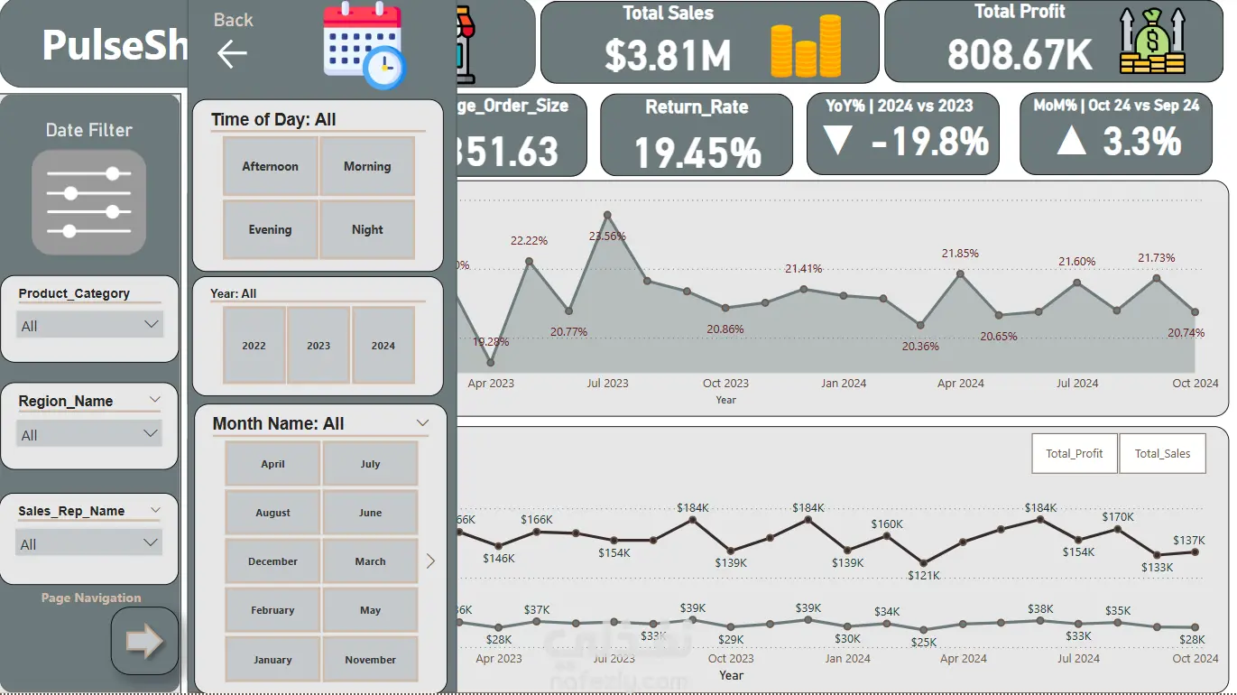 لوحة تحكم Power BI تحليلية تفاعلية تغطي مبيعات PulseShop من أكتوبر 2022 إلى أكتوبر 2024. تساعد على: فهم أداء المبيعات حسب المنتجات، المناطق، ومندوبي المبيعات. دعم اتخاذ القرارات المبنية على البيانات عبر KPIs ورؤى قابلة للتنفيذ. عرض الاتجاهات الزمنية وتحليل الأداء والتوصيات الاستراتيجية. أهم المؤشرات: إجمالي المبيعات: 3.81 مليون دولار إجمالي الكمية المباعة: 10.82 ألف وحدة إجمالي الربح: 808,670 دولار متوسط حجم الطلب: 35.15 دولار نمو المبيعات الشهري (MoM): 87.14% نمو المبيعات السنوي (YoY): -1.07% معدل الإرجاع: 19.45% البيانات: المصدر: PulseShop sales.xlsx الأعمدة الرئيسية: Order ID، Date، Product ID، Region ID، Sales Rep ID، Total Sales، Profit، Quantity Sold، Returns, Product Category، Region Name، Sales Rep Name. التحضير: تقسيم البيانات إلى Fact_Orders وجداول Dim (Date, Products, Regions, Sales Reps)، إنشاء Dim_Date_Time لتوزيع المبيعات حسب الساعة والفترة الزمنية. النموذج: Star schema لعلاقات محسّنة على Order ID، Date، Product ID، Region ID، Sales Rep ID. التحليل والمقاييس: مقاييس DAX مخصصة: Total Sales، Total Profit، Average Order Size، MoM & YoY Growth، Return Rate، Profit Margin، Variance_Period_MoM/YoY، وغيرها. دعم تصفية ديناميكية حسب التاريخ، المنتج، المنطقة، مندوب المبيعات، الساعة، اليوم، الشهر، السنة. هيكل لوحة التحكم: Overview: ملخص KPIs ومؤشرات الأداء الرئيسية مع مخططات خطية للاتجاهات الشهرية والسنوية. Trends Analysis: تحليل زمني تفصيلي (ساعات اليوم، أيام الأسبوع، أداء المندوبين)، مع خاصية تبديل بين إجمالي المبيعات/الربح. Performance Details: تحليل تفصيلي حسب المنتجات والمناطق والعملاء والمندوبين، مع مخططات بار، فُرنيل، ودائرة. Insights & Recommendations: تقديم استنتاجات استراتيجية (مثل أوقات الذروة، المنتجات الرائجة، أيام الأسبوع الأكثر نشاطاً) مع توصيات لتحسين الأداء والمبيعات. التقنيات: Power BI (Power Query, DAX, Star Schema, Bookmarks, Parameters)، تحليل تفاعلي متقدم، لوحات KPIs متكاملة.