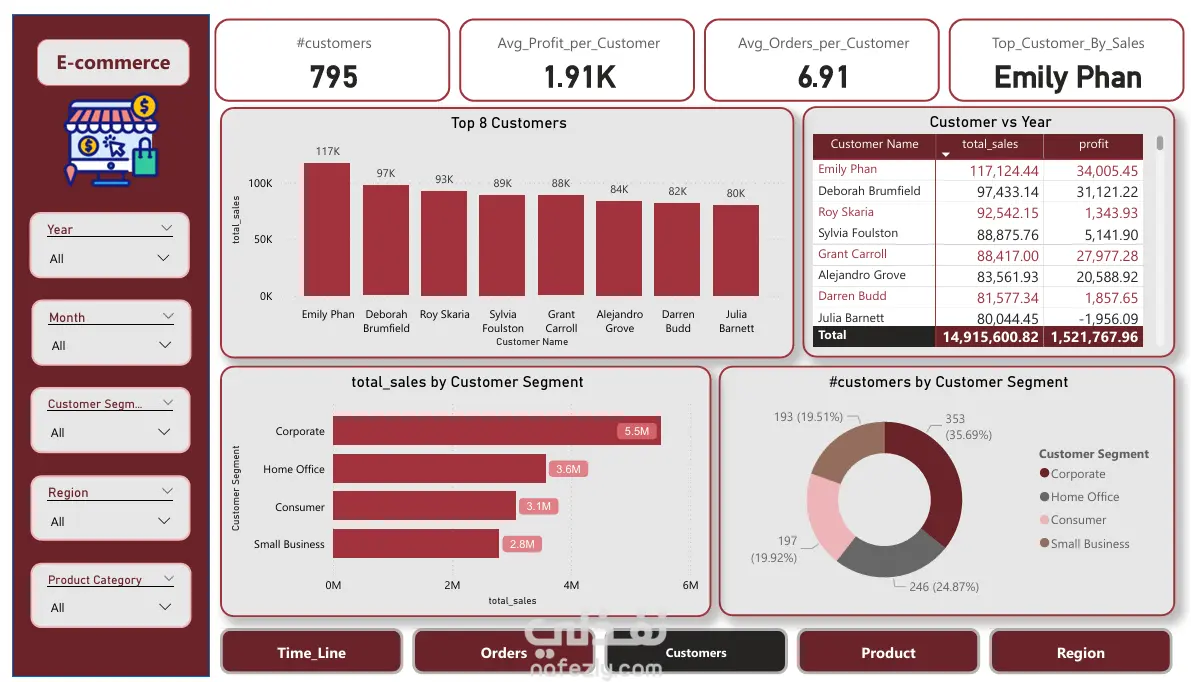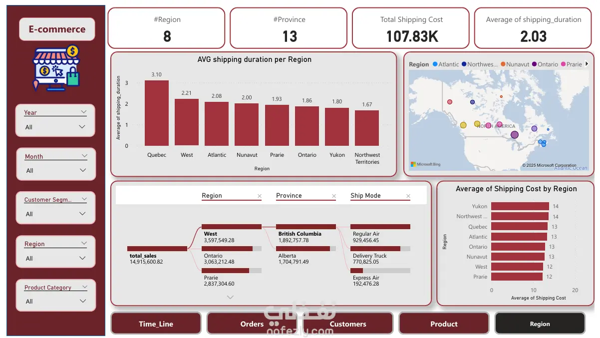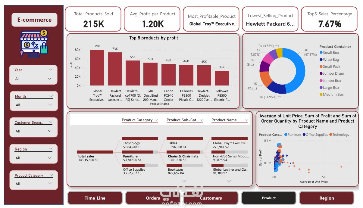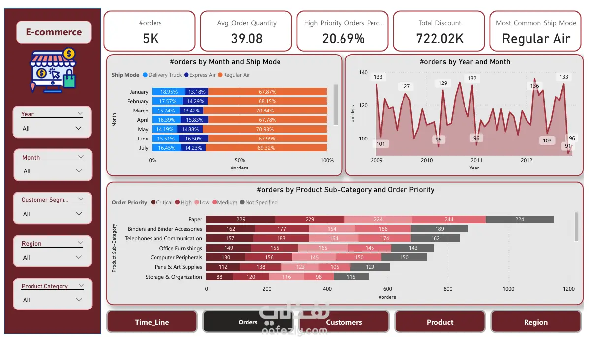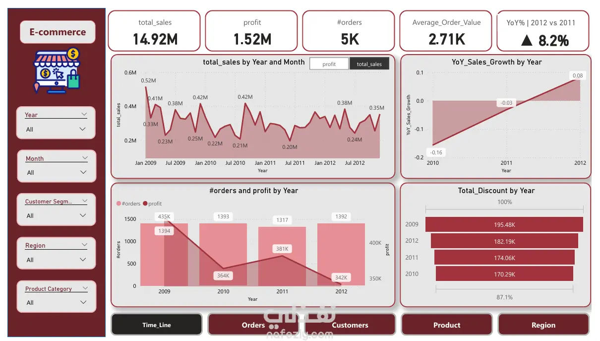 لوحة تحكم Power BI تفاعلية لتحليل مبيعات E-commerce على مدى أربع سنوات (2009–2012)، توفر رؤية شاملة للأداء عبر الطلبات، العملاء، المنتجات، والمناطق. تساعد على: تتبع مؤشرات الأداء الرئيسية (KPIs) مثل المبيعات، الربح، عدد الطلبات ومتوسط قيمة الطلب. تحليل الاتجاهات السنوية والشهرية، وأداء الفئات المختلفة للعملاء والمنتجات. دعم اتخاذ القرارات التجارية المبنية على البيانات. أهم المؤشرات: إجمالي المبيعات: 14.92 مليون دولار إجمالي الربح: 1.52 مليون دولار عدد الطلبات: 5,000 متوسط قيمة الطلب: 2.71 ألف دولار نمو المبيعات السنوي: +8.2% عدد العملاء: 795، ومتوسط الربح لكل عميل: 1.91 ألف دولار البيانات: المصدر: 4 ملفات Excel (واحد لكل سنة) الأعمدة الرئيسية: Order ID، Order Date، Order Quantity، Sales، Profit، Customer Segment، Product Category/Sub-Category، Region، Ship Mode، وغيرها عدد السجلات: ~5,000 طلب التحضير: تنظيف البيانات وربط الجداول في Power BI، وإنشاء علاقات وDAX measures مخصصة هيكل لوحة التحكم: Overview & Time Series: KPIs، المبيعات حسب السنة والشهر، الربح، الخصومات Orders Analysis: عدد الطلبات حسب فئة المنتج، الأولوية، طريقة الشحن، الشهر والسنة Customers Analysis: أفضل العملاء، المبيعات حسب الفئة، عدد العملاء لكل فئة Products Analysis: المنتجات الأكثر ربحاً، المبيعات حسب الفئة، تحليل توزيع المنتجات Regions Analysis: متوسط مدة الشحن، المبيعات حسب المنطقة، متوسط تكلفة الشحن أبرز الرؤى: أعلى عدد طلبات: سنة 2011 (1,393 طلب) أكثر الفئات مبيعاً: Technology > Furniture > Office Supplies أعلى العملاء ربحاً: Emily Phan أعلى منطقة مبيعاً: West Region طريقة الشحن الأكثر شيوعاً: Regular Air التقنيات: Power BI (Power Query, DAX, Relationships, Interactive Slicers)، تحليل تفاعلي، KPIs، لوحات زمنية وتحليلية متعددة الأبعاد.