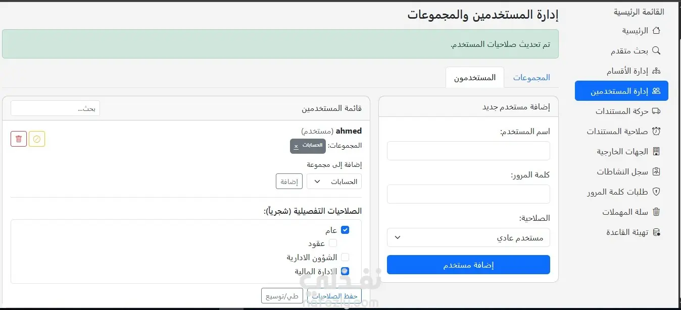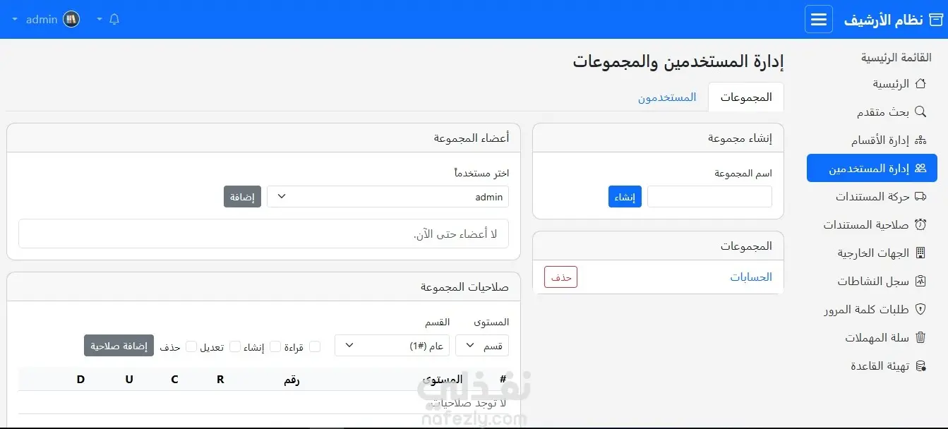 نظام صلاحيات متقدم: إدارة كاملة للمستخدمين والمجموعات مع تحديد دقيق للصلاحيات (إنشاء – قراءة – تعديل – حذف) سواء على مستوى الأقسام أو السجلات الفردية، لضمان أعلى درجات الأمان.