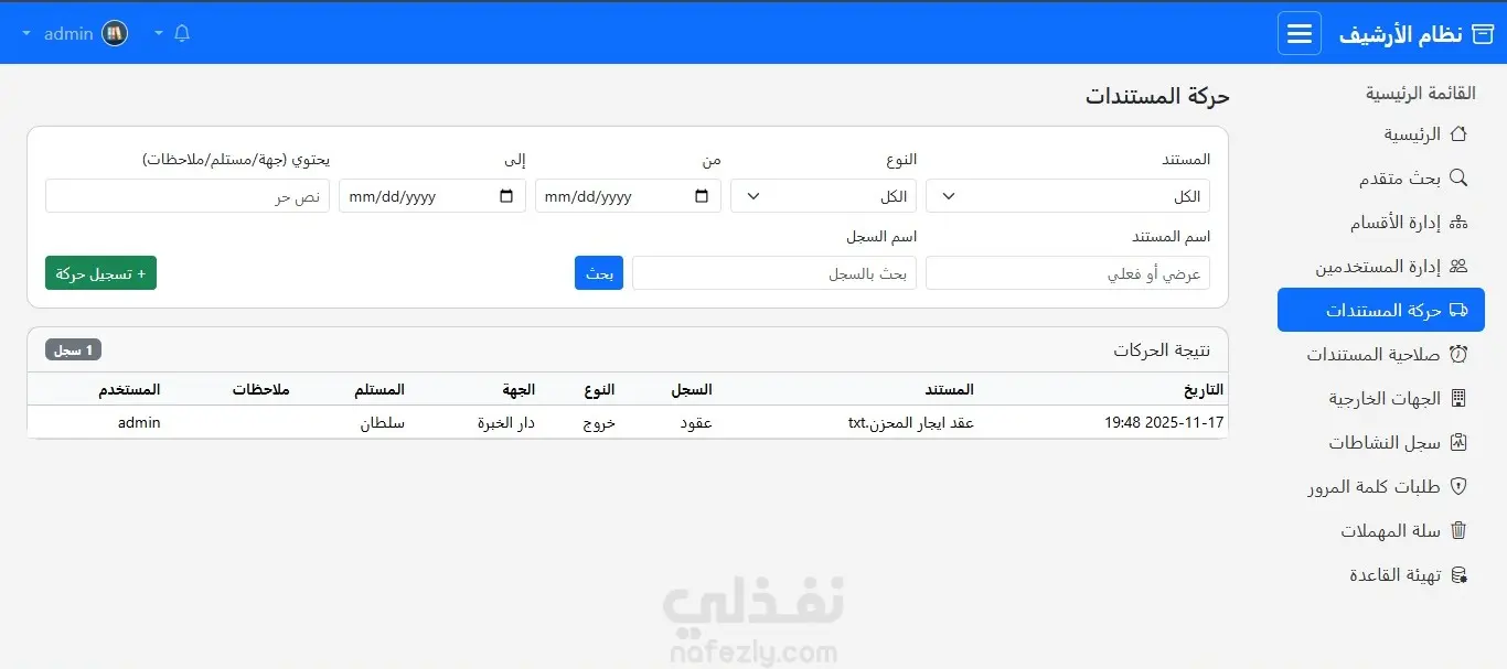 تتبع دورة حياة المستند: تسجيل جميع العمليات التي تتم على المستندات من دخول وخروج وتسليم واستلام، مع توفير سجل تاريخي كامل يوضح المسؤولين عن كل خطوة داخل أو خارج المؤسسة.