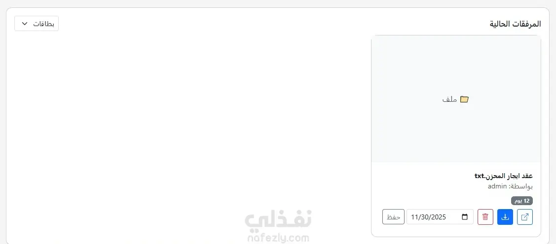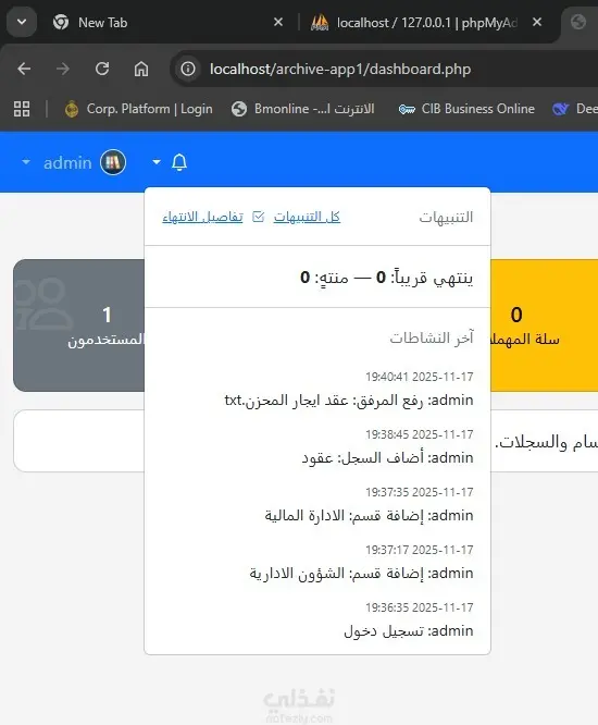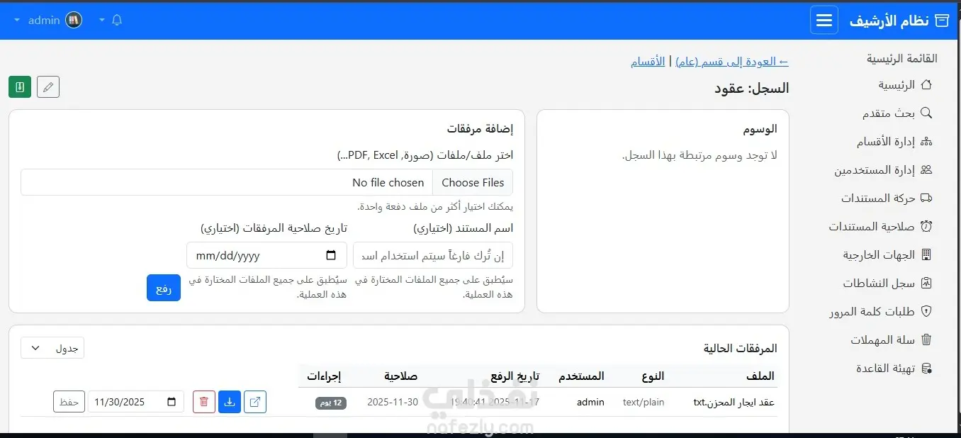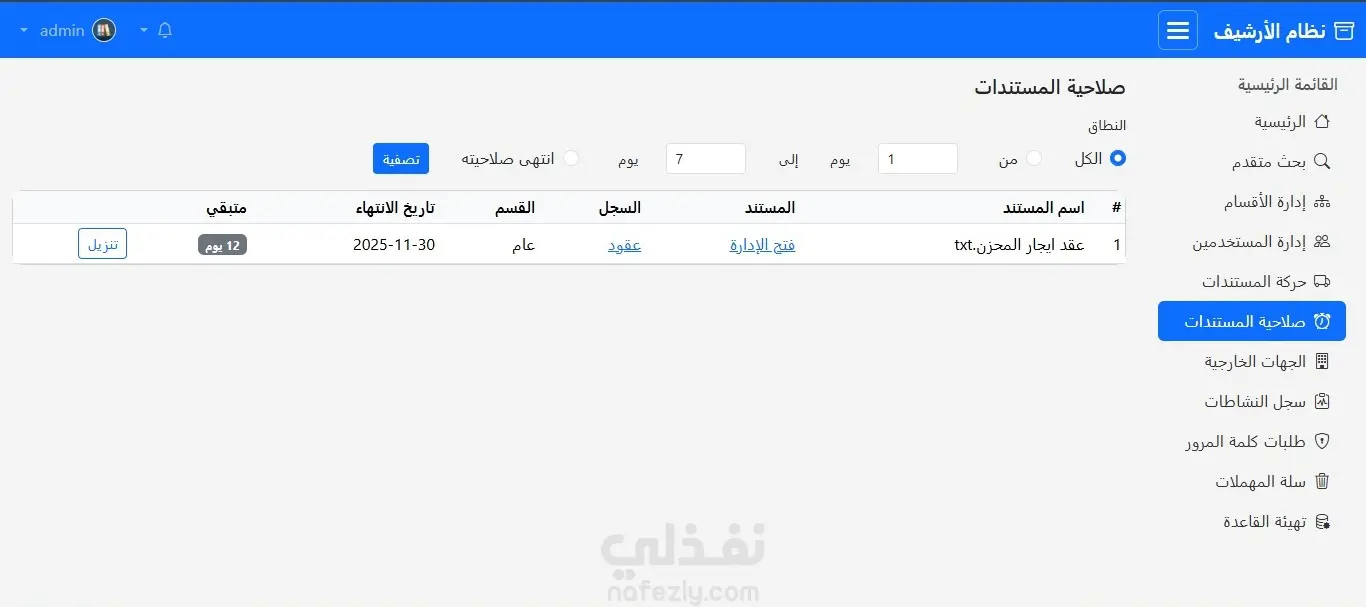 إدارة صلاحية المستندات: إمكانية تحديد تواريخ انتهاء للمستندات المهمة مثل العقود والتراخيص، مع شاشة مخصصة للتنبيهات التلقائية قبل انتهاء الصلاحية بمدة محددة.