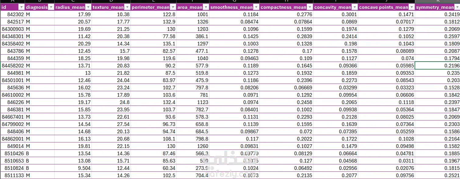 قمتُ بإدخال وتنسيق بيانات طبية خاصة بتشخيص سرطان الثدي، وتشمل البيانات مجموعة من الأعمدة مثل رقم العينة، نوع التشخيص (حميد أو خبيث)، وقياسات مختلفة للخلايا مثل نصف القطر، النسيج، المحيط، والمساحة. تم إدخال البيانات بدقة عالية داخل ملف Excel وتنظيمها في جدول منسق ليسهل استخدامه في التحليل أو النماذج العلمية.