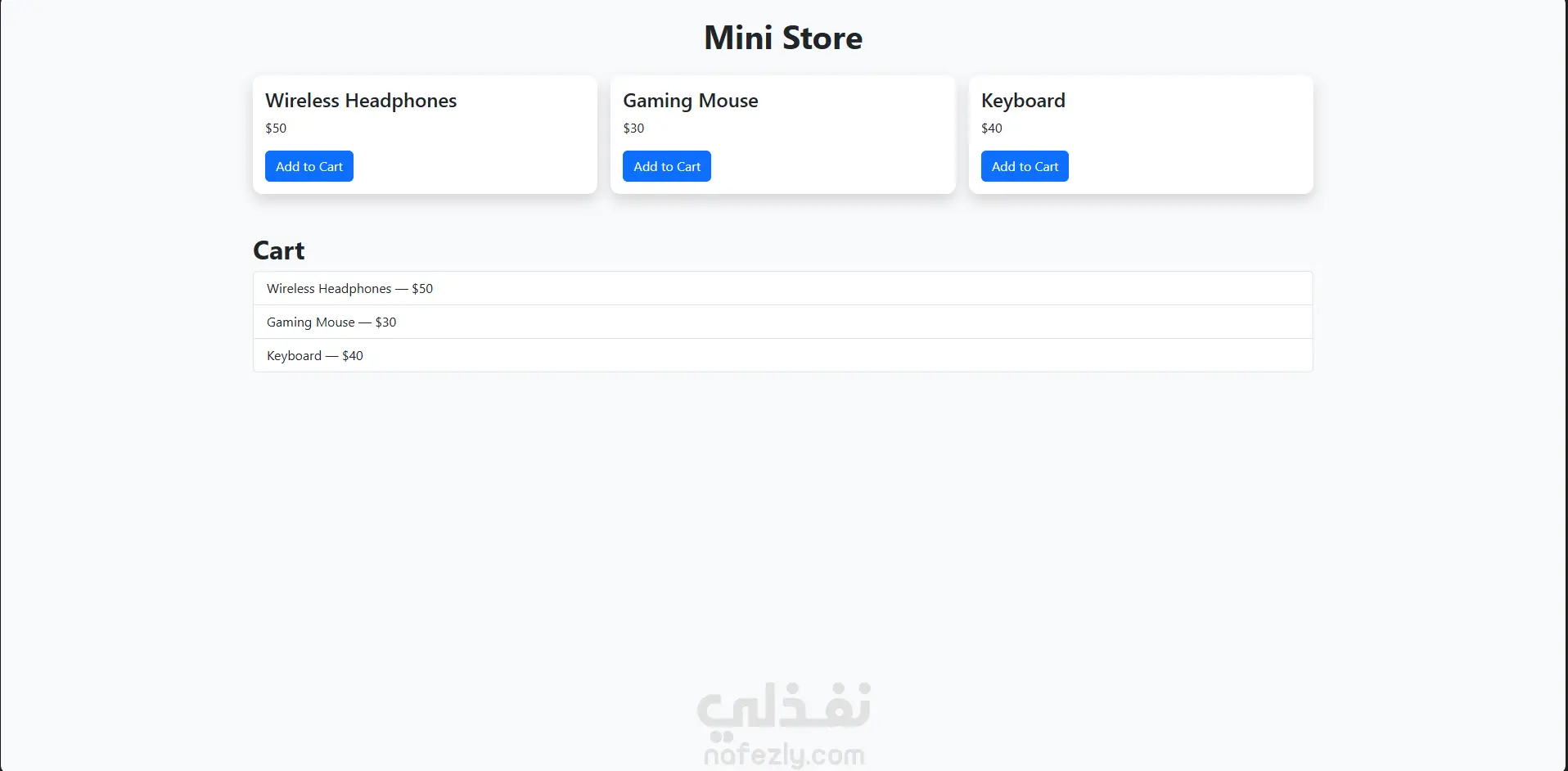 A small e-commerce interface with product cards and a simple cart system built in JavaScript.