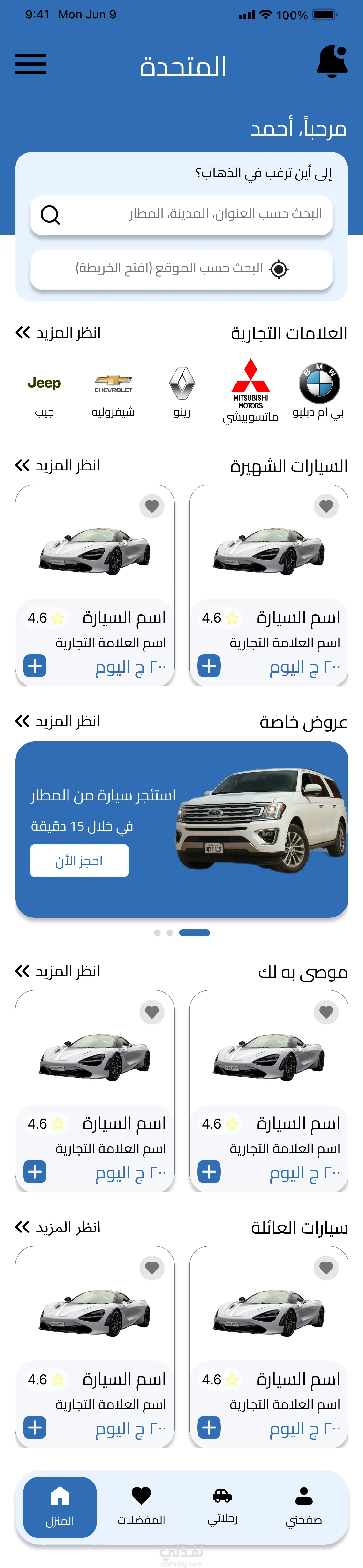 سأقوم بتصميم شاشة رئيسية مميزة واحترافية لتطبيق تأجير سيارات، مع مراعاة الهوية البصرية والألوان الخاصة بالعلامة التجارية. أضمن لك تصميمًا بسيطًا، واضحًا، وسهل الاستخدام، مع اهتمام كامل بتجربة المستخدم.