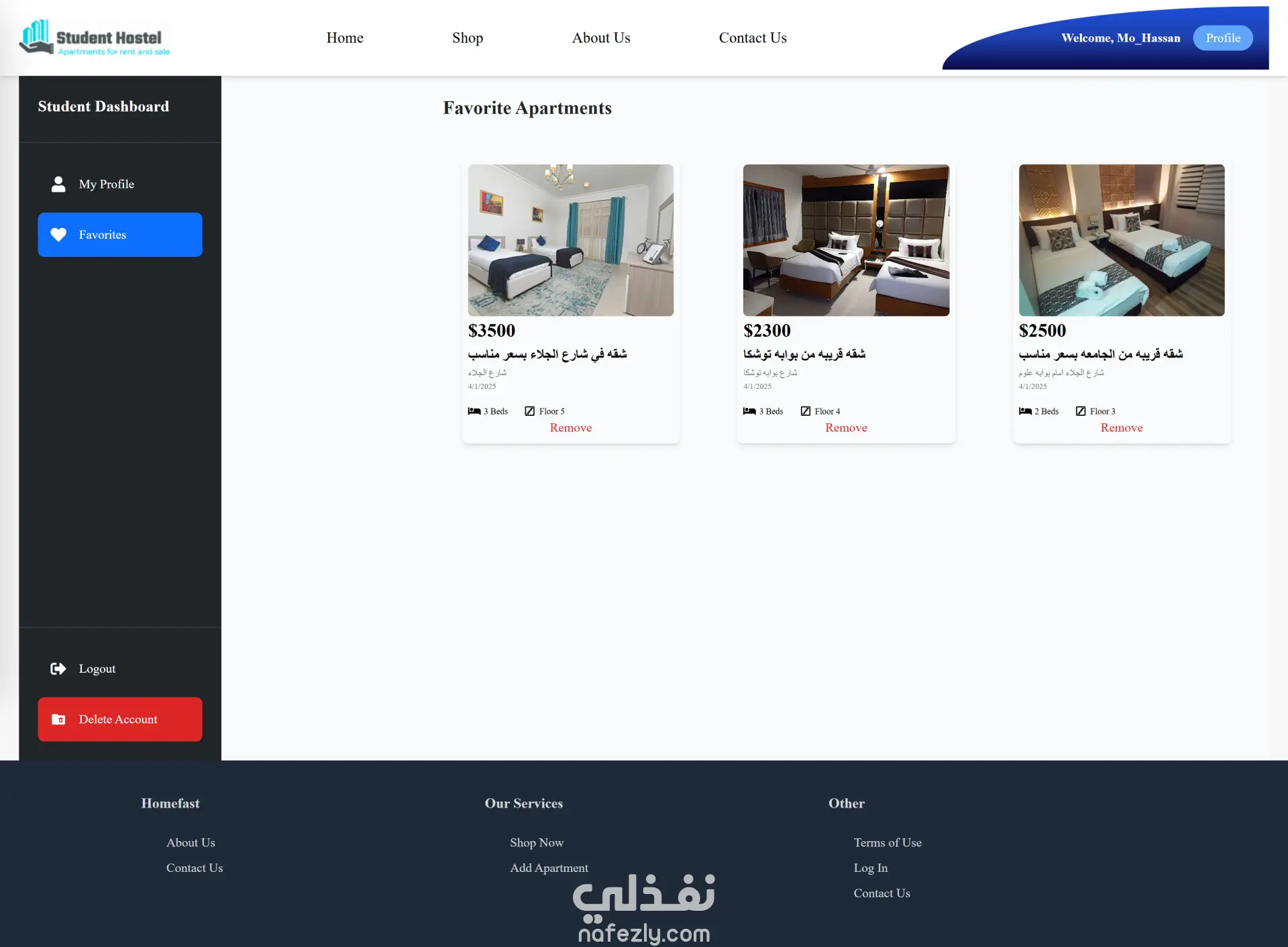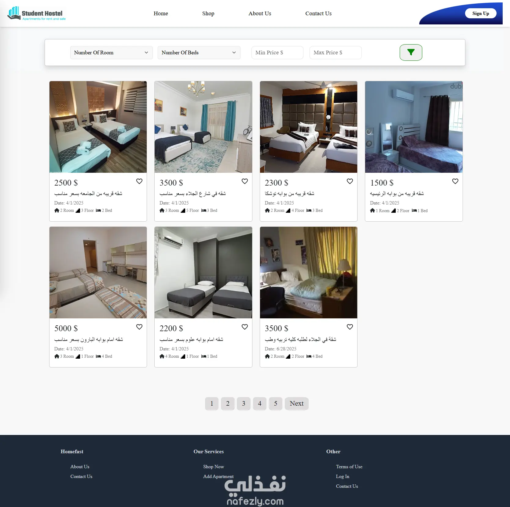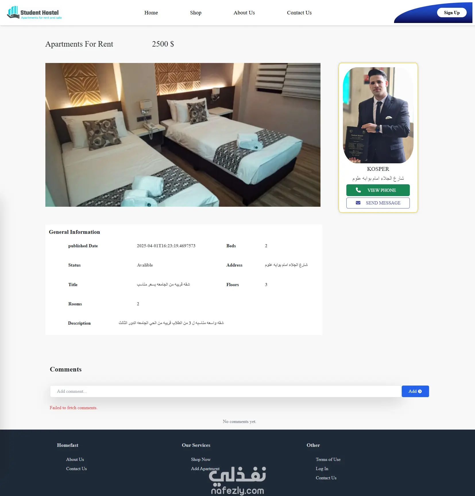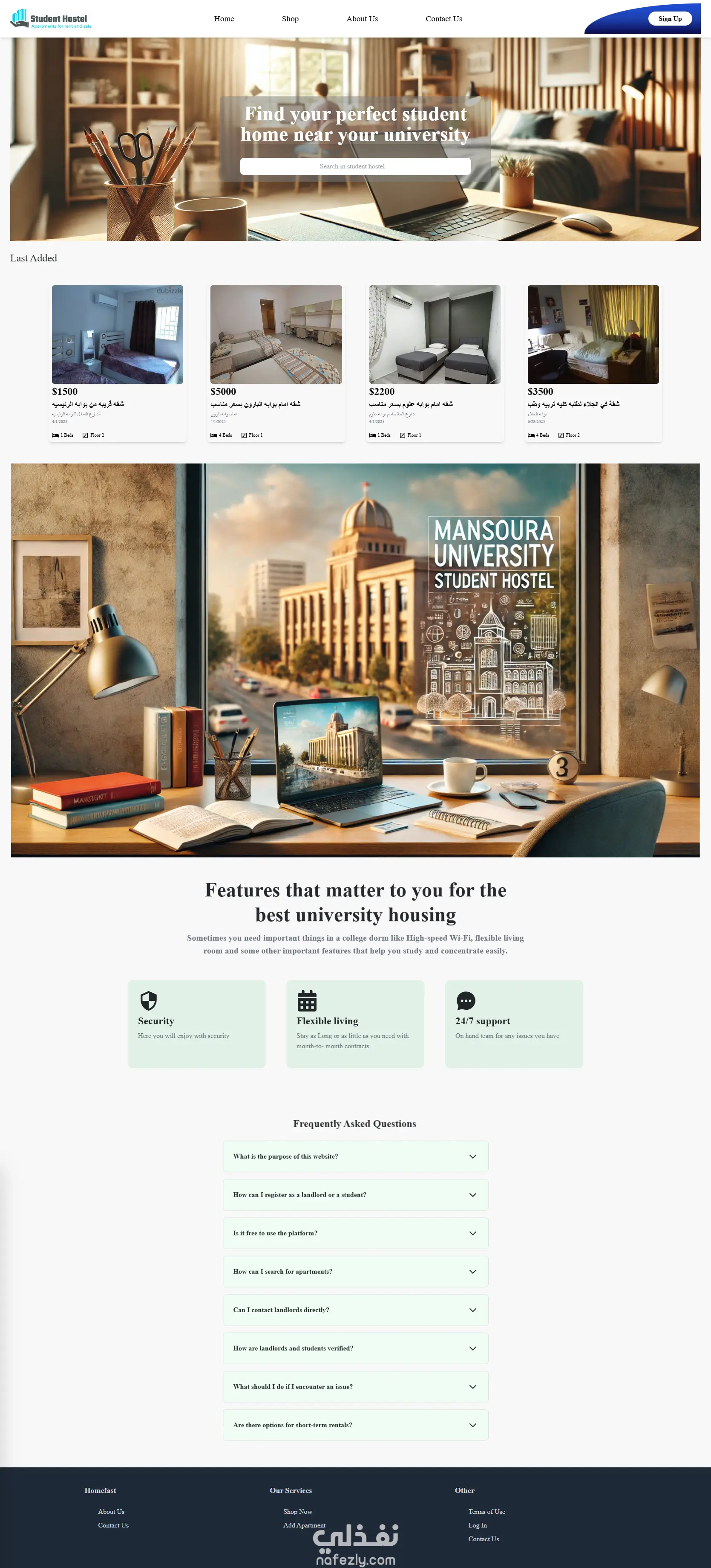 هو موقع ويب تفاعلي مصمم خصيصًا لربط الطلاب الجامعيين بأصحاب الشقق أو الغرف المتاحة للإيجار، بهدف تسهيل عملية البحث والحجز والتواصل بين الطرفين. الأطراف المستهدفة 1- التاجر (صاحب الشقة أو العقار) - يقوم بإنشاء حساب خاص به على الموقع. - يحصل على بروفايل شخصي يمكنه من عرض معلوماته وصوره. - يمتلك لوحة تحكم (Dashboard) لإدارة الإعلانات الخاصة بالشقق (إضافة، تعديل، حذف). - يضيف تفاصيل كل شقة مثل: الصور، الموقع، السعر، وصف المميزات، ورقم الهاتف للتواصل المباشر. 2- (الطالب) - يمكنه التسجيل والدخول إلى حسابه الخاص. - تصفح قائمة الشقق المتاحة بناءً على الموقع أو السعر أو المواصفات. - إمكانية إضافة الشقة إلى المفضلة أو عمل "إعجاب" للعروض التي تهمه. - التواصل مع التاجر مباشرة من خلال معلومات الاتصال المتاحة أو رقم الهاتف المرفق بالإعلان. "المميزات الرئيسية للموقع" •تصميم متجاوب يعمل بكفاءة على جميع الأجهزة (كمبيوتر، تابلت، موبايل). •صفحة رئيسية تعرض أحدث العروض وأكثرها تفاعلاً. •بحث متقدم لتصفية النتائج حسب الموقع، السعر، وعدد الغرف. •نظام مفضلة للطلاب لحفظ الشقق التي أعجبتهم لزيارتها لاحقًا. •لوحة تحكم للتاجر لإدارة العقارات بسهولة. •ملفات شخصية لكل مستخدم (تاجر أو طالب). •تحسين تجربة المستخدم وسهولة التصفح.