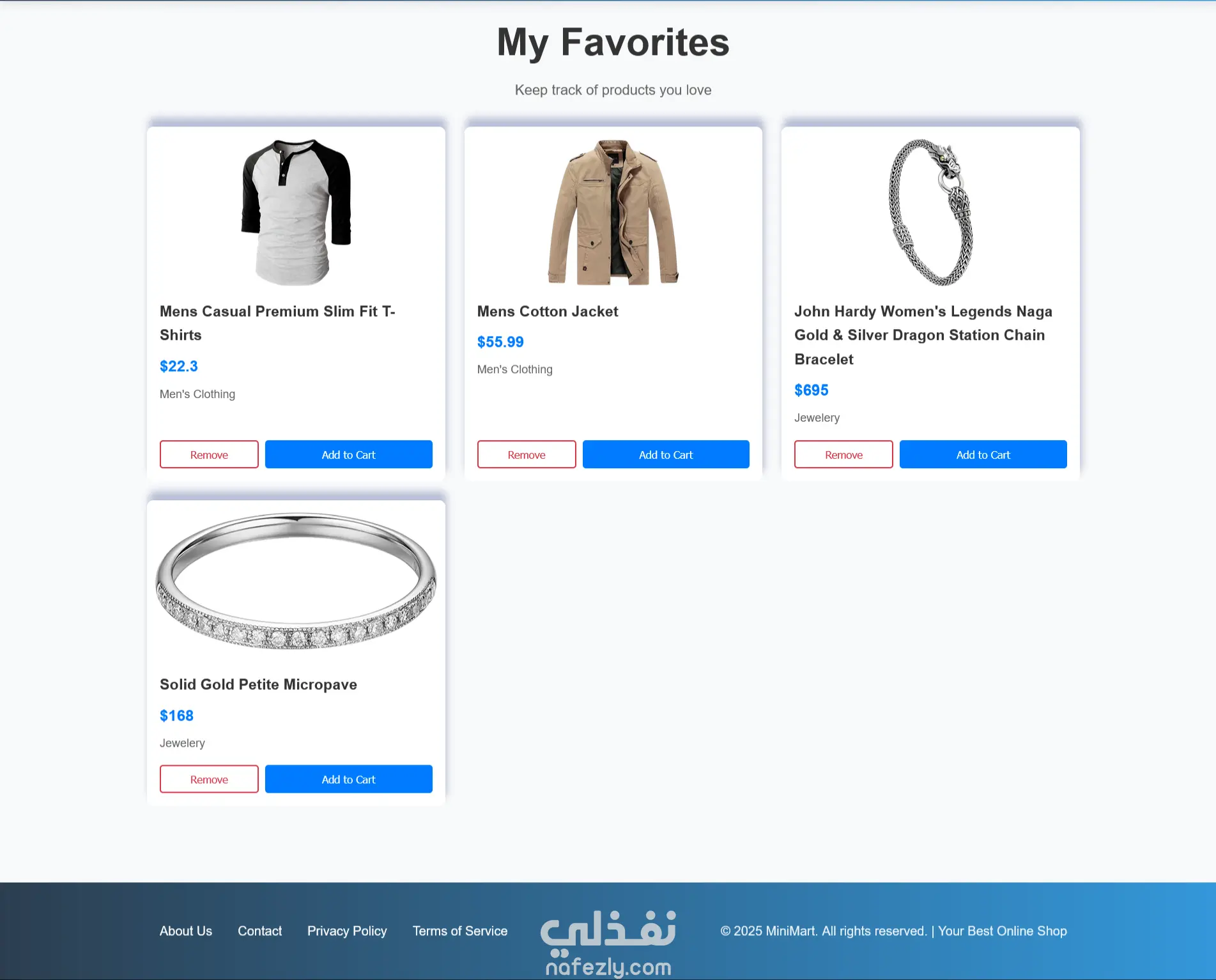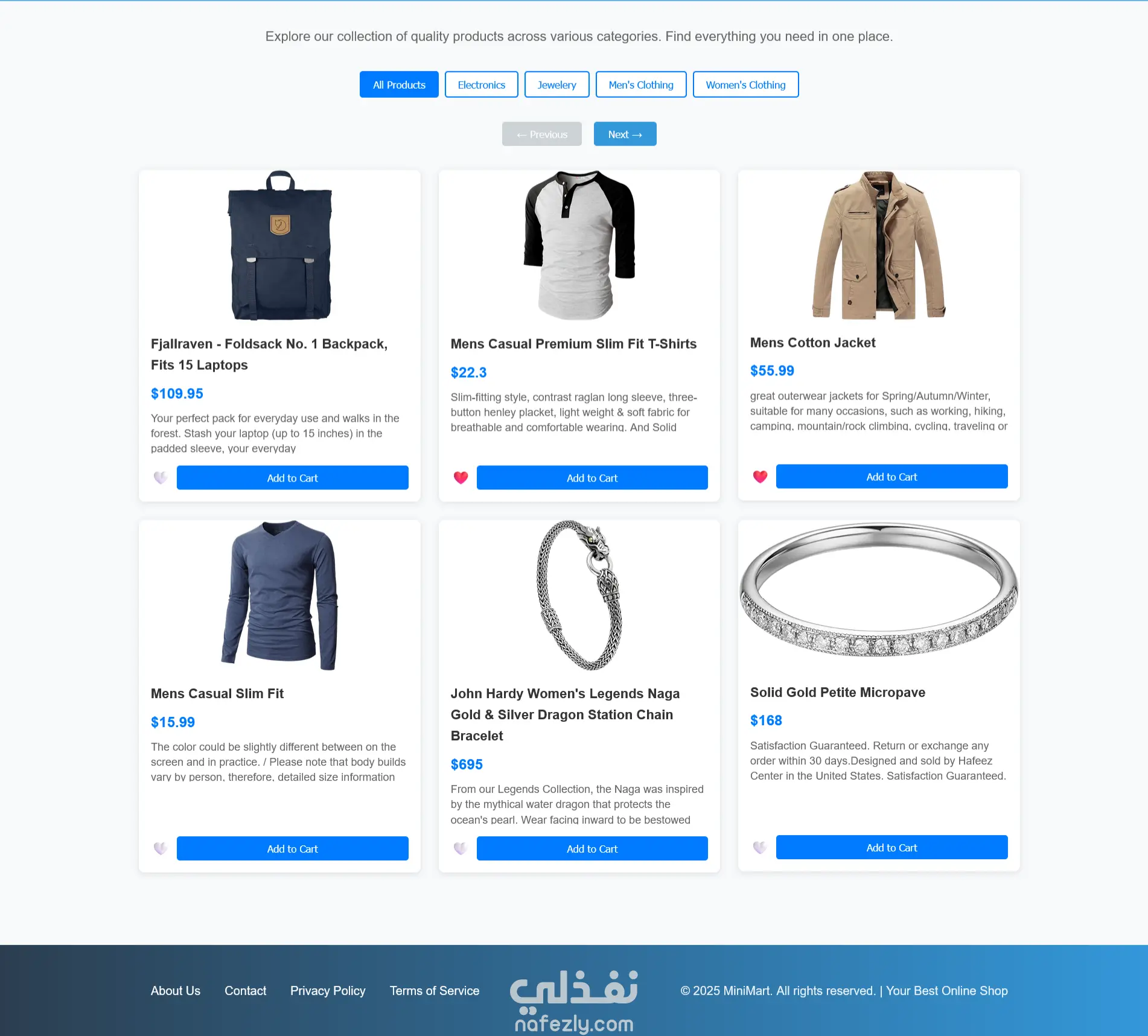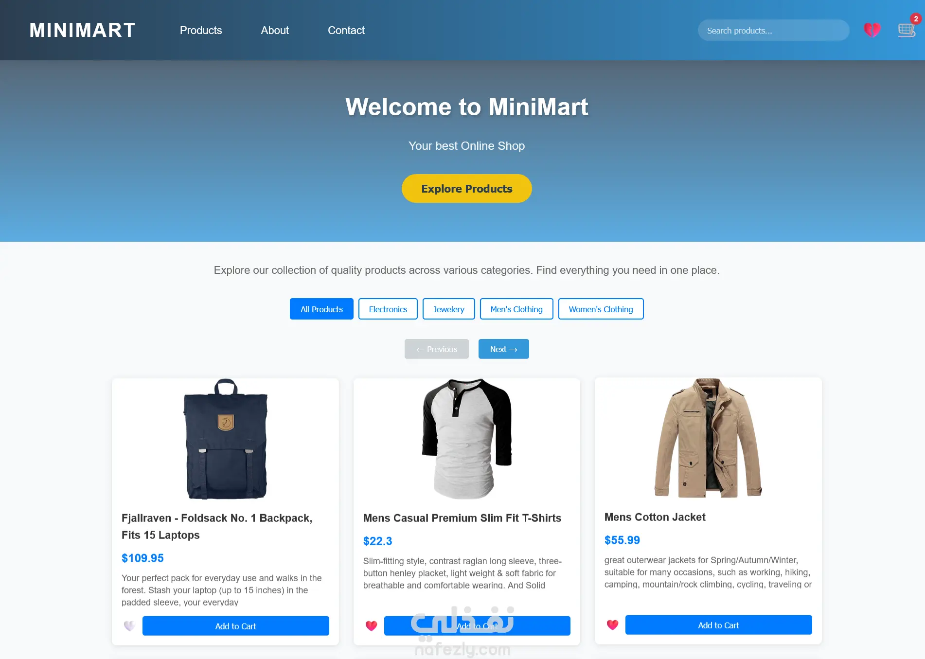 يوفّر MiniMart تجربة تسوّق بديهية وممتعة للمستخدم، مشابهة لتجربة المتاجر الإلكترونية الحديثة. ويُبرز كيف يمكن بناء واجهة أمامية متكاملة.