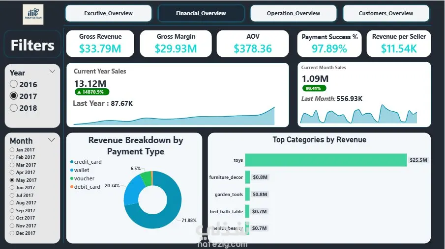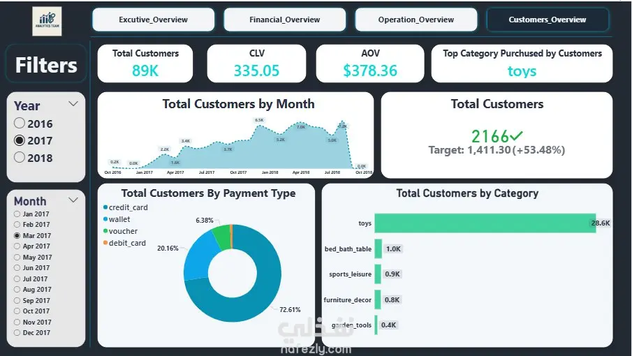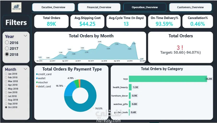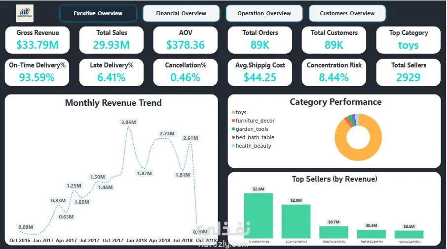 نبذة عن المشروع: يهدف هذا المشروع إلى بناء حل متكامل لذكاء الأعمال (Business Intelligence) لمتجر تجارة إلكترونية، حيث يقوم بتحويل البيانات الخام الخاصة بالمعاملات إلى لوحات معلومات تفاعلية وغنية بالرؤى. يغطي النظام كافة الجوانب الحيوية للشركة بدءاً من الأداء المالي والتشغيلي وصولاً إلى تحليل سلوك العملاء، مما يمكن الإدارة من اتخاذ قرارات استراتيجية مبنية على البيانات. المنهجية التقنية: تم تنفيذ المشروع عبر مراحل متسلسلة لضمان دقة البيانات: معالجة البيانات (ETL): استخدام استعلامات SQL لاستخراج البيانات وتنظيفها ومعالجة القيم المفقودة (Nulls). نمذجة البيانات (Data Modeling): بناء نموذج "Star Schema" لربط جدول الحقائق (Fact Table) بجداول الأبعاد (Dimensions) لضمان كفاءة التحليل. حساب المؤشرات (DAX): كتابة معادلات دقيقة لحساب مؤشرات الأداء الرئيسية ومقارنات النمو الزمني. مكونات اللوحة (Dashboard Sections): تم تقسيم لوحة المعلومات إلى أربعة أقسام رئيسية لخدمة مختلف الإدارات: 1. النظرة العامة للتنفيذيين (Executive Overview): توفر نظرة شمولية "طائر المحلق" (Bird's-eye view) لصناع القرار. أبرز المؤشرات: إجمالي الإيرادات ($33.79M)، متوسط قيمة الطلب (AOV)، ونسبة الالتزام بمواعيد التسليم (93.59%). التحليلات: تتبع اتجاهات الإيرادات الشهرية (Trend Analysis) لتحديد المواسم القوية، بالإضافة إلى تصنيف أفضل البائعين والفئات (مثل الألعاب "Toys") من حيث الإيرادات. 2. النظرة العامة المالية (Financial Overview): تركز بعمق على الربحية والنمو المالي. المقارنات الزمنية: مقارنة المبيعات الحالية بالعام السابق (YoY) وبالمبيعات الشهرية السابقة لتحديد نسب النمو. تحليل الإيرادات: توزيع الإيرادات حسب طرق الدفع (حيث تسيطر بطاقات الائتمان بنسبة 73%) وحسب فئات المنتجات، مع متابعة مؤشر "نجاح الدفع" (Payment Success %). 3. النظرة العامة للعمليات (Operation Overview): تهدف إلى رصد كفاءة سلسلة التوريد والخدمات اللوجستية. كفاءة التوصيل: تتبع متوسط وقت الدورة (Cycle Time) البالغ 12 يوماً، ومتوسط تكلفة الشحن، ونسب الإلغاء. تحقيق الأهداف: مقارنة عدد الطلبات الفعلية بالأهداف الشهرية المخطط لها (Targets) لتحديد الفجوات في الأداء التشغيلي. 4. النظرة العامة للعملاء (Customers Overview): تحلل قاعدة العملاء لفهم سلوكهم وقيمتهم. قيمة العميل: التركيز على القيمة الدائمة للعميل (CLV) ومتوسط السلة الشرائية. النمو: رسم بياني يوضح تطور قاعدة العملاء عبر السنوات والشهور، مع تحليل تفضيلاتهم الشرائية حسب الفئة وطريقة الدفع. المميزات التفاعلية: تم تزويد اللوحة بقائمة جانبية (Slicer Panel) تتيح للمستخدم تصفية البيانات حسب السنة والشهر، مما يجعل التقارير ديناميكية وقابلة للتخصيص لتلبية احتياجات التحليل الدقيق.