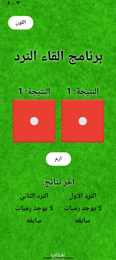 تطبيق رمي النرد مُطوّر باستخدام Kotlin وXML على Android Studio. الميزات: - رمي نردين في آنٍ واحد - تغيير لون النرد ديناميكيًا (أحمر، أسود، أزرق، أخضر) - عرض النتيجة السابقة - يعمل في الوضعين الرأسي والأفقي - يدعم اللغتين الإنجليزية والعربية