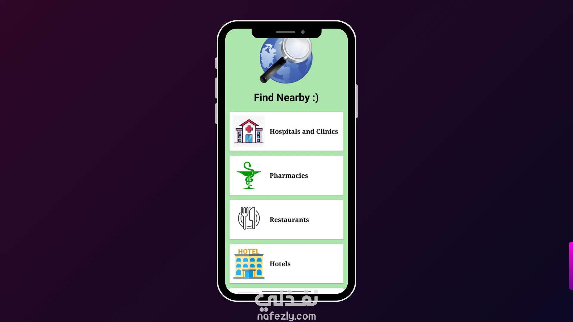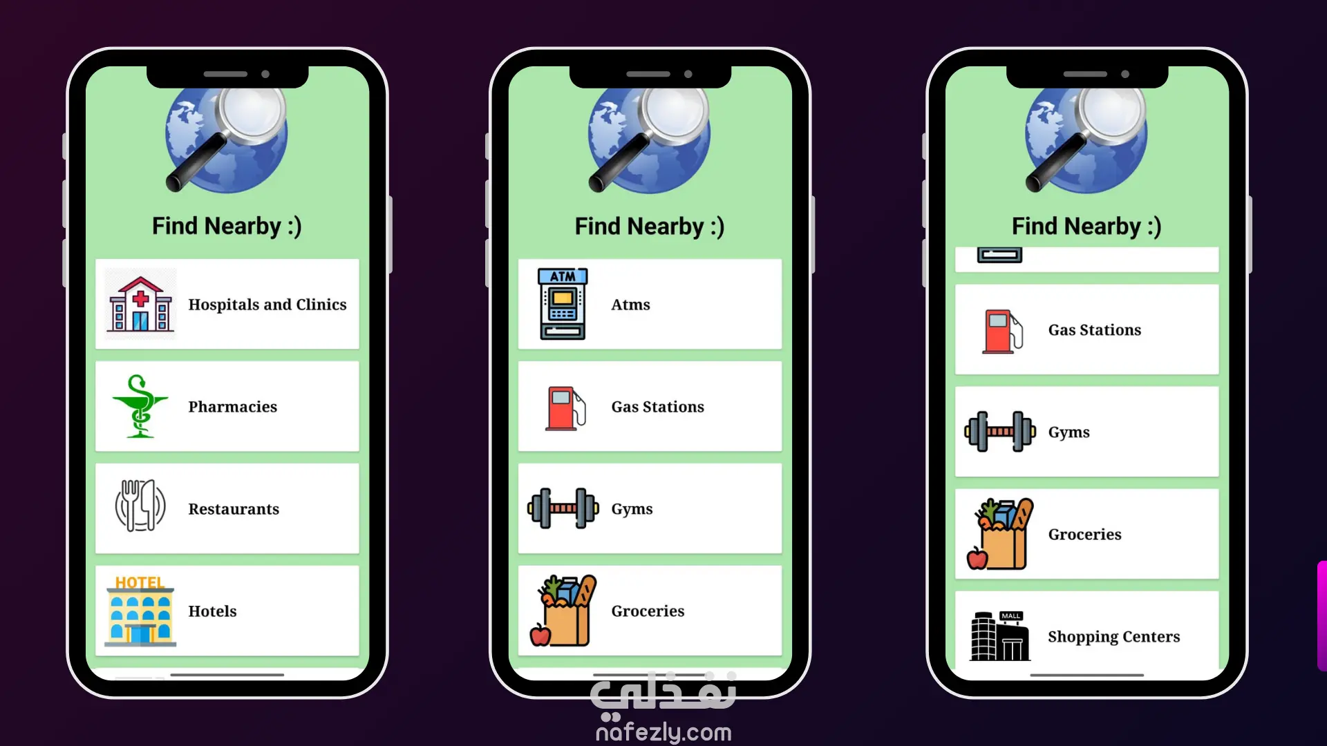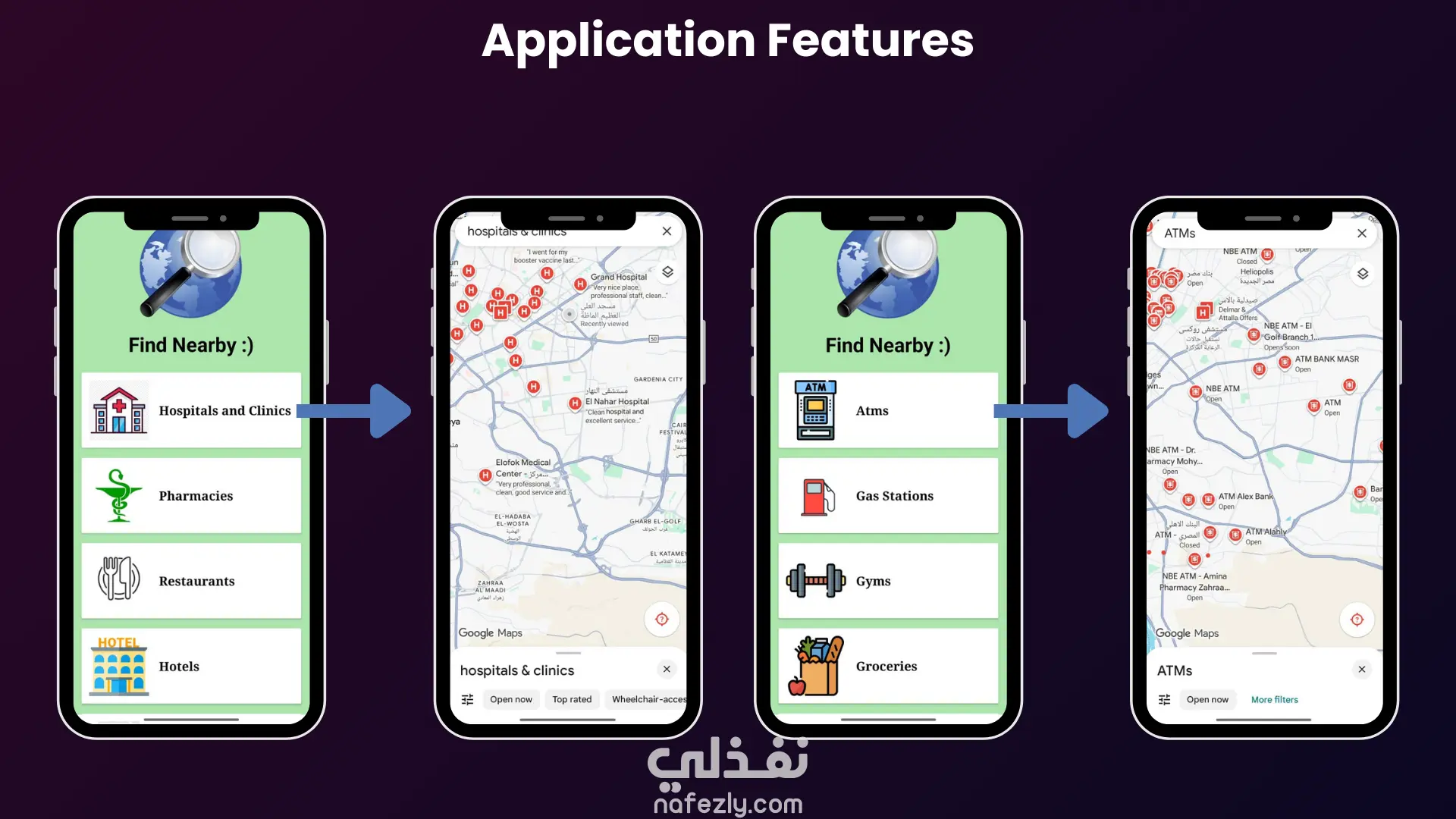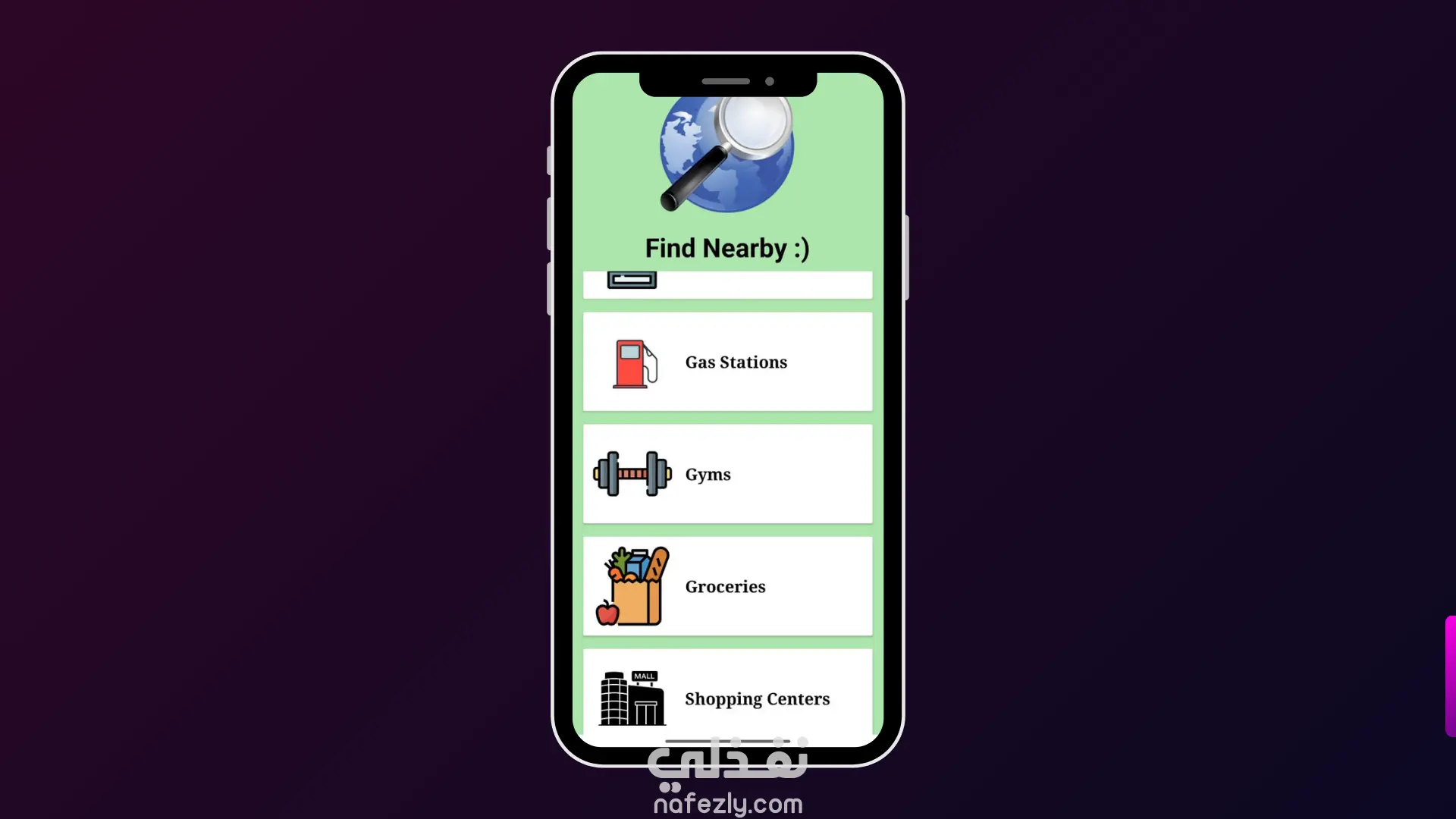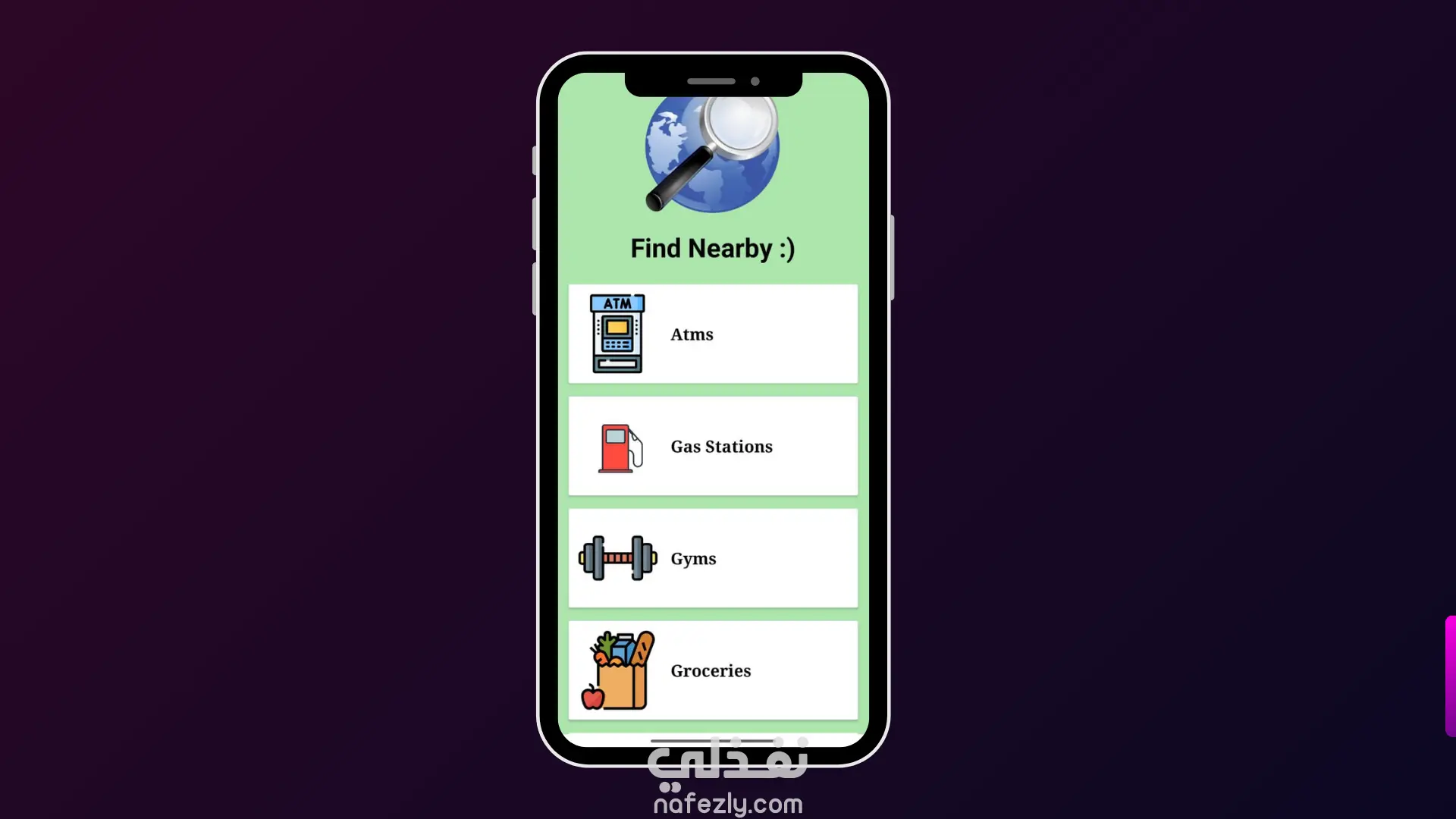 يُستخدم هذا التطبيق لتسهيل العثور على أقرب مكان تحتاجه على خرائط جوجل. يدعم التطبيق اللغتين العربية والإنجليزية. طُوّر باستخدام Kotlin وXML على أندرويد ستوديو.