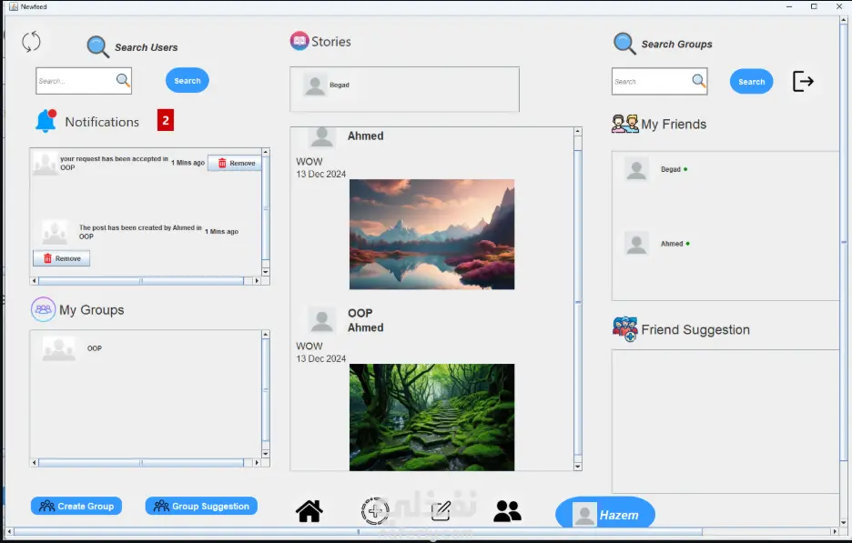 يُعد ConnectHub منصة تواصل اجتماعي تعاونية صُممت لتقريب المسافات وبناء علاقات هادفة، حيث تتيح للمستخدمين تجربة تفاعلية متكاملة تبدأ من التسجيل الآمن للوصول إلى "آخر الأخبار" ومشاركة المنشورات والقصص اليومية. يتميز المشروع بتوفير "مركز للأصدقاء" لإدارة طلبات الصداقة والحظر، إلى جانب إمكانيات إنشاء المجموعات، والبحث المتقدم، ونظام إشعارات فوري. وقد تكاتفت جهود فريق التطوير الرباعي (أحمد سعيد، حازم بركات، أدهم زكريا، وبيجاد محمد) لإنجاز هذا العمل، حيث توزعت مهامهم بين تطوير أنظمة المصادقة، وإدارة المحتوى والملفات الشخصية، وهيكلة المجموعات والبحث، مع تعاونهم جميعاً في دمج الواجهات الأمامية لضمان تجربة مستخدم سلسة وبديهية.