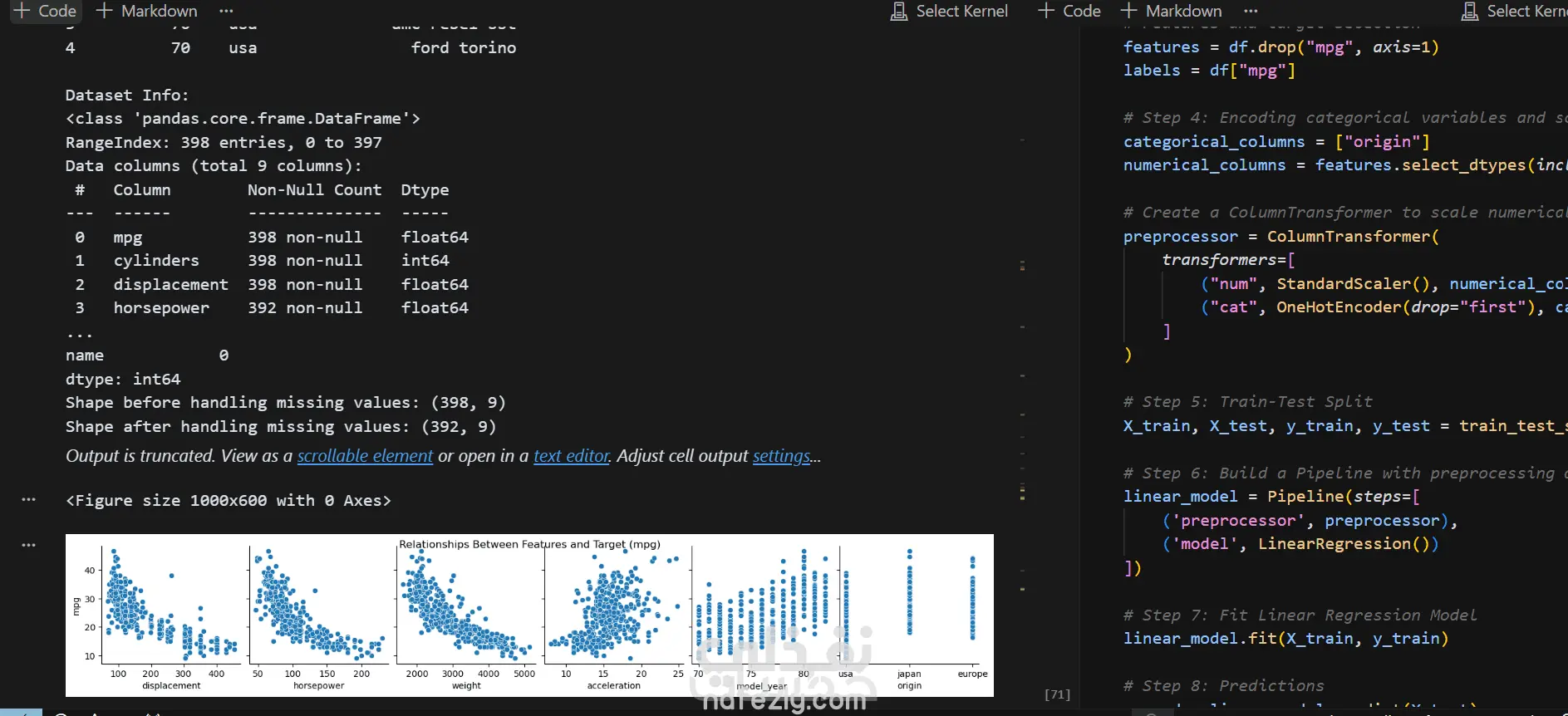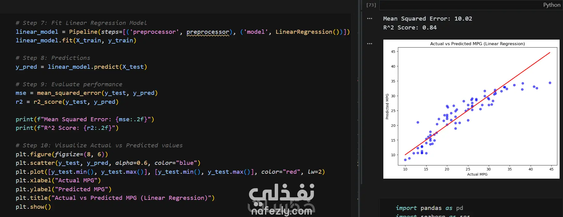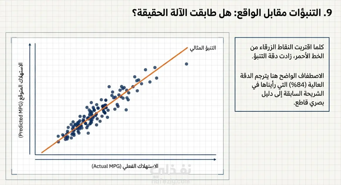 بناء نماذج تعلم آلي وتطبيقات الانحدار (Regression). نموذج تنبؤي مُصمم خصيصاً لتوقع كفاءة استهلاك الوقود للسيارات (MPG - Miles Per Gallon) بناءً على خصائصها الفيزيائية والتقنية (مثل قوة المحرك، الوزن، عدد الاسطوانات، وأصل التصنيع). يساعد هذا النموذج المهندسين وصناع القرار في فهم كيف تؤثر هذه العوامل على كفاءة الطاقة. الإنجازات والمنهجية: 1. معالجة البيانات المتقدمة:استخدام تقنيات متطورة مثل بناء خط أنابيب (Pipeline)لتوحيد خطوات معالجة البيانات (الـ Scaling للمتغيرات الرقمية والـ Encoding للمتغيرات الفئوية). > 2. أداء النموذج:بناء نموذج الانحدار الخطي وتحقيق كفاءة عالية جداً في التنبؤ، حيث بلغت قيمة $R^2$ Score أكثر من 0.84، وهو ما يثبت موثوقية النموذج وفعاليته في التفسير. 3. التوثيق والتحقق: تقديم رسوم بيانية واضحة للمقارنة بين القيم المتوقعة والقيم الفعلية (Actual vs Predicted)، مما يؤكد دقة التنبؤ. الأدوات المستخدمة: Python، مكتبات Scikit-learn، Pandas، Matplotlib.