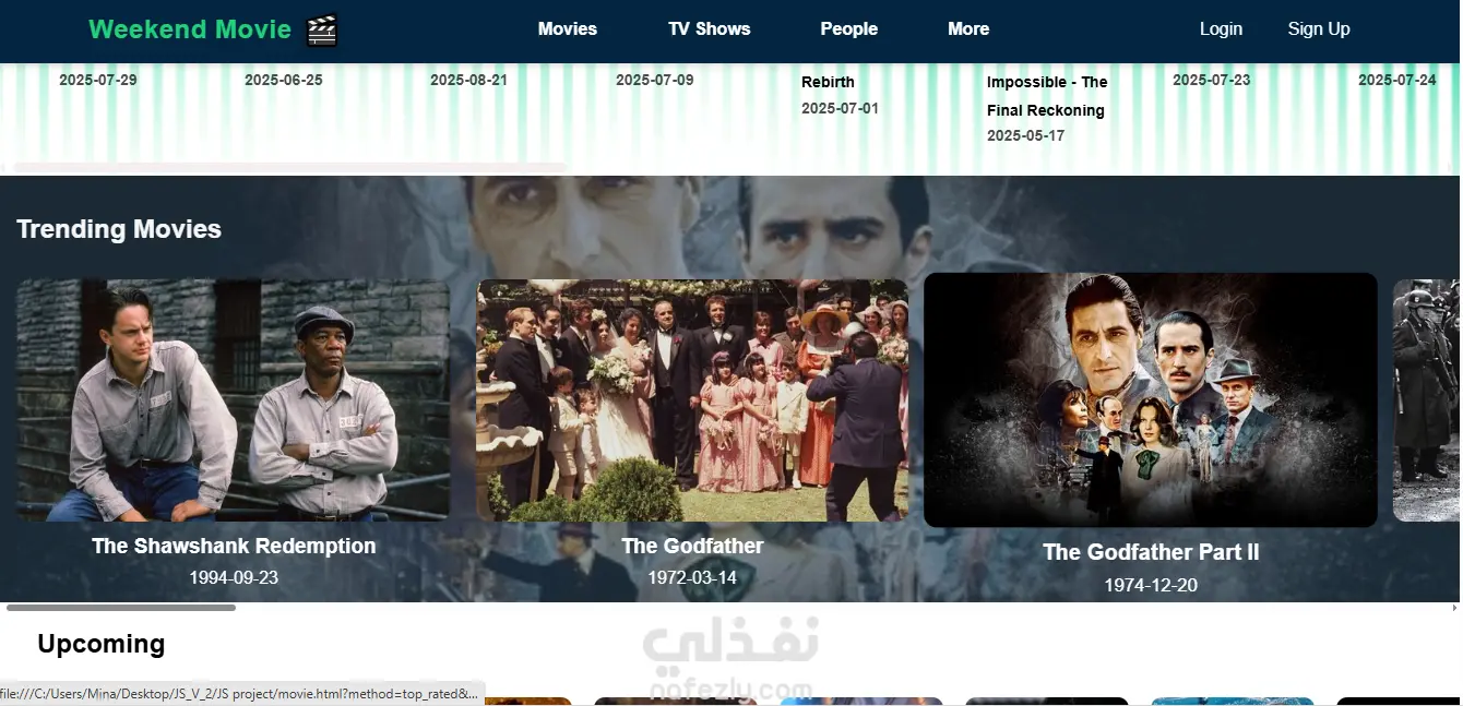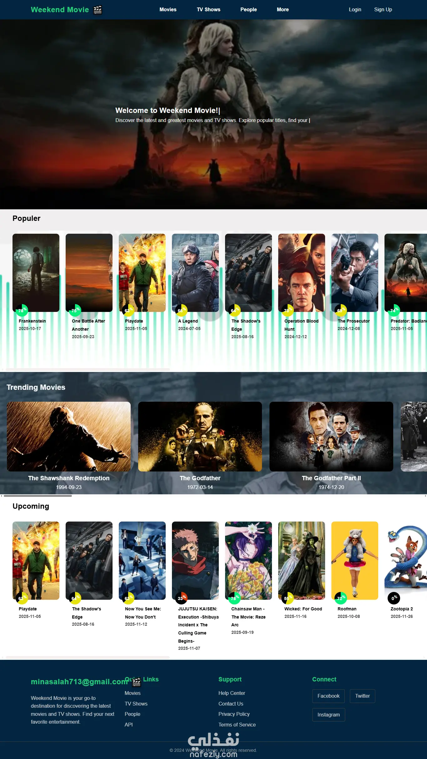 مشروع موقع أفلام ديناميكي — تصفح، بحث، ومراجعات الأفلام (TMDB Clone) أقدّم لك مشروع موقع ويب للأفلام متكامل وجاهز للعمل، مصمم ليقدّم تجربة سينمائية رائعة على الإنترنت. الموقع يسمح للمستخدمين بتصفح الأفلام، البحث المتقدم، اكتشاف الأفلام الجديدة والشهيرة، ومشاهدة التفاصيل الكاملة لكل فيلم بسهولة وسلاسة. النسخة التي أقدّمها جاهزة للنشر على أي سيرفر، ويمكن ربطها بأي API (مثل TMDB API) أو Backend مخصص، مع تصميم متجاوب يعمل على الموبايل، التابلت، والكمبيوتر. 🎯 الميزات الأساسية للموقع: تصفح الأفلام حسب: الأكثر شهرة، الأعلى تقييمًا، القادمة قريبًا، والآن في السينما بحث متقدم وتصنيف حسب العنوان، النوع، أو التقييم صفحة تفاصيل الفيلم تشمل: ملصقات، الممثلين، التقييمات، المراجعات، والعروض الدعائية (Trailers) واجهة مودرن ومتجاوبة بالكامل لجميع الأجهزة إمكانية إضافة الأفلام إلى المفضلة أو قائمة المشاهدة الشخصية (في حال تفعيل الحسابات) أداء سريع وتجربة مستخدم سلسة مع تصميم نظيف وواضح 💻 التقنيات المستخدمة: HTML, CSS, JavaScript (أو React/Vue حسب النسخة) TMDB API أو Backend مخصص تصميم واجهة حديثة متجاوبة مع كل الشاشات دعم التحديثات الحية للبيانات والمراجعات 🛠️ ما الذي ستستلمه عند شراء الخدمة؟ مشروع موقع ويب كامل جاهز للتشغيل واجهة مستخدم نظيفة وحديثة ربط بيانات ديناميكي مع TMDB أو Backend خاص صفحات تصفح، بحث، تفاصيل فيلم، ومراجعات دعم لإضافة قوائم المفضلة وقوائم المشاهدة إعداد كامل للتشغيل على سيرفر أو localhost 💡 مناسب لمن؟ من يريد إطلاق موقع أو تطبيق للأفلام بسرعة مطورين يريدون نسخة جاهزة للتعديل والتطوير الطلاب أو الشركات الناشئة المهتمة بعرض محتوى سينمائي 📦 اطلب الخدمة الآن واحصل على موقع أفلام جاهز للإطلاق مع تجربة مستخدم سلسة!