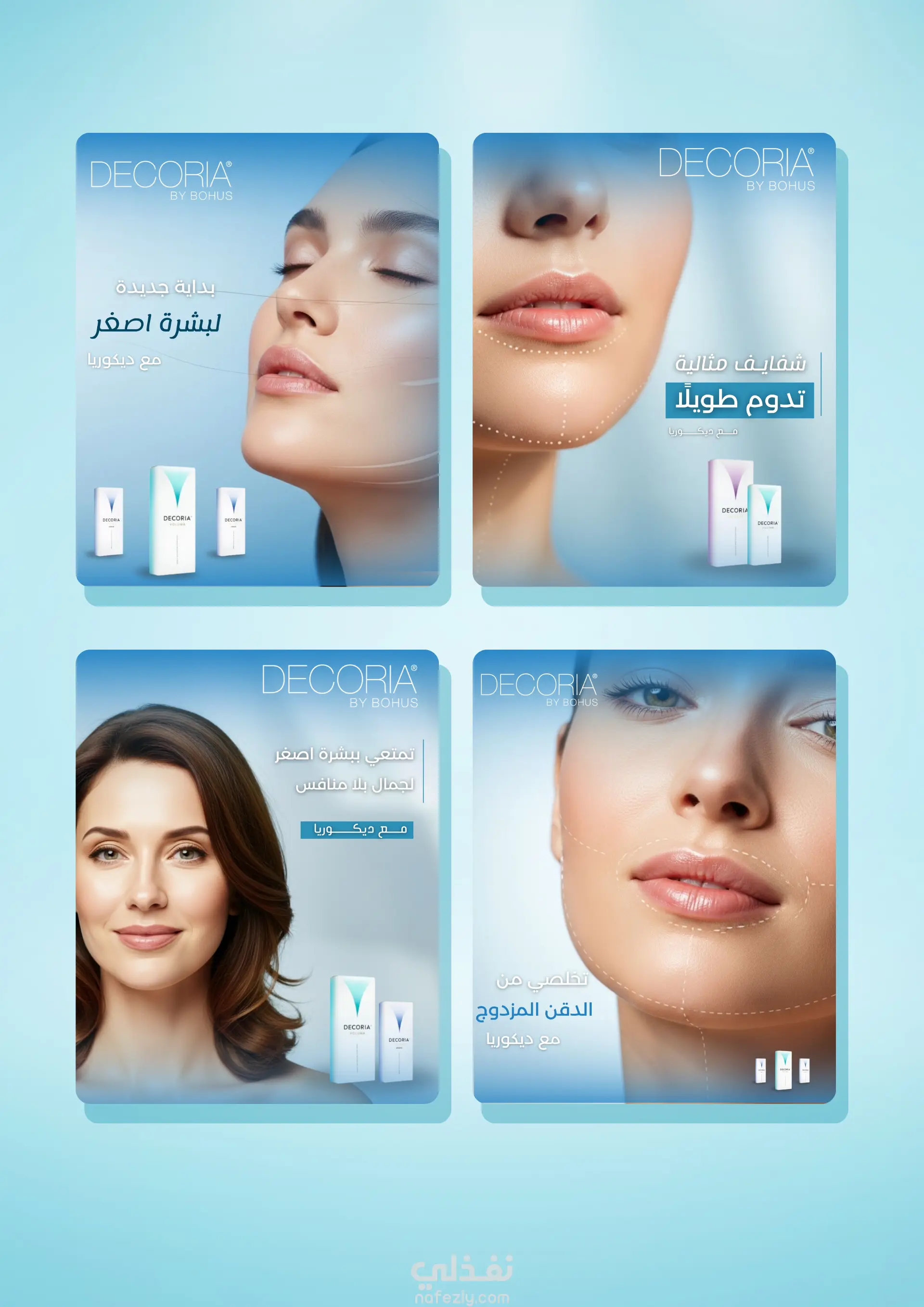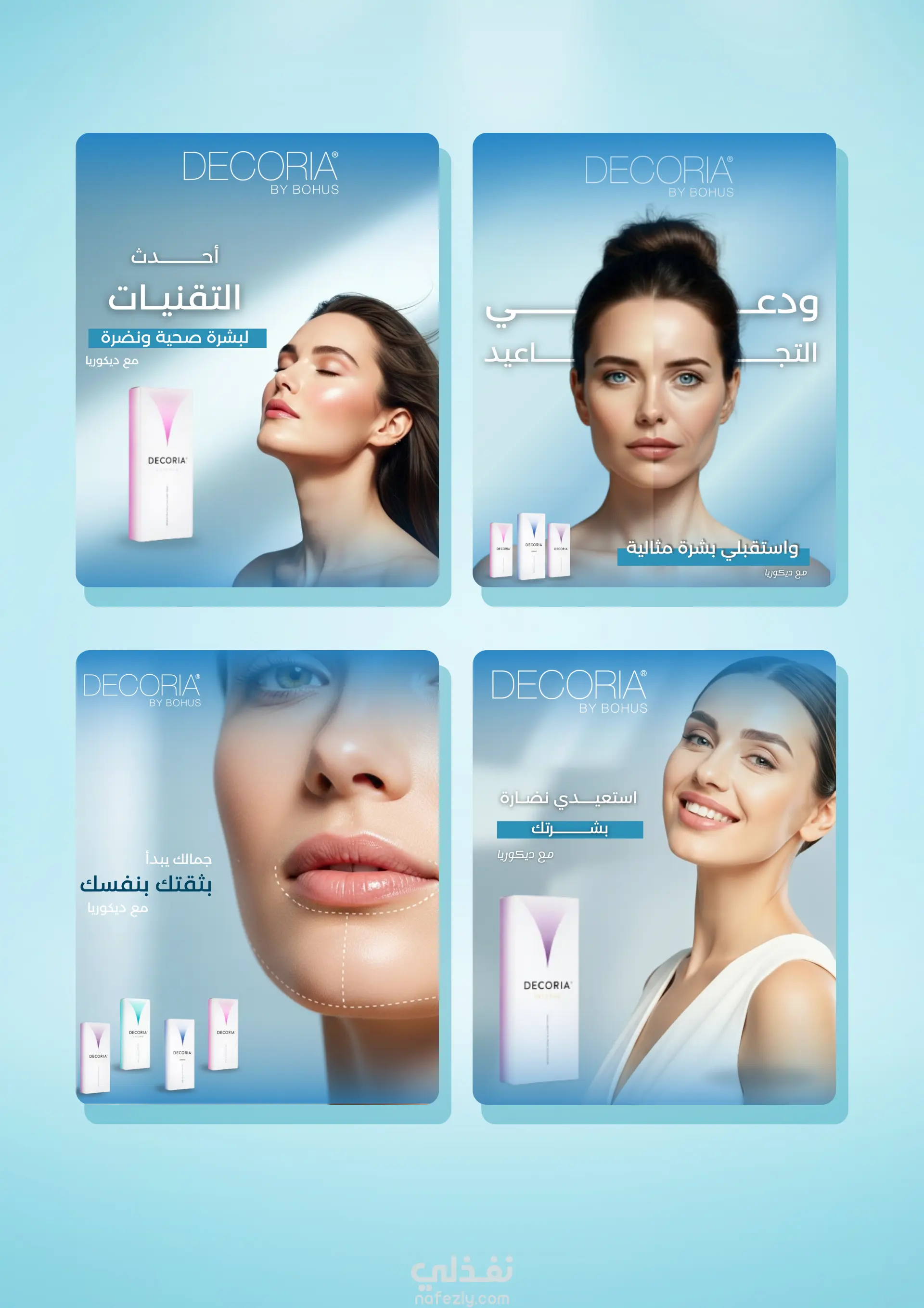 مجموعة بوستات دعائية خاصة بعيادة تجميل بتقدم خدمات زي الفيلر والبوتوكس والعناية بالبشرة. ركزت في التصميم على الألوان الناعمة والستايل الأنثوي اللي يناسب البراند، مع دمج صور قبل/بعد وطريقة عرض بسيطة وواضحة.