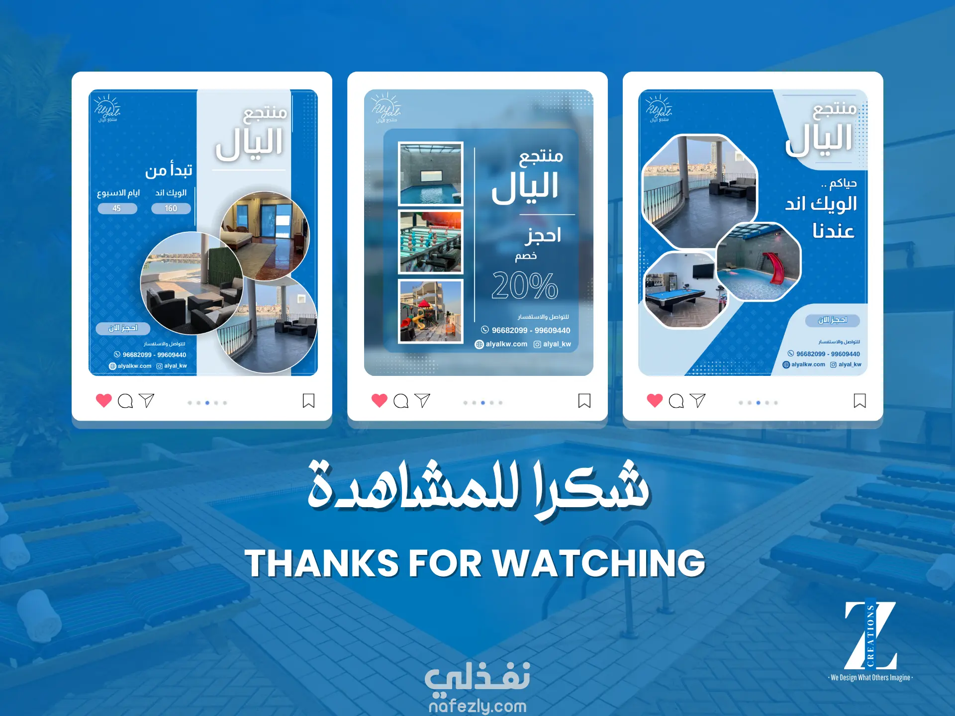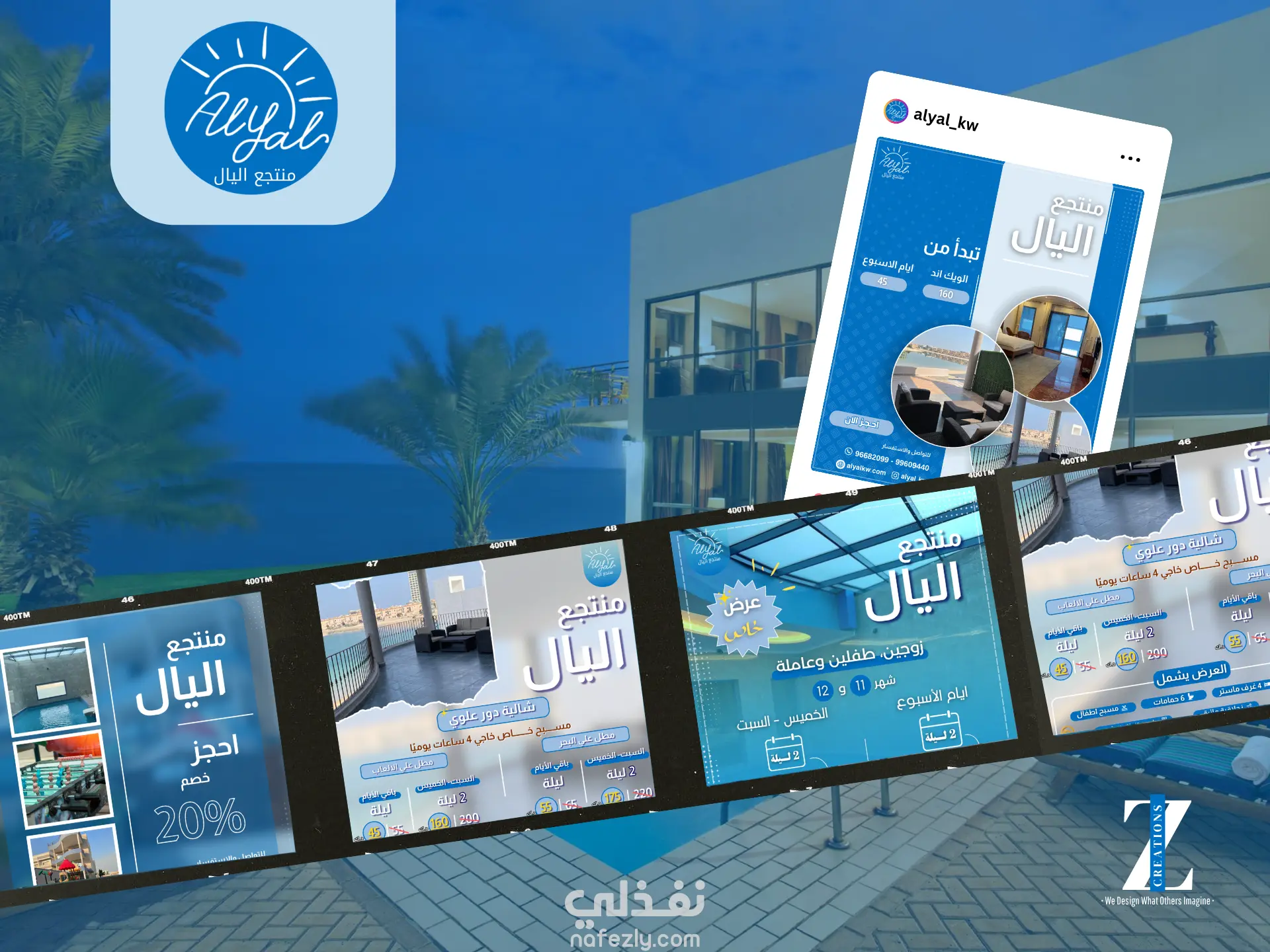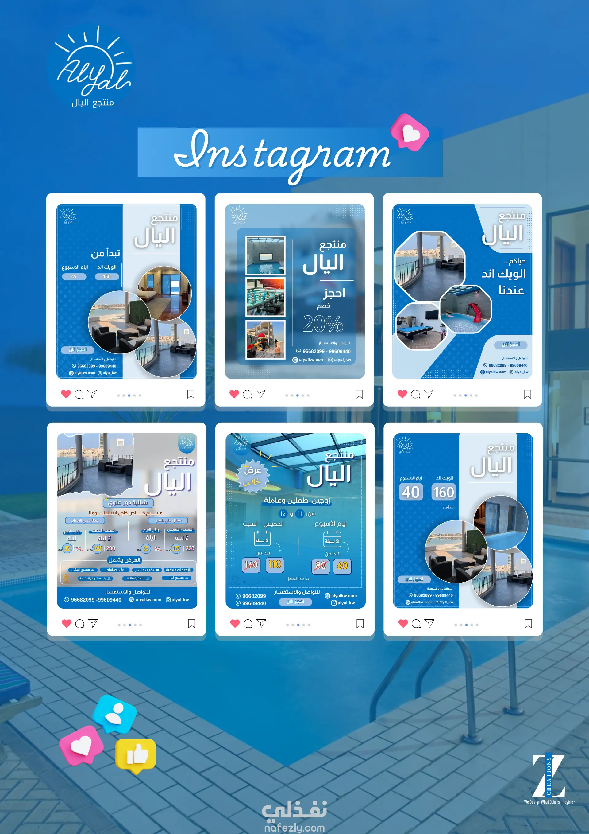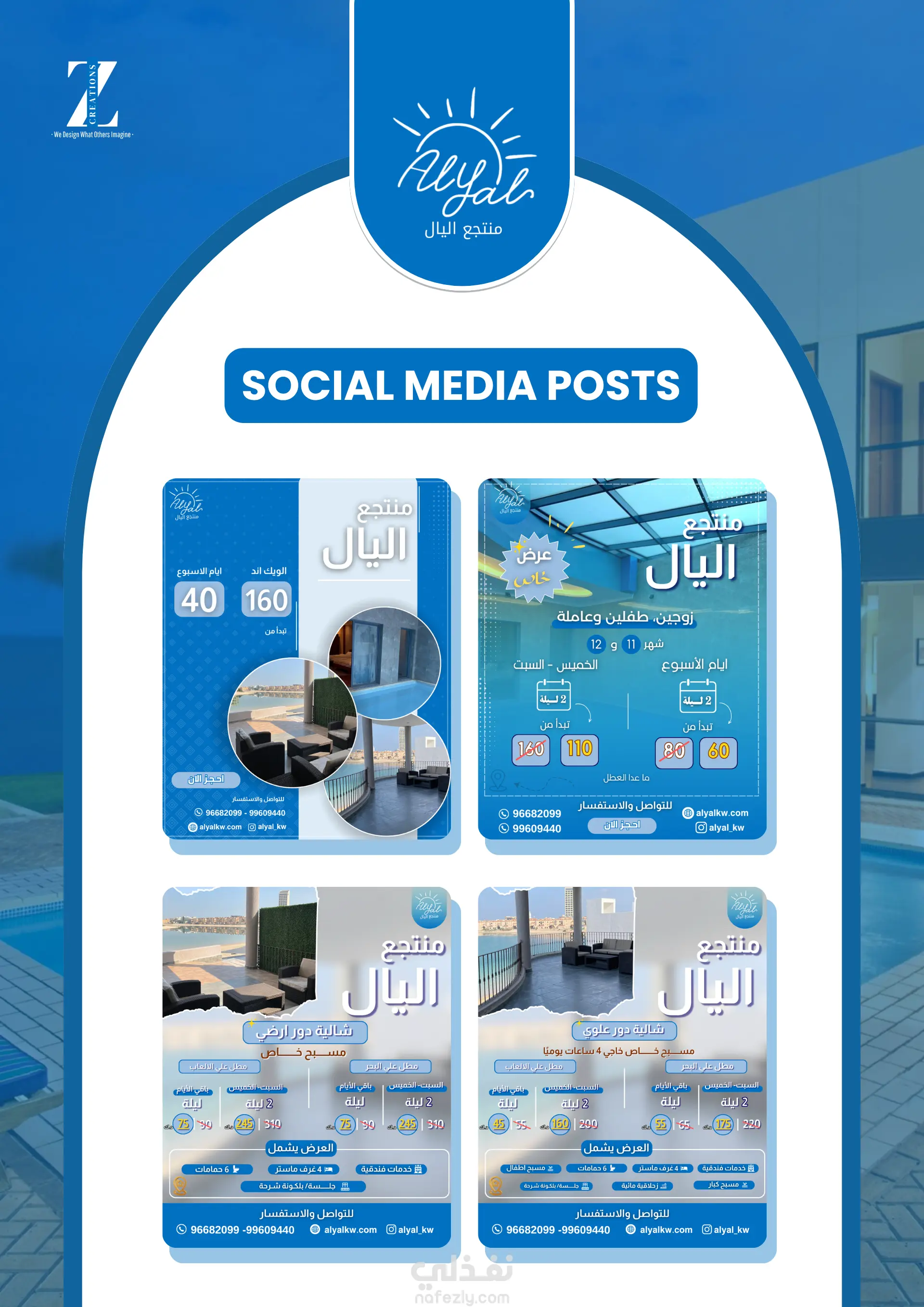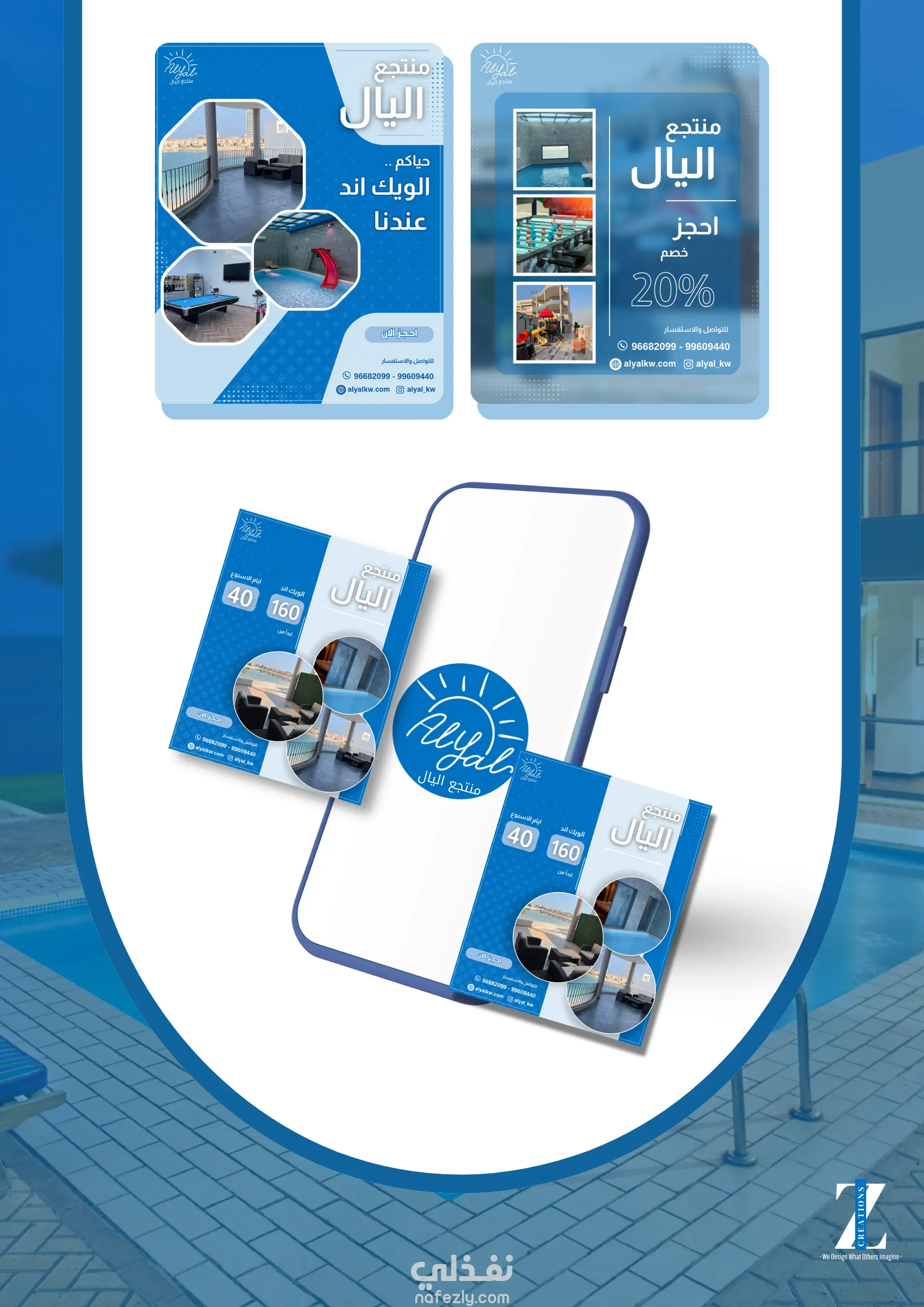 تصميمات دعائية لمنتجع "Alyal Resort" بتظهر جمال المكان وخدماته، مع تنسيق ألوان رايق وصور للمسابح والشاليهات بطريقة بتشد الانتباه.