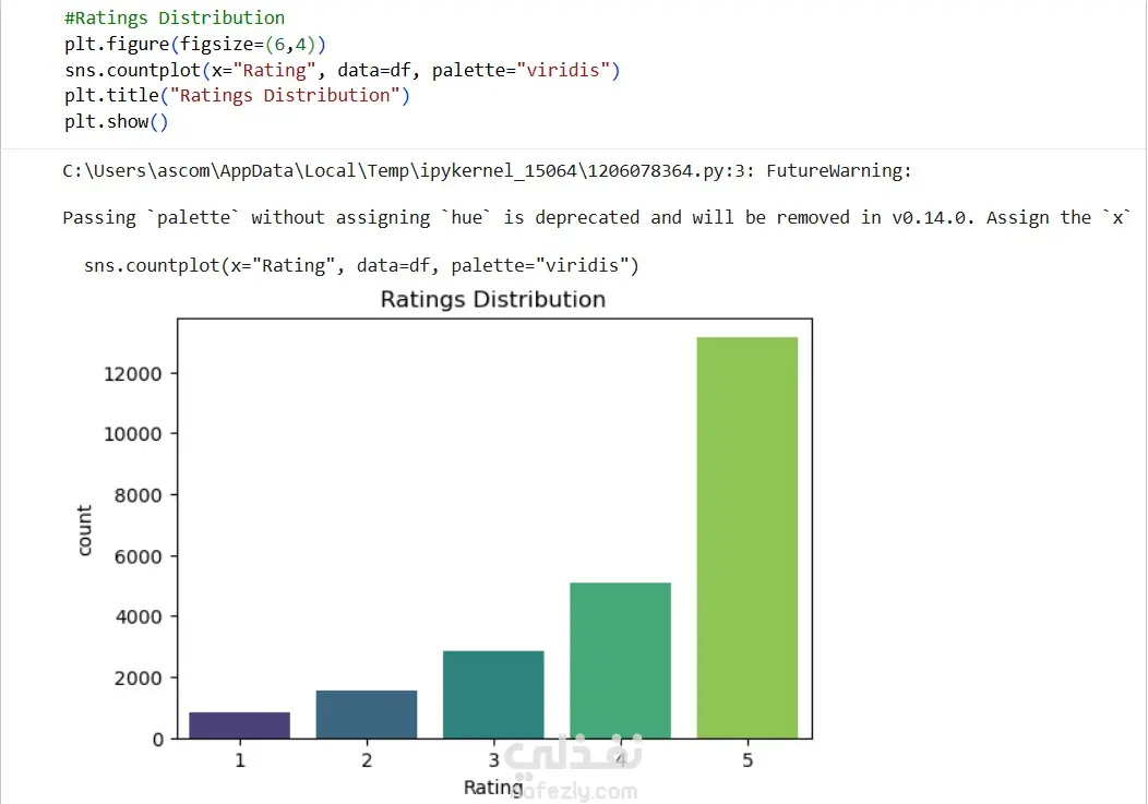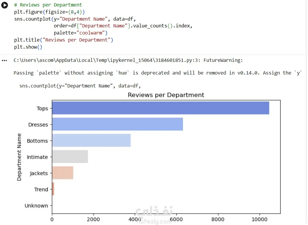 التحليل الاستكشافي للبيانات (EDA): دراسة توزيع التقييمات، أكثر الأقسام تكرارًا في المراجعات، وتحليل الكلمات الأكثر استخدامًا من العملاء.