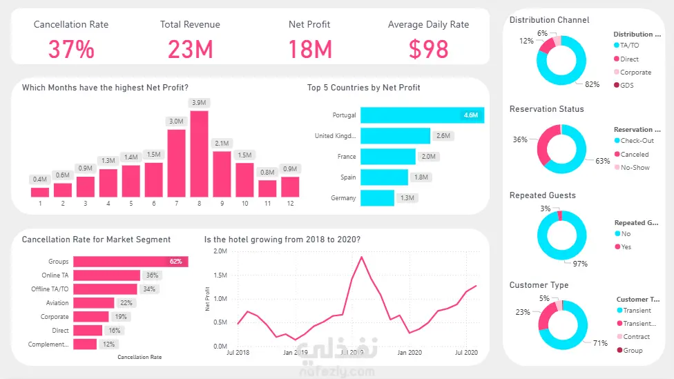 يعتمد مشروع لوحة بيانات Power BI هذا على سير عمل تحليلي منظم: - Power Query(تنظيف البيانات): اُستخدم لتنظيف البيانات الأولية، وتوحيدها، وهندسة الميزات (مثل تحويل التواريخ). -Data Modeling: تم تطبيق نموذج Star Schema قوي، يربط جدول الحقائق المركزي hotel_data بجداول الأبعاد المرجعية (lookup dimension tables). - حسابات DAX: تم تصميم مقاييس مالية وتشغيلية معقدة (مثل صافي الربح، ومعدل الإلغاء). - Data Visualization: الناتج النهائي هو لوحة بيانات فردية ومتجاوبة، تعرض اتجاهات الأداء للفترة من 2018 إلى 2020.