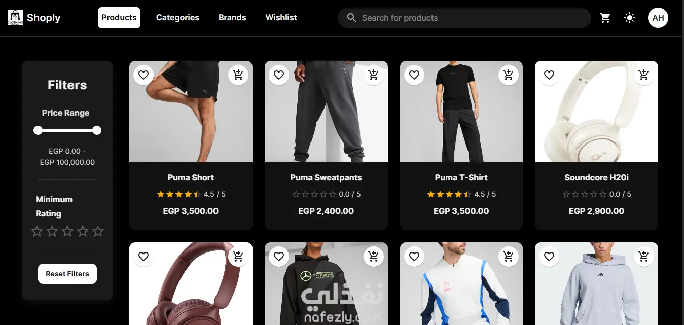 المشروع عبارة عن نظام E-Commerce كامل. المستخدم يقدر يعمل حساب ويسجّل دخول، يتصفح المنتجات ويشوف تفاصيلها، ويضيفها لعربة التسوق أو الـ Wishlist، وبعدها يكمل عملية الدفع. البيانات بتتخزن في MongoDB والتوثيق بيتم باستخدام JWT. الـ Admin ليه Dashboard يقدر من خلالها يدير المنتجات، الأقسام، المستخدمين، الطلبات، ويشوف الإحصائيات. الفرونت معمول بـ React مع TypeScript واستخدمت Material UI (MUI) علشان الـ UI يكون جاهز ومنظم. الباك إند معمول بـ Node.js + Express.