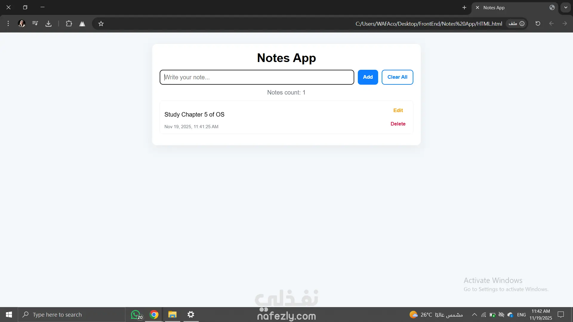 يتم حفظ جميع الملاحظات باستخدام LocalStorage، لذلك تبقى محفوظة حتى بعد إغلاق الصفحة أو تحديثها.