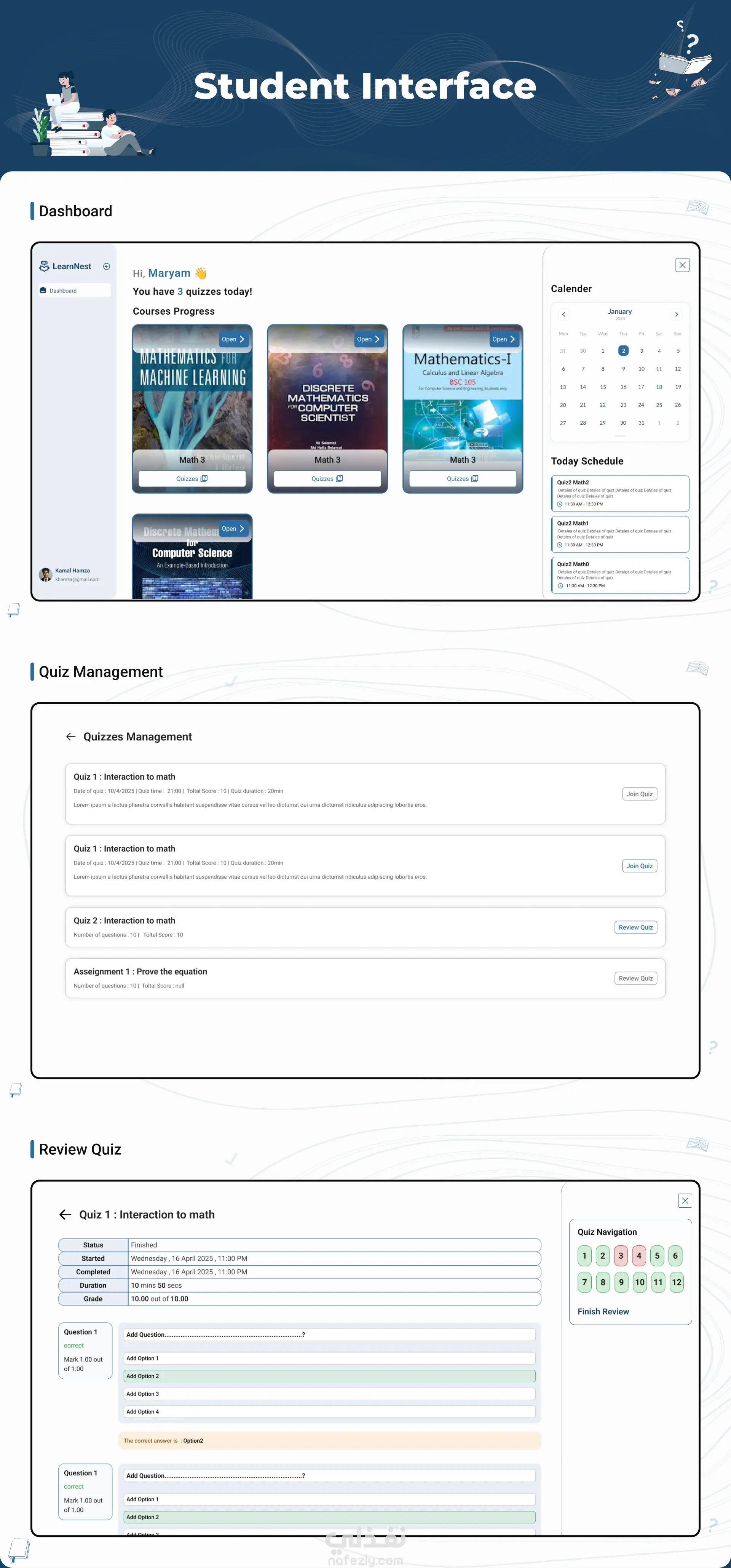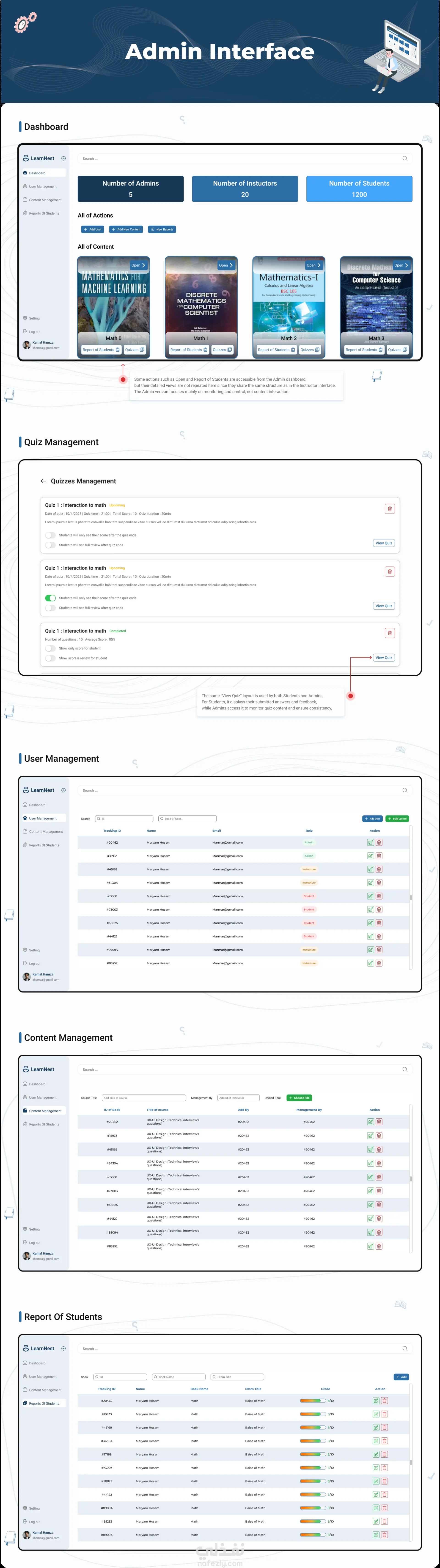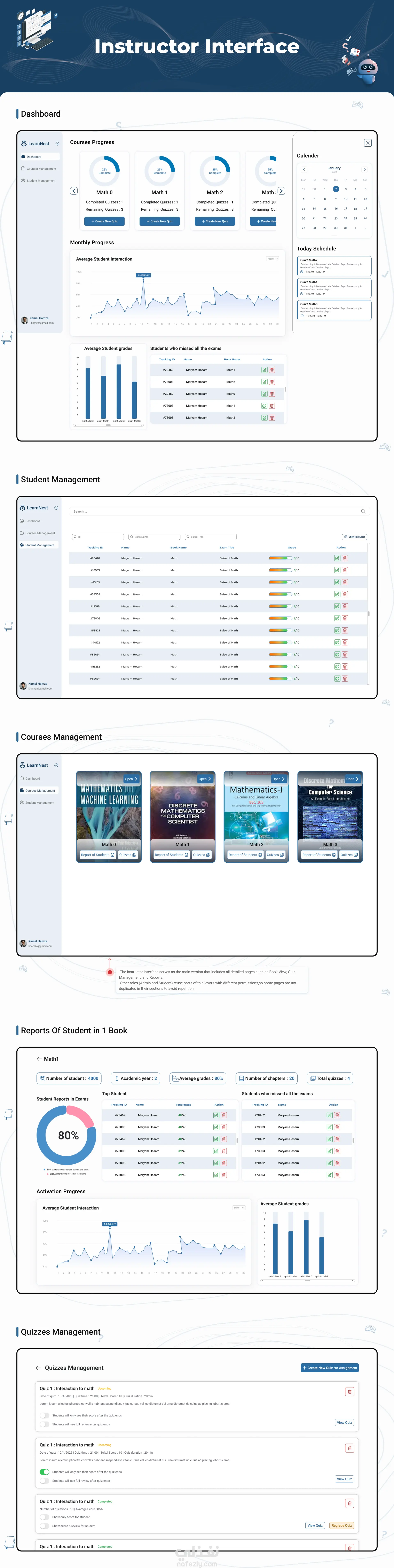 Smart Framework Book هو منصة تعليمية ذكية مدعومة بالذكاء الاصطناعي، تم تطويرها ضمن مشروع التخرج، وتخدم المدرسين والطلاب والإداريين من خلال نظام متكامل يسهّل إدارة العملية التعليمية ويعزّز فعاليتها. يستطيع المدرس إعداد المحتوى باستخدام نظام توصية مدمج، كما يمكنه متابعة تفاعل الطلاب مع الكتاب الرقمي، وعرض نتائج الاختبارات لكل طالب، وإنشاء اختبارات مخصّصة باستخدام الذكاء الاصطناعي. أما الطلاب فيستفيدون من توصيات دراسة شخصية، وقدرات للتعلم الذاتي، إلى جانب إمكانية الوصول إلى الامتحانات المخصّصة من المشرف والاختبارات التي يتم توليدها عبر الذكاء الاصطناعي. وتشمل المنصة أيضًا لوحة تحكم للإدارة تتيح إدارة المستخدمين والمحتوى، متابعة النظام، وتحليل الأداء. النتيجة كانت منصة أكاديمية ذكية متعددة الأدوار، تجمع بين التكنولوجيا الحديثة وواجهة استخدام سهلة وواضحة، لتقديم تجربة تعليمية أكثر سلاسة وتطورًا.