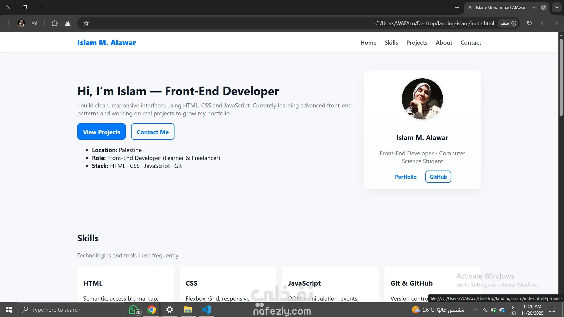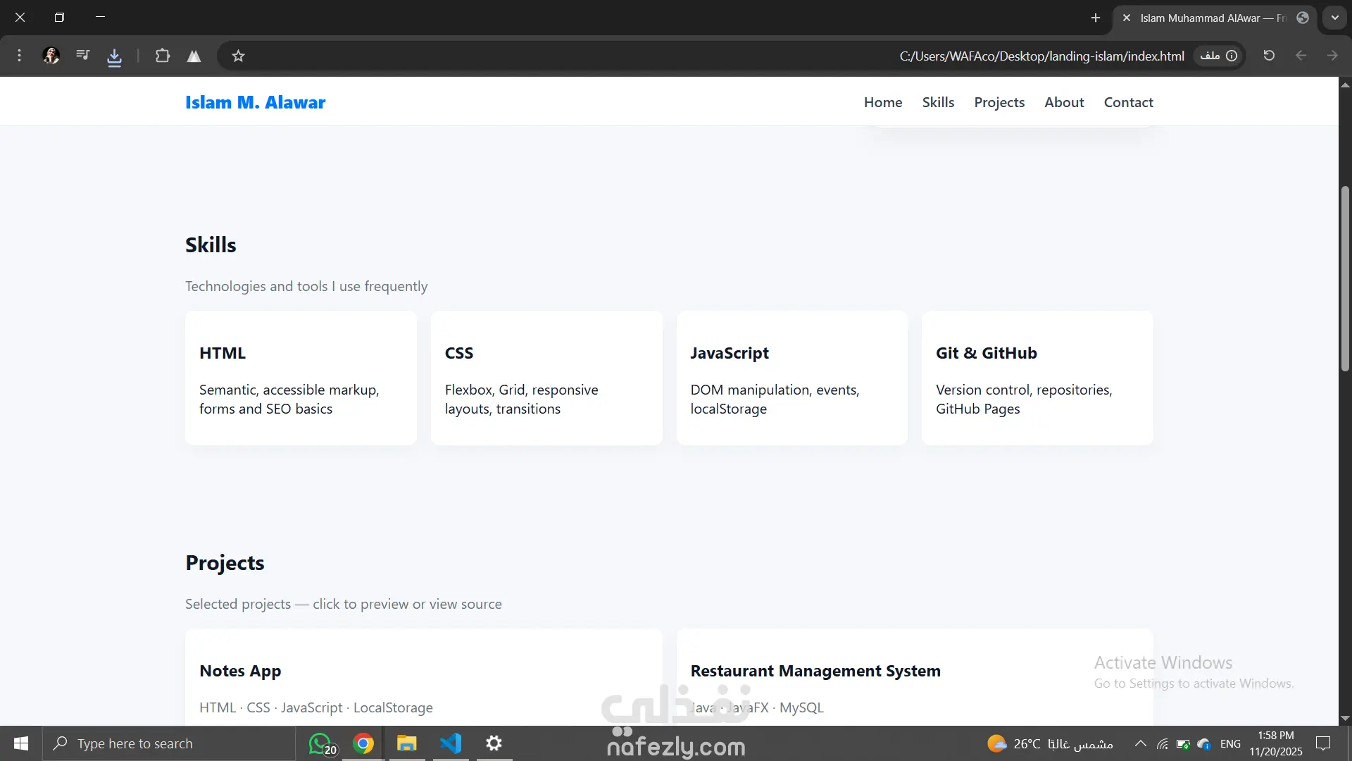 صفحة هبوط أنيقة وسريعة الاستجابة لمحفظة أعمالك، مصممة باستخدام HTML وCSS وJavaScript.