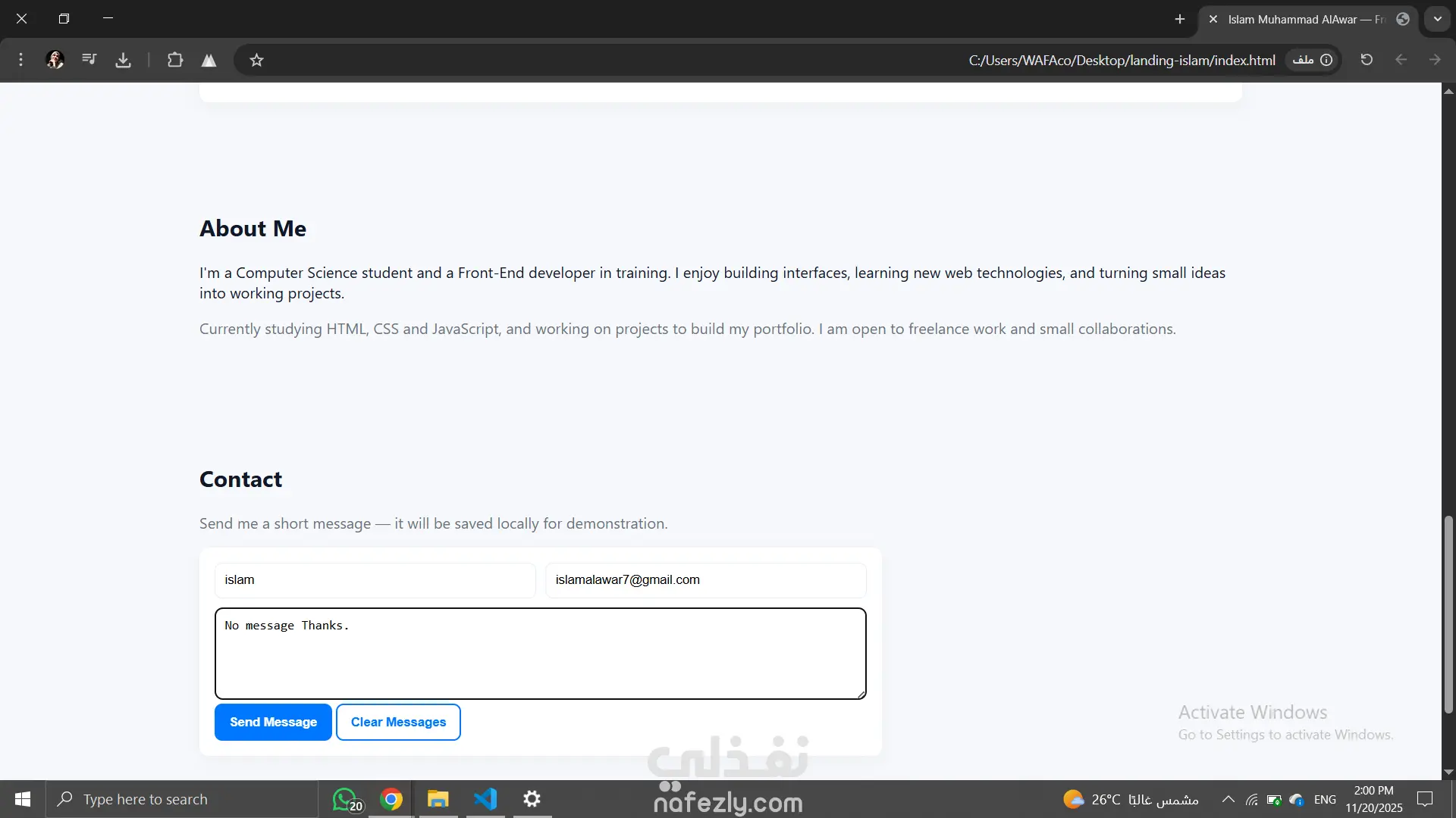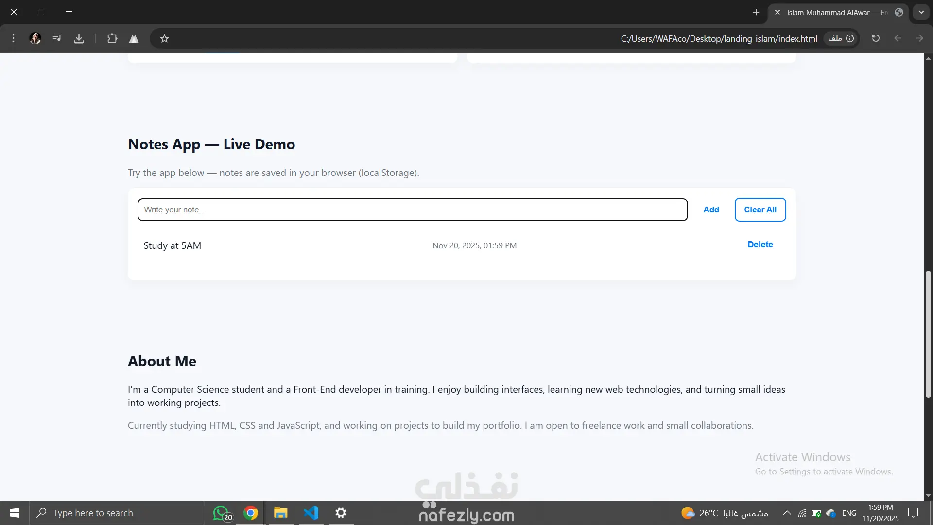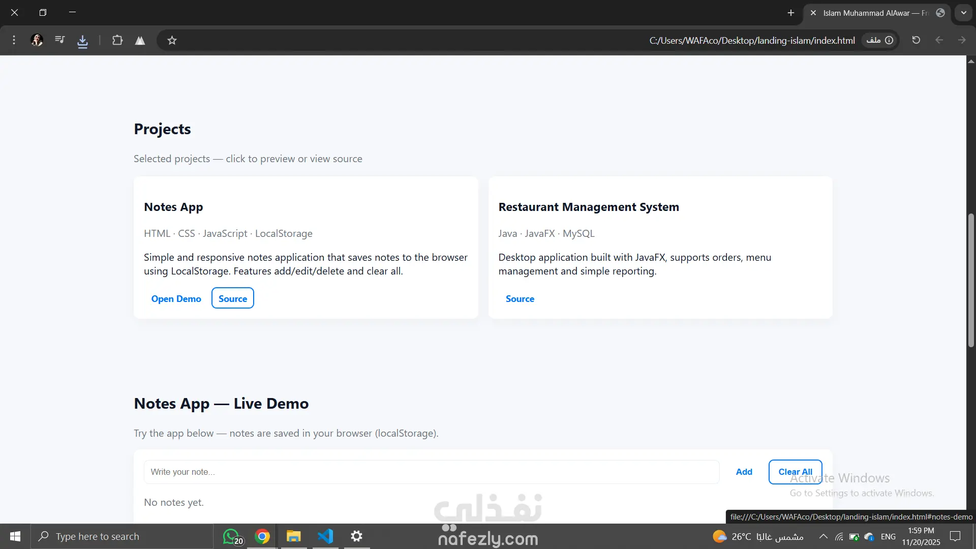 تتضمن عرضًا تفاعليًا للملاحظات ونموذج اتصال يحفظ الرسائل محليًا.