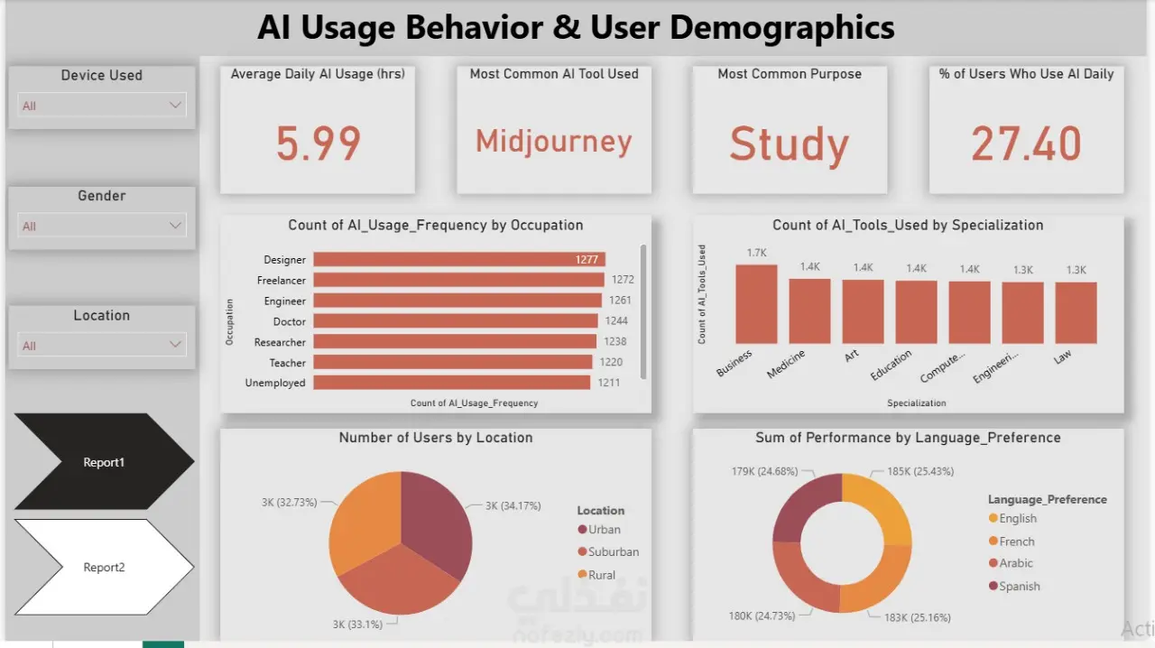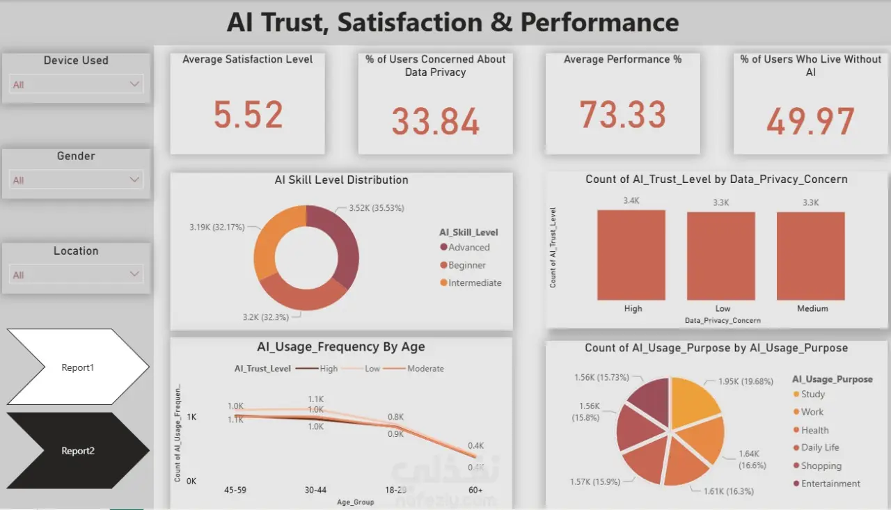 في هذا المشروع قمنا بتحليل بيانات تضم 10,000 سجلًا و22 خاصية لفهم اعتماد الأفراد حول العالم على أدوات الذكاء الاصطناعي.