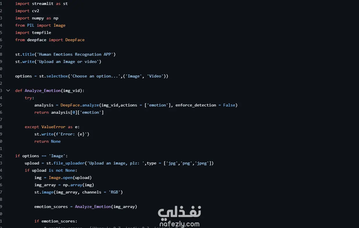 هذا تطبيق ويب مبني باستخدام Streamlit ويعتمد على مكتبة DeepFace لتحليل والتعرف على المشاعر البشرية من الصور ومقاطع الفيديو. المميزات: التعرف على المشاعر من الصور: يمكنك رفع صورة، وسيقوم التطبيق باكتشاف وعرض المشاعر السائدة فيها. التعرف على المشاعر من الفيديو: يمكنك رفع مقطع فيديو، وسيقوم التطبيق بتحليل الإطارات لاكتشاف المشاعر بشكل لحظي.