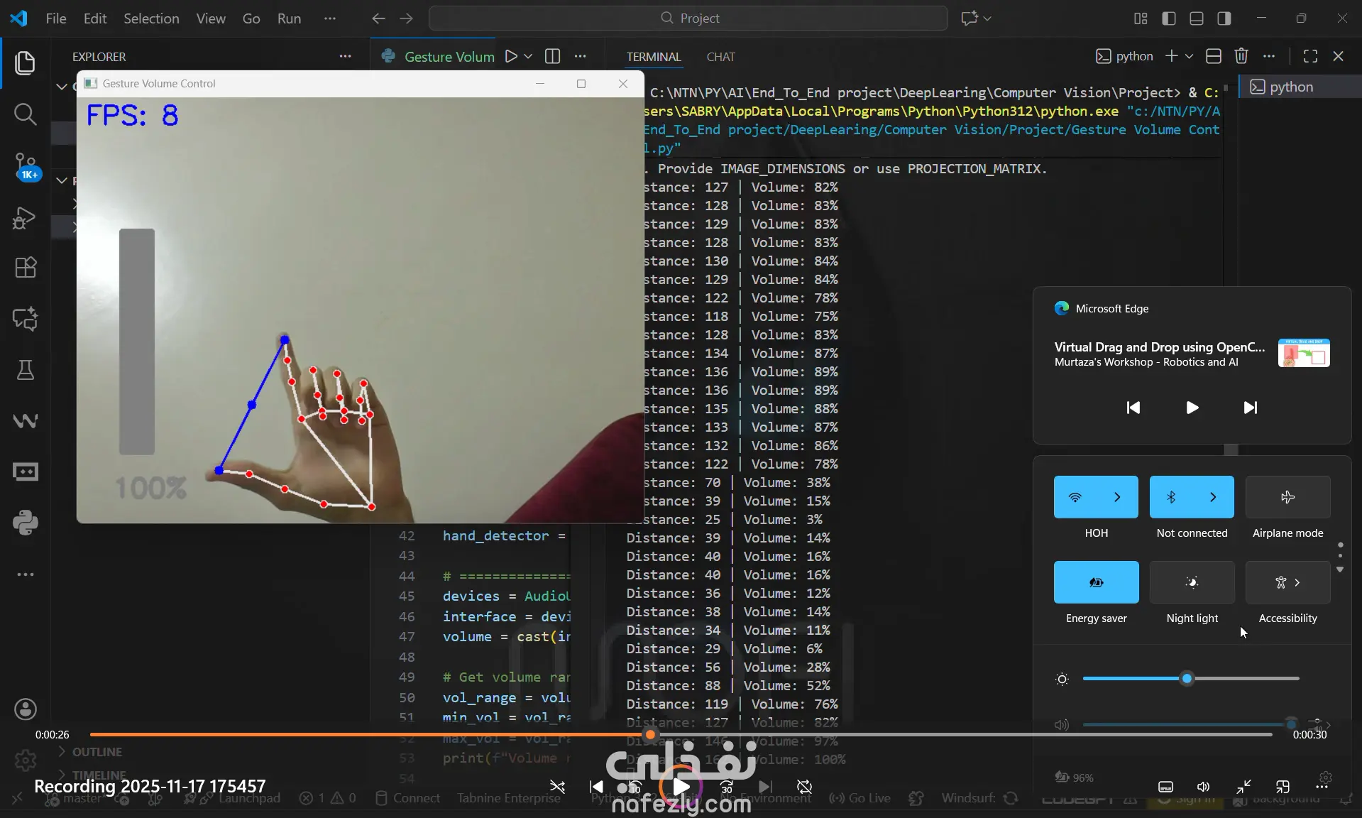 🖐️ Touchless audio control system using real-time hand gesture recognition 👁️ Real-time hand tracking with MediaPipe technology 🎚️ Intuitive pinch gestures for precise volume adjustment 📊 Visual feedback with on-screen volume indicators ⚡ High-performance processing with FPS monitoring Tech Stack: Python OpenCV MediaPipe NumPy pycaw comtypes