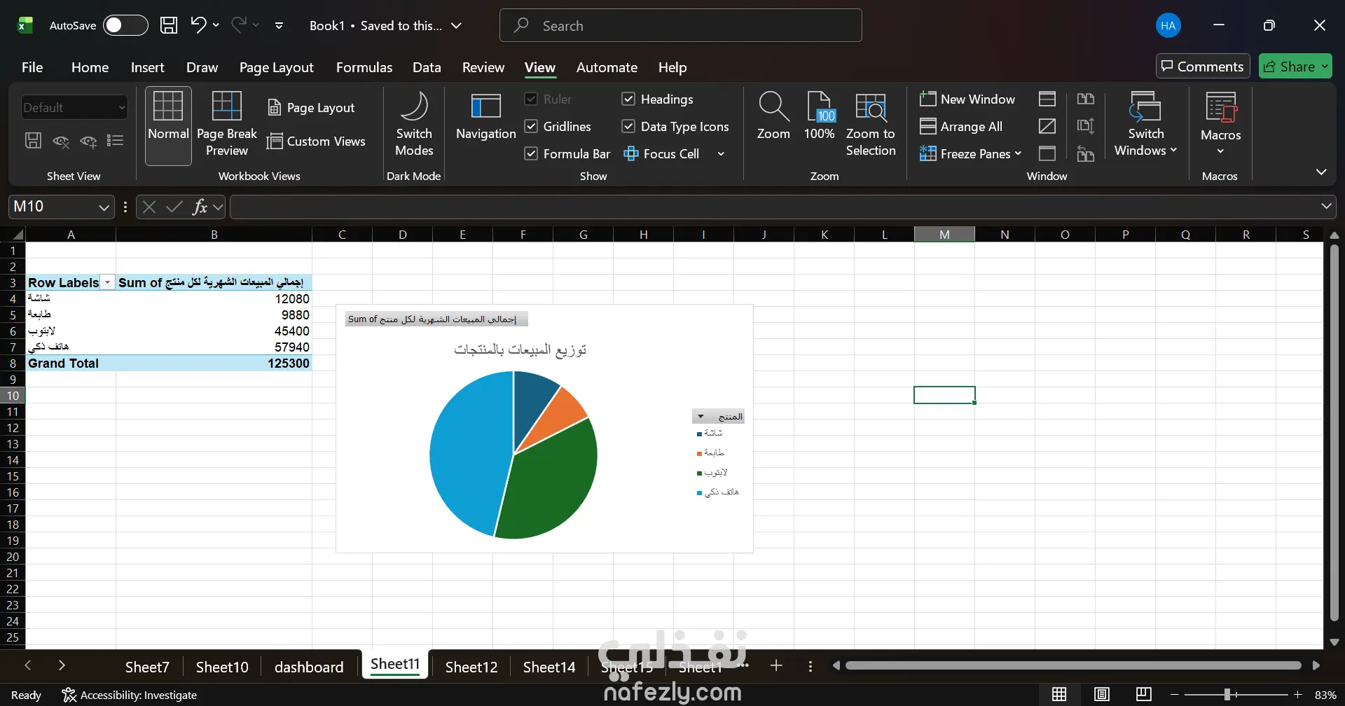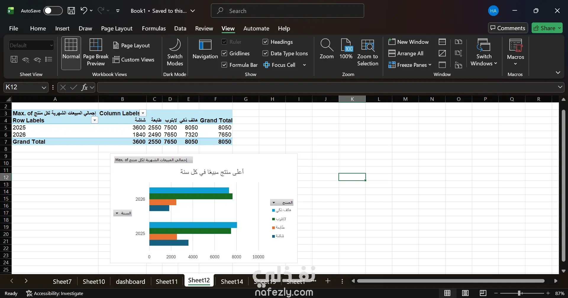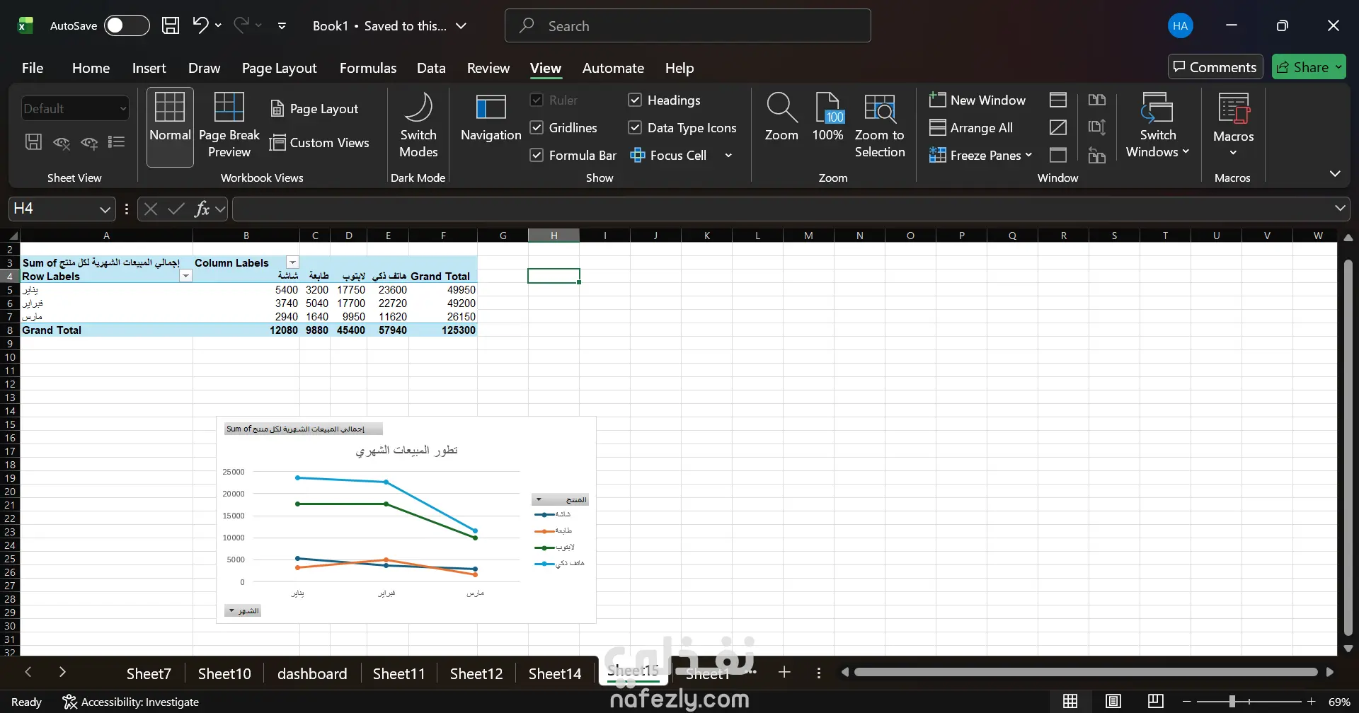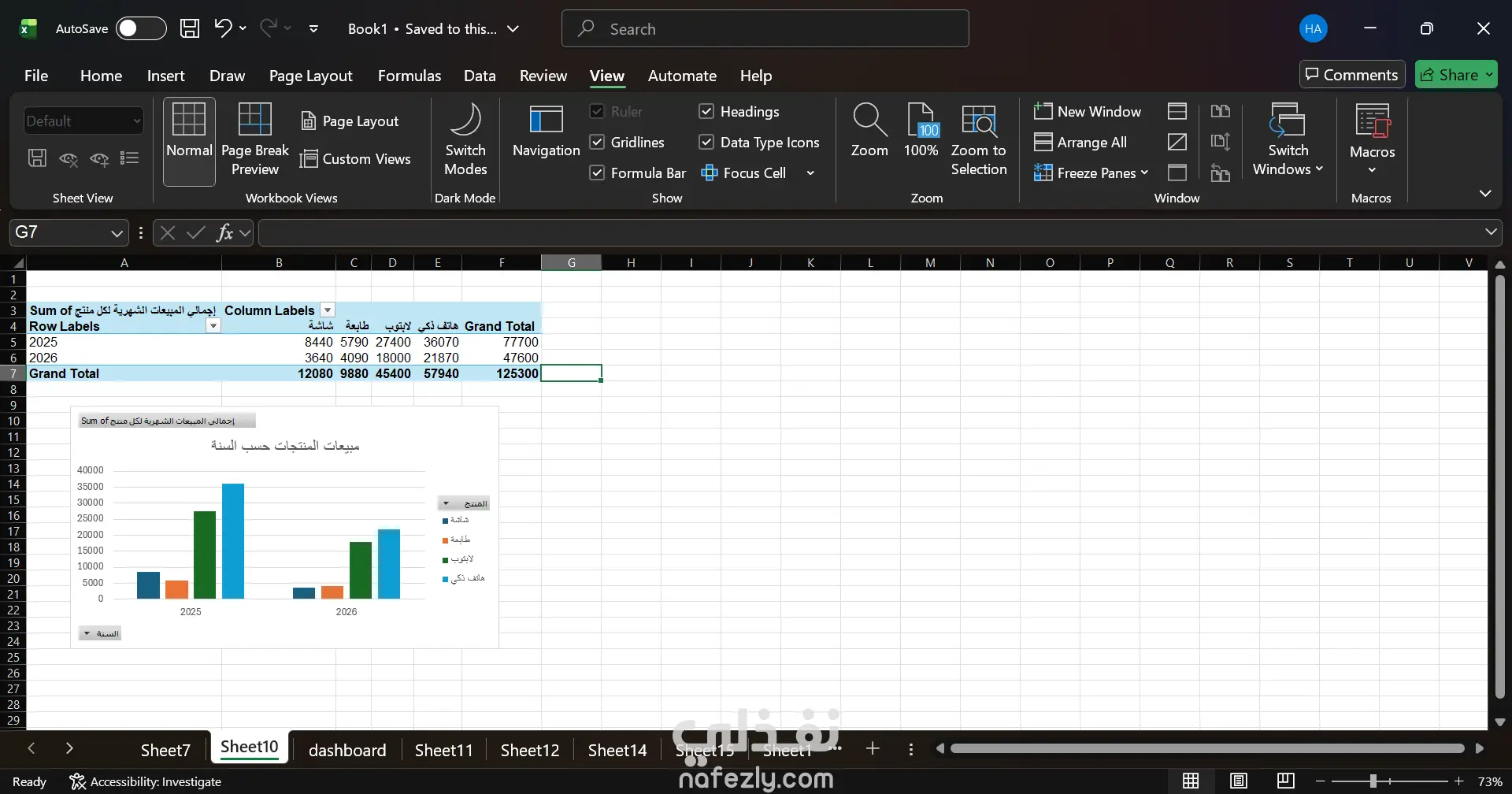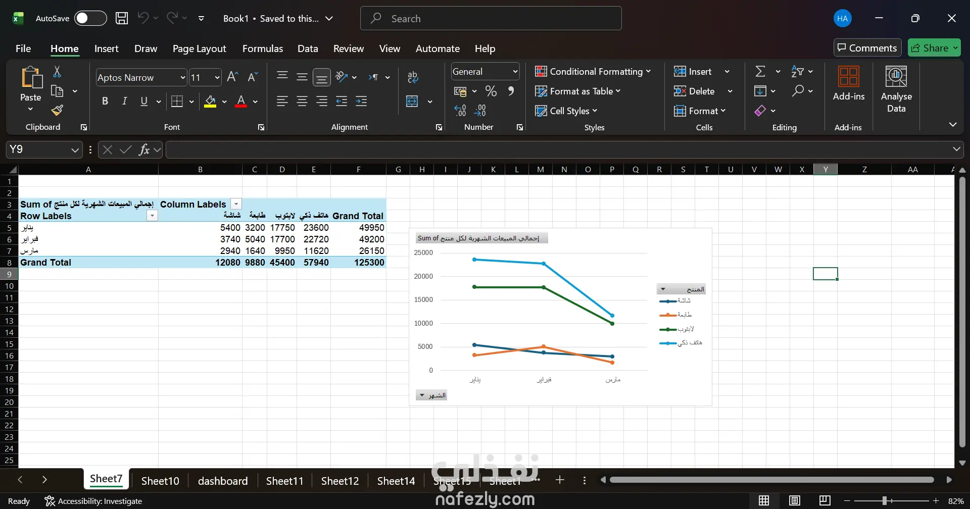 جداول Pivot تعرض المبيعات الشهرية والسنوية لكل منتج بدقة.
