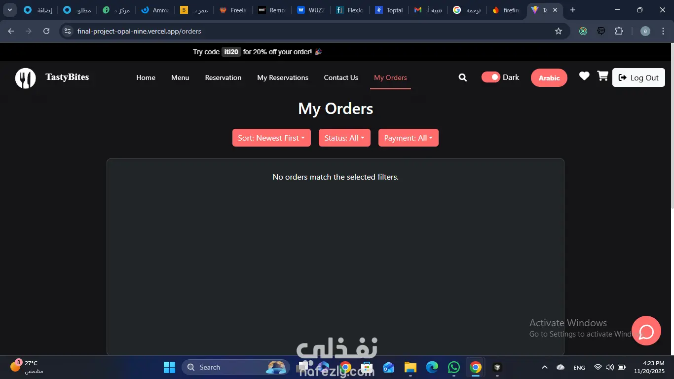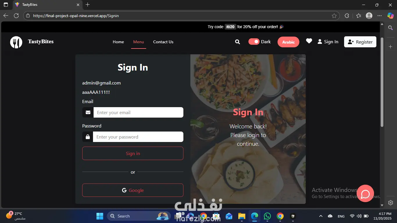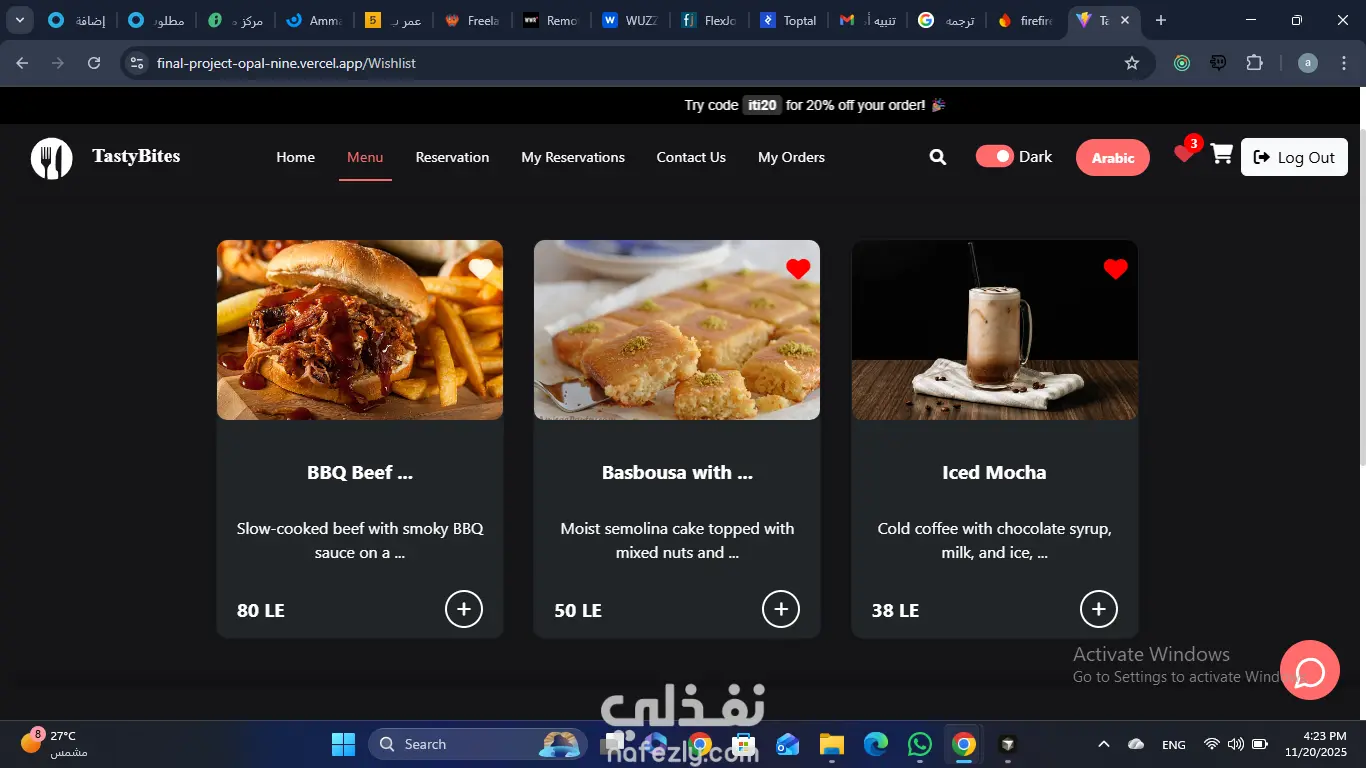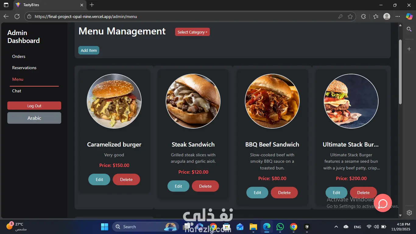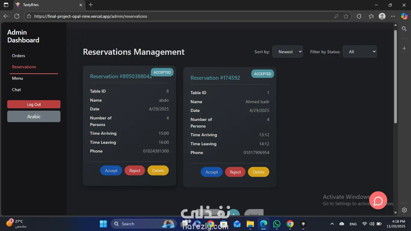 طورت منصة مطعم جاهزة للإنتاج (Production-Ready Restaurant Platform) باستخدام React 19، Vite، Redux Toolkit، وTailwind مع واجهة ثنائية اللغة كاملة (عربي/إنجليزي) ودعم الثيم الداكن/الفاتح. نفذت رحلة العميل الشاملة: تصفح المنيو، قائمة المفضلة، سلة الطلبات، اختيار الطاولة حسب السعة، حجز الطاولات، تتبع الطلبات في الوقت الفعلي، والدفع عبر PayPal أو الكاش عند الاستلام مع دعم الكوبونات ومسارة تلقائية للطلبات في Firestore. دمجت Firebase Authentication، Firestore، Storage، وRealtime Database لضمان تسجيل دخول آمن وتزامن بيانات فوري بين واجهة العميل ولوحة الإدارة. طورت لوحة تحكم أدمن محمية حسب الصلاحيات (Role-Based) تحتوي على عمليات CRUD كاملة للمنيو (مع رفع الصور)، الطلبات، والحجوزات، بالإضافة لرسوم بيانية تحليلية وتقارير مفصلة. هندست شات ذكي داخل التطبيق مدعوم بباك إند Node.js داخل Docker، قاعدة بيانات فيكتور، وHugging Face Inference API لتقديم ردود ذكية مرتبطة بالمنيو وتاريخ الطلبات. ضمنت تجربة مستخدم سلسة ومتاحة (Accessibility)، إشعارات Toast/SweetAlert2 متسقة، تصميم متجاوب 100%، ونشر المشروع على Vercel مع تطبيق ESLint وهيكلة مكونات نظيفة.