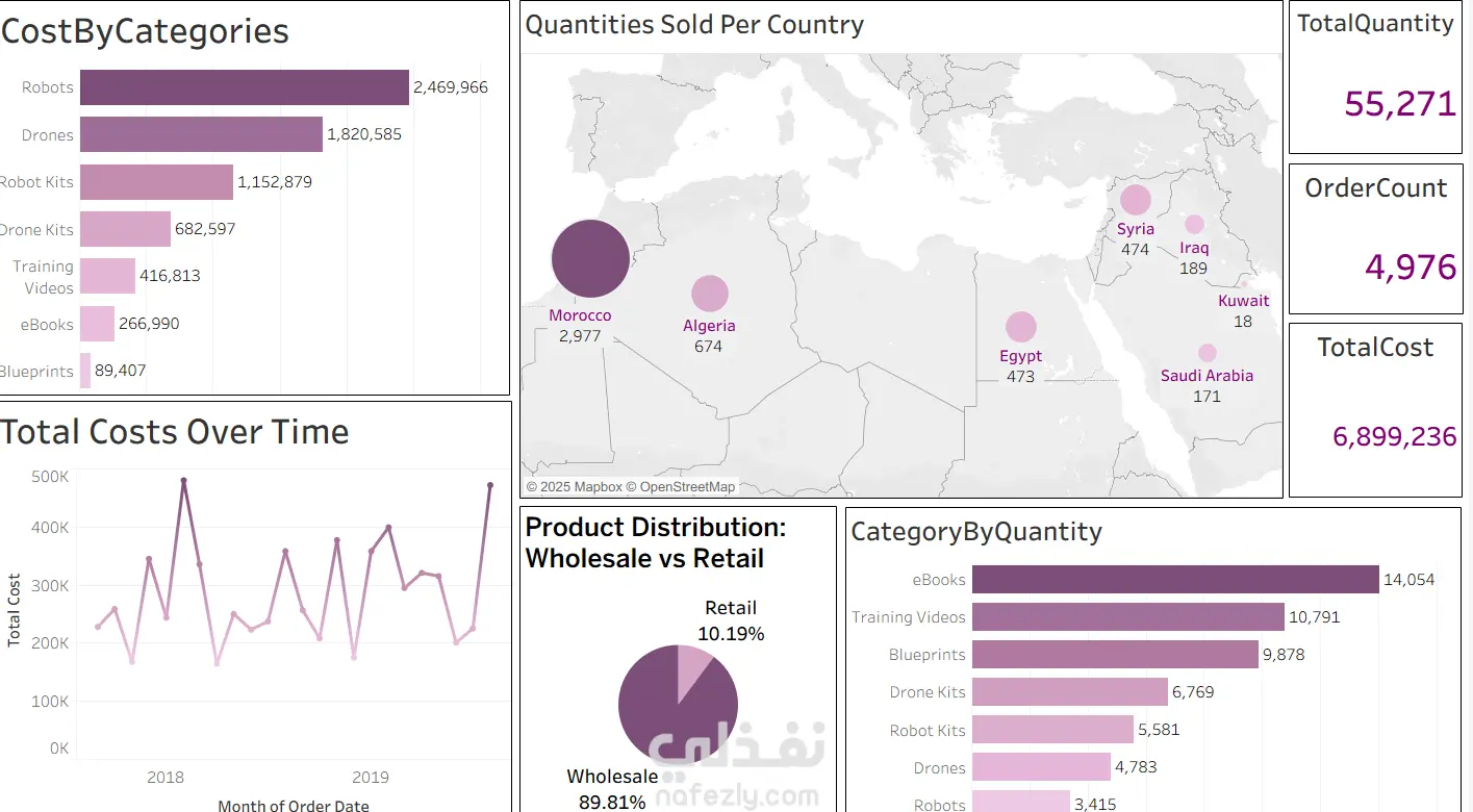 الهدف كان عمل dashboard تفاعلية باستخدام tableau لتوضيح جميع العناصر اللي الشخص ممكن محتاج يعرفها عن المنتجات اللي عندي, من تكلفة علي مدار مدة محددة,الكمية,و التوزيع الجغرافي للمبيعات و الخ