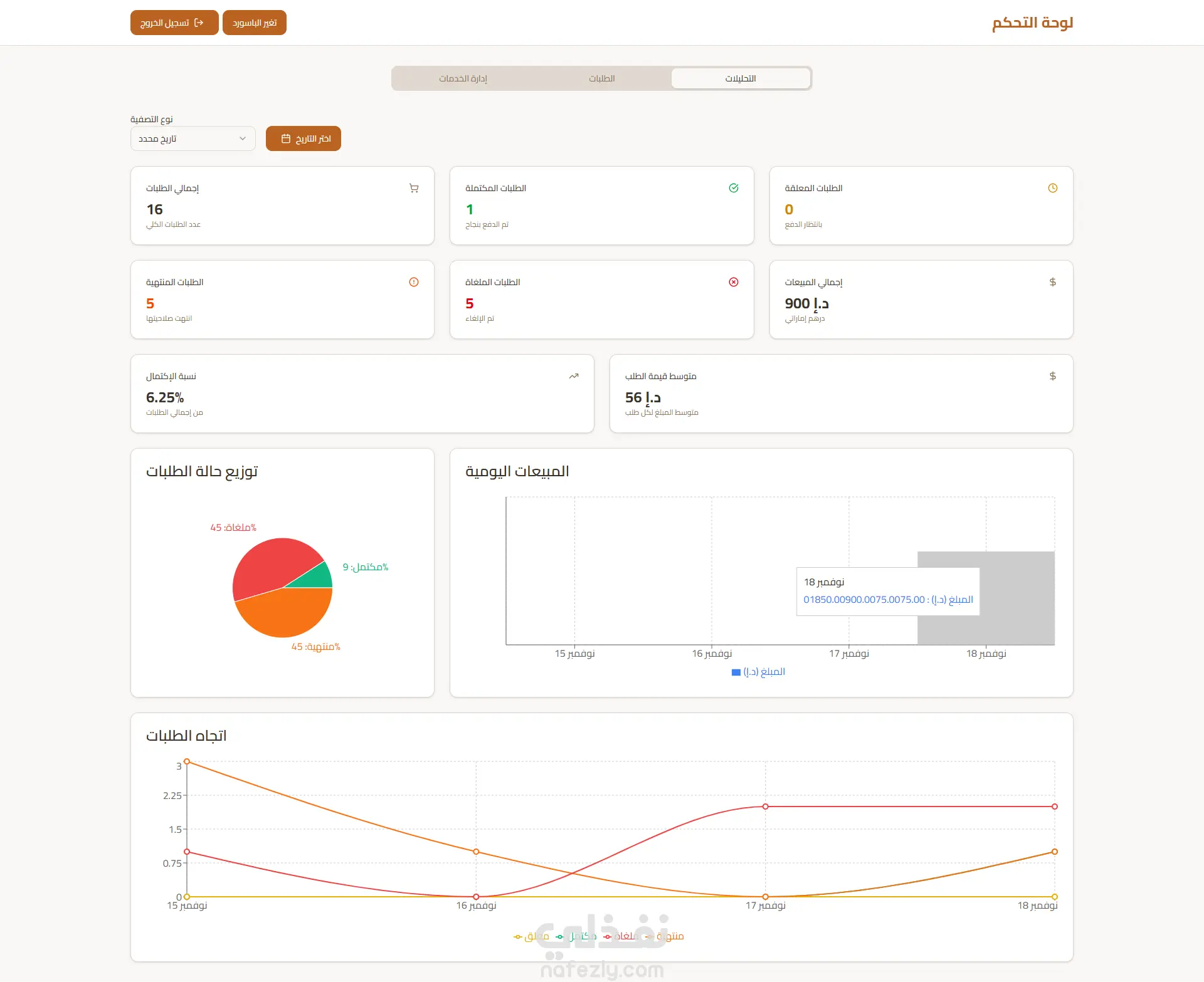 تم تنفيذ تصميم واجهة مستخدم متكاملة لمنصة فجر الخير، شملت بناء لوحة تحكم (Admin Panel) متطورة إلى جانب تصميم صفحات المشتريات والمعروضات الخاصة بالخدمات. الهدف من المشروع كان توفير تجربة استخدام عملية وسهلة الإدارة، مع إبراز المحتوى والخدمات بطريقة منظمة وواضحة. أهداف المشروع تطوير لوحة تحكم سهلة وفعّالة لإدارة محتوى المنصة. تصميم صفحات المشتريات والمعروضات بشكل يعزز وضوح المعلومات. تحسين تجربة المستخدم للمشرفين والزوار على حد سواء. تنظيم الخدمات والعروض بطريقة احترافية تسهل الوصول للمحتوى. توفير واجهة نظيفة عصرية متوافقة مع مختلف الأجهزة. المكونات التي تم تنفيذها 1. لوحة التحكم (Admin Panel) تصميم متكامل لإدارة المحتوى والخدمات. لوحة إحصائيات لعرض البيانات المهمة بشكل سريع. تنظيم الأقسام لتسهيل التحكم في العناصر. واجهة بسيطة وسهلة للمستخدم غير التقني. 2. صفحة المشتريات عرض الطلبات والمشتريات بطريقة مرتّبة وواضحة. تصميم يتيح تصفّح المنتجات أو الخدمات بشكل مريح. تنظيم البيانات لتسهيل المتابعة والفوترة وإدارة العمليات. 3. صفحة المعروضات (الخدمة) إبراز الخدمات المقدمة بشكل بصري جذاب. أقسام مرتبة لسهولة التصفح. تصميم يركز على وضوح المحتوى والتفاعل السلس. مزايا التصميم واجهة بسيطة وعصرية مريحة للعين. ترتيب منطقي للبيانات يسهل على المشرف إدارة المنصة. متوافق مع الهواتف والأجهزة اللوحية. استخدام عناصر UI/UX توضح المهام وتقلل التعقيد.