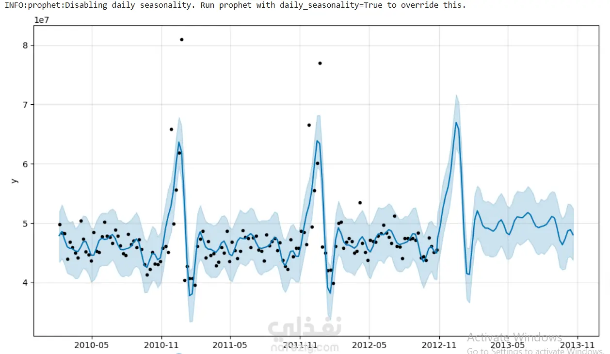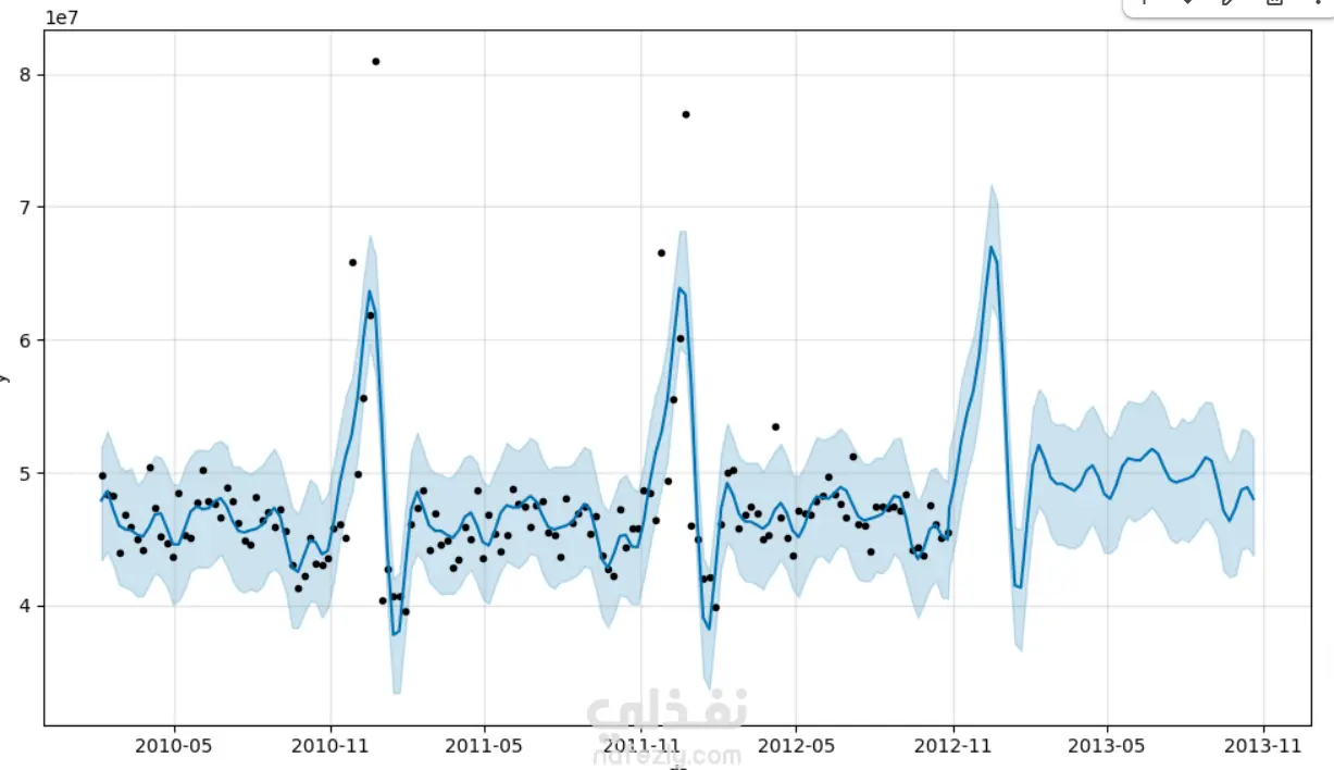 لقد قمت بتحليل dataset لمبيعات walmart ثم استخدمت prophet وهو machine learning model لكي يتوقع المبيعات في المستقبل