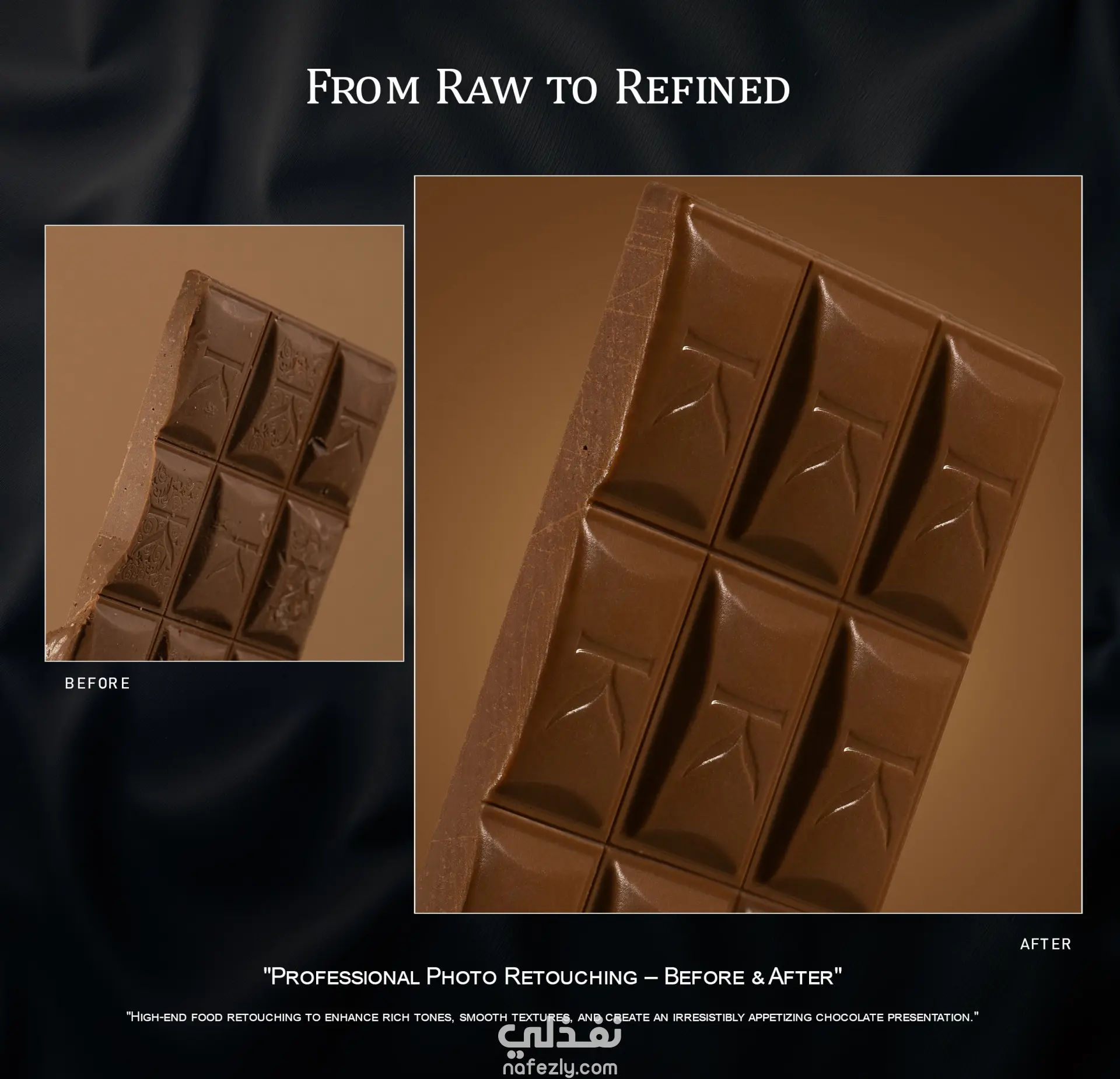 تم تنفيذ ريتاتش احترافي عالي الجودة لصورة شوكولاتة بأسلوب الـDark Mood، مع التركيز على إبراز اللمعان الطبيعي للسطح وإظهار تفاصيل القوام بشكل جذاب وواقعي. تم ضبط الإضاءة والظلال بعناية لتعزيز العمق والدرجات اللونية الداكنة، مع الحفاظ على توازن اللون البني الغني والملمس الحريري للشوكولاتة. يشمل العمل تحسين الحواف وإزالة أي تشويش أو عيوب بسيطة، مع تعزيز الانعكاسات الدقيقة على السطح لإضفاء طابع فخم وراقي. النتيجة صورة جذابة، عالية الوضوح، جاهزة للاستخدام في الحملات التسويقية