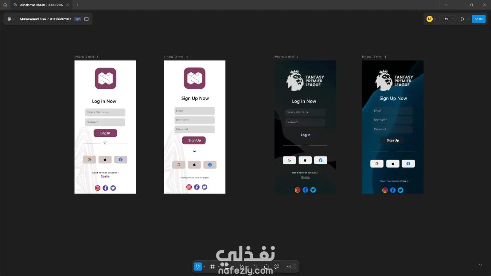 مت بتصميم واجهات تطبيق موبايل كاملة تشمل شاشة الترحيب، تسجيل الدخول، والـ Dashboard الأساسية باستخدام Figma.
