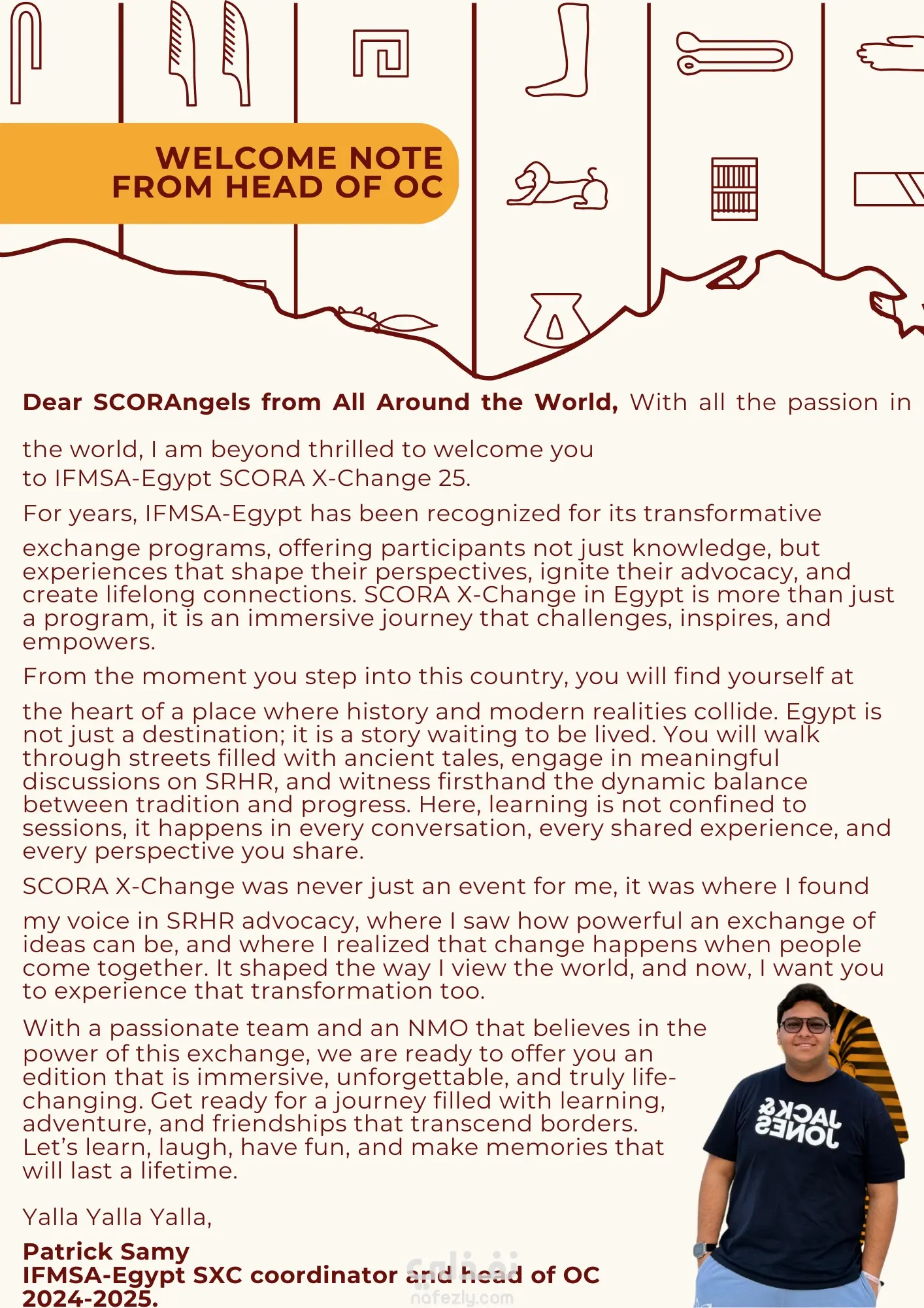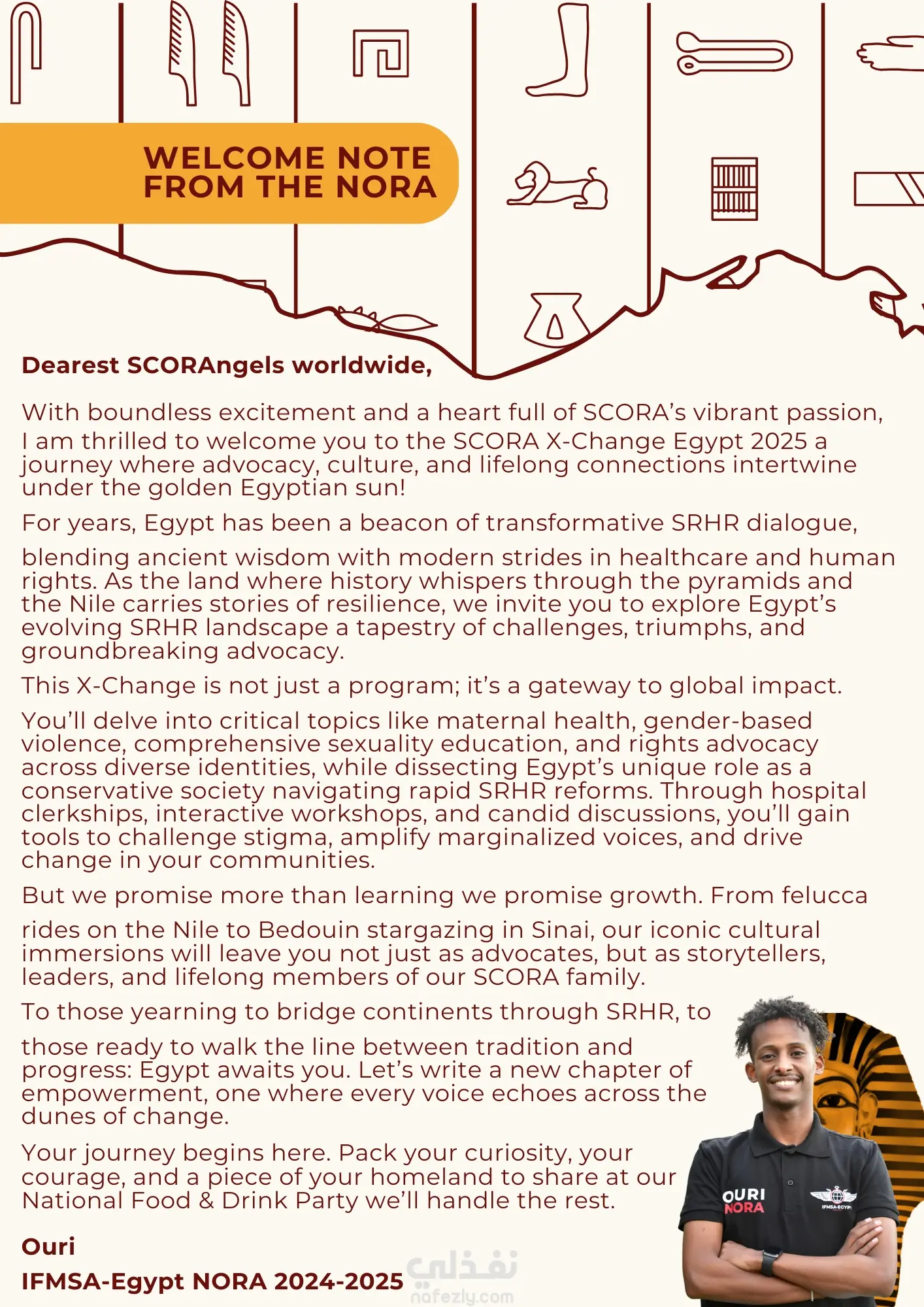 اشتغلت كـ Publication & Media Management Coordinator في برنامج SCORA X-Change 2025، وقدّيت دور قيادة كل ما يخص الميديا، التوثيق، والتواصل الإبداعي للبرنامج. من ضمن أهم مسؤولياتي كان تصميم وإعداد باقة الدعوة اللي بتعرّف المشاركين على البرنامج، وبتعرض جزء من ثقافة مصر، وبتسلّط الضوء على جلسات الـSRHR عندنا. الباقة كانت عامل رئيسي في إن مصر تبقى تاني أكتر وجهة مطلوبة بين المتقدّمين. وكمان معظم الفيدباك من المشاركين كان بيشيد بجودة التصميم، الإبداع، وتمثيل الثقافة المصرية بشكل حلو وجذّاب. كمان وثّقت البرنامج عن طريق الصور والفيديو، وعملت مونتاج وصياغة محتوى لإنستجرام ستوريز وبوستات. استخدمت خبرتي في الجرافيك ديزاين عشان أعمل قوالب وframes موحّدة بالهوية البصرية بتاعة البرنامج، وحرصت إن كل حاجة تبقى جذّابة، مترابطة، وماشية مع هدف التواصل بتاعنا. من خلال الدور ده، دمجت بين التواصل الاستراتيجي، الـvisual storytelling، وصناعة محتوى توعوي مرتبط بالـSRHR، وده ساعد في رفع معدّل المشاركة وفي عرض مجهود مصر في مجالات الصحة الجنسية والإنجابية على مستوى دولي.