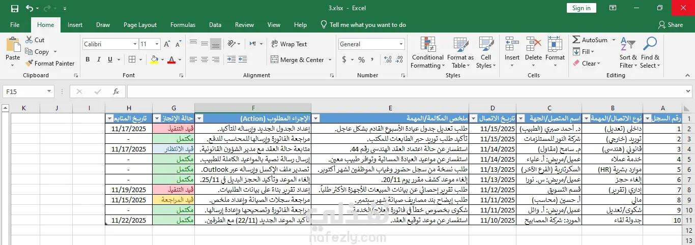 عند العمل كسكرتارية , تم تنظيم البيانات بأستخدام جدول اكسل وهذا مثال مبسط لهذا العمل