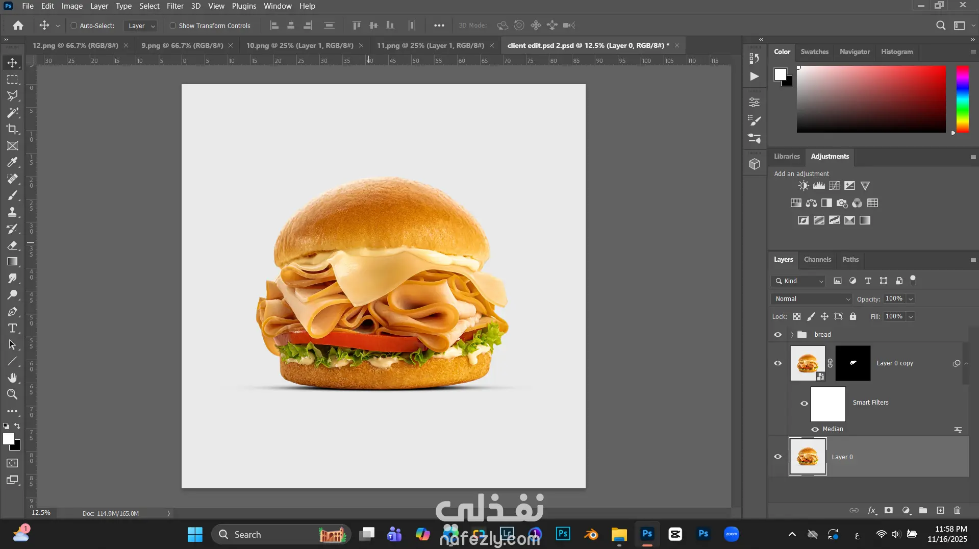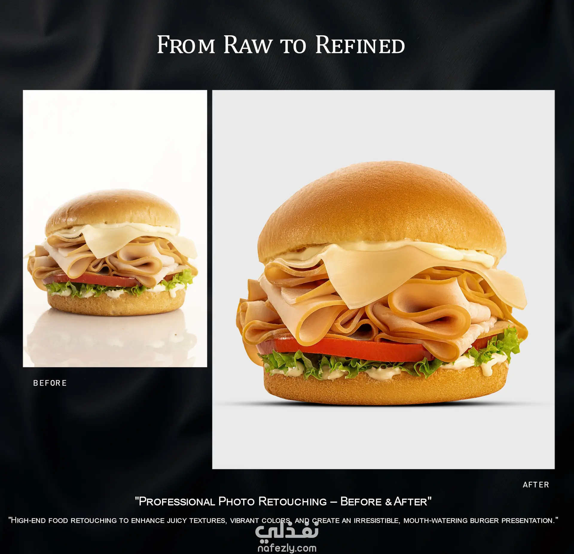 تم تنفيذ ريتاتش احترافي عالي الجودة لصورة برجر مخصّصة لعرض المنتجات بنمط الـE-commerce. يشمل العمل تنظيف الخلفية إلى بياض نقي مع تحديد الحواف بدقّة، وضبط الطبقات والعناصر الغذائية لإظهار القوام الحقيقي لكل جزء من البرجر. تم تحسين ملمس الخبز، وإبراز لمعان الجبن، وتعزيز تفاصيل اللحم من خلال تقنيات دقيقة في الـDodge & Burn لإبراز العمق دون مبالغة. كما جرى تنفيذ معايرة لونية لضمان درجات واقعية ومشبعة بشكل متزن، مع الحفاظ على وضوح عالٍ وخلو تام من التشويش، بما يضمن مظهرًا احترافيًا جاهزًا للاستخدام التجاري والمنصات الإلكترونية.