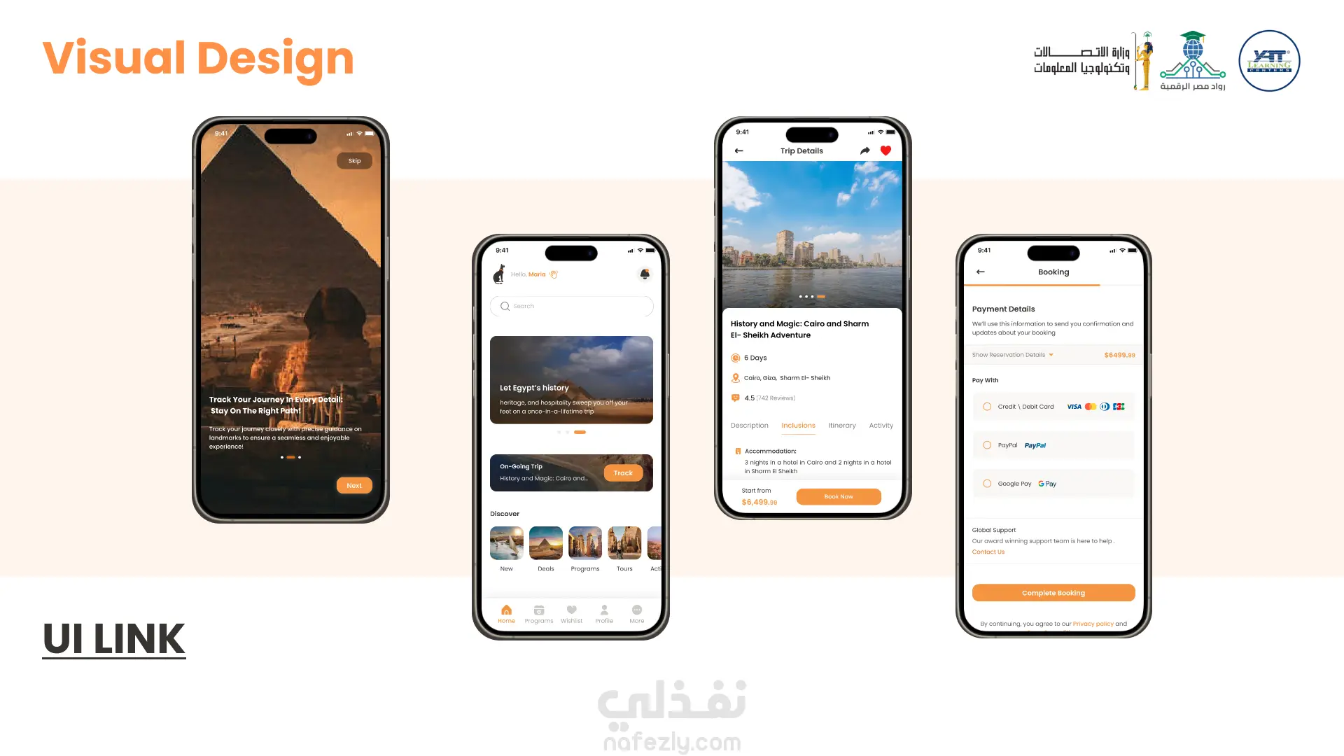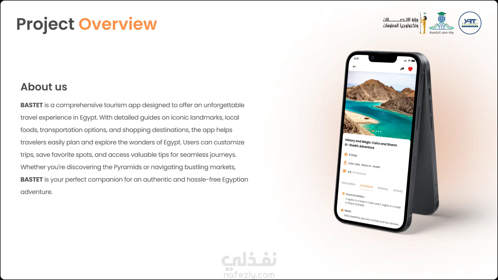 كان هذا التطبيق هو مشروع التخرج من تدريب وزراه الاتصالات و تكنولوجيا المعلومات و هو عباره عن كرفيق للسائح بمجرد وصوله المطار في المصر الى عودته لبلده و ذلك يشمل تنظيم رحلات داخليه مع توضيح معلومات تاريخيه خاصه بالمكان المراد زيارته ، اقتراحات بأفضل المطاعم او البازارات السياحيه و الرحلات بناء على تحديدات السائح و خاصه الفلتر. يوضح ايضا اخر الآحداث و الحفلات و الحجز من خلال التطبيق . توفير خدمه المرشد و الوصول اليه من خلا ل التحدث اليه و خاصيه التتبع في حاله وجود مجموعه و العديد من المزايا .و وكان هدف التطبيق هو تسليط الضوء على الاماكن السياحيه في مصر مع المعلومات التاريخيه و في نفس الوقت ترفيهي للسائح للأستمتاع بوجوده في مصر.