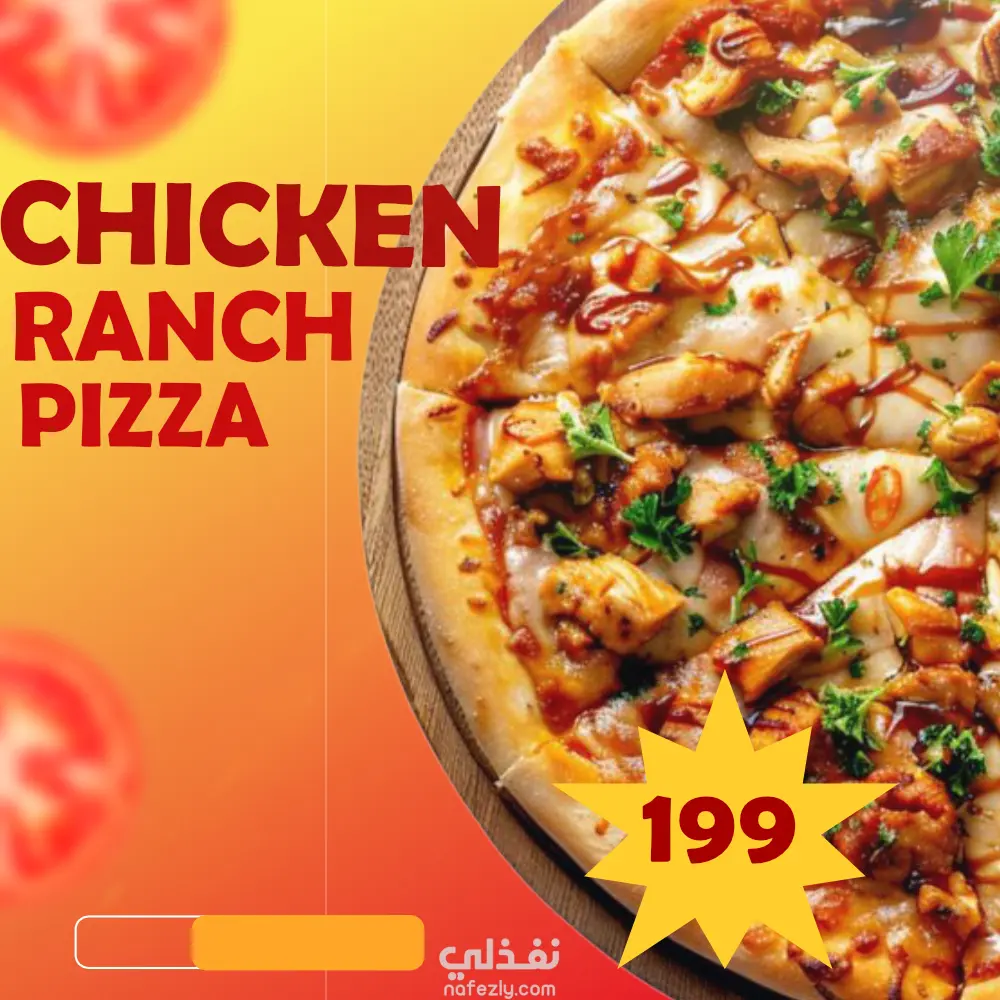 تصميم إعلان جذاب لمنتج Chicken Ranch Pizza، يعتمد على ألوان دافئة وشهية تعكس طابع الطعام وتلفت نظر العملاء بسرعة. تمّ إبراز صورة البيتزا بجودة عالية مع تنسيق النصوص بشكل واضح، بالإضافة إلى وضع السعر داخل عنصر بصري بارز لجذب الانتباه. مميزات التصميم: تنسيق ألوان احترافي يعزز من شهية العميل إبراز المنتج بصورة واضحة ومغرية كتابة نصوص قوية وسهلة القراءة استخدام عناصر جرافيكية مناسبة للطعام والعروض تصميم مناسب للاستخدام على: إنستغرام فيسبوك بوسترات وعروض المطاعم القوائم والعروض الترويجية الأدوات المستخدمة: Adobe Photoshop Affinity Designer