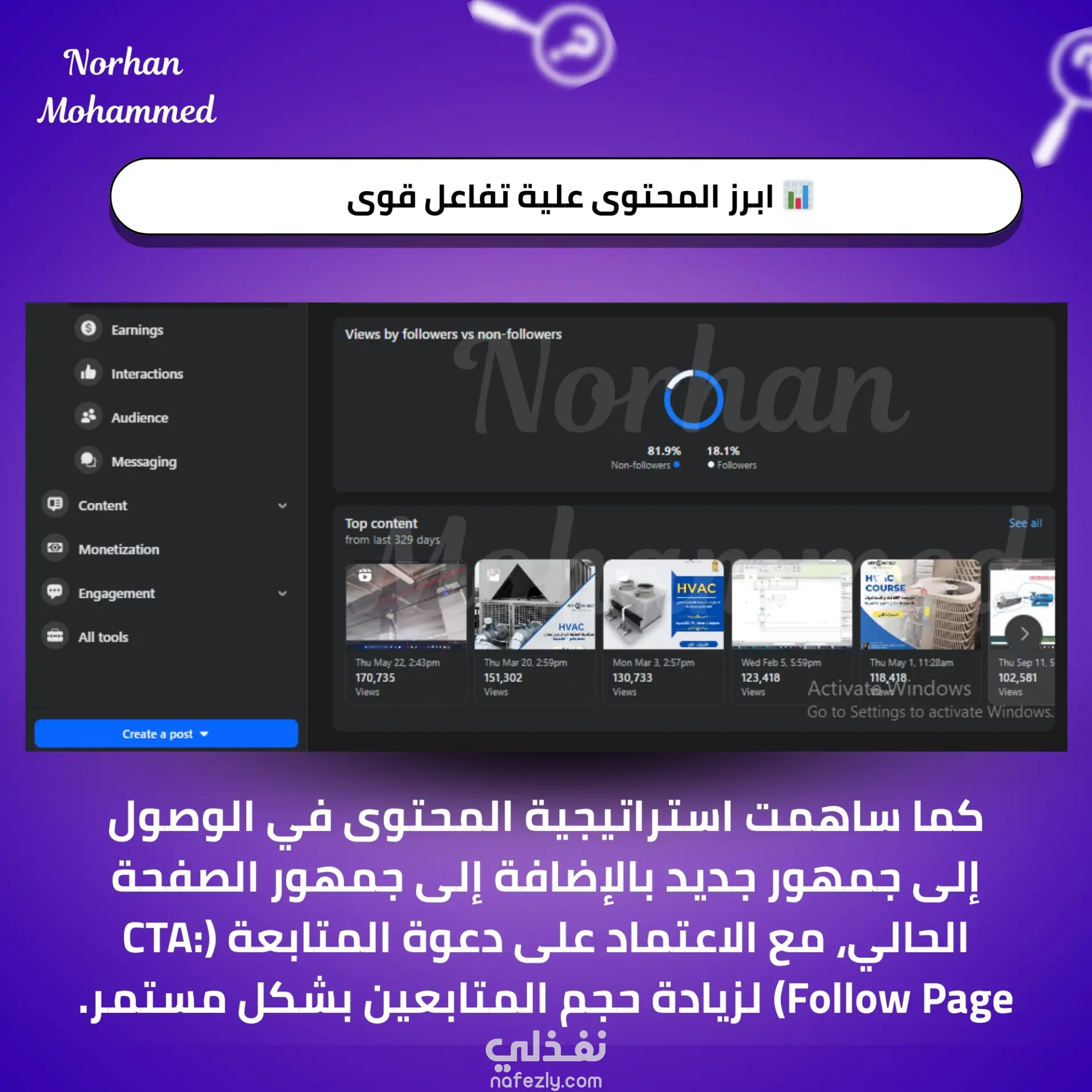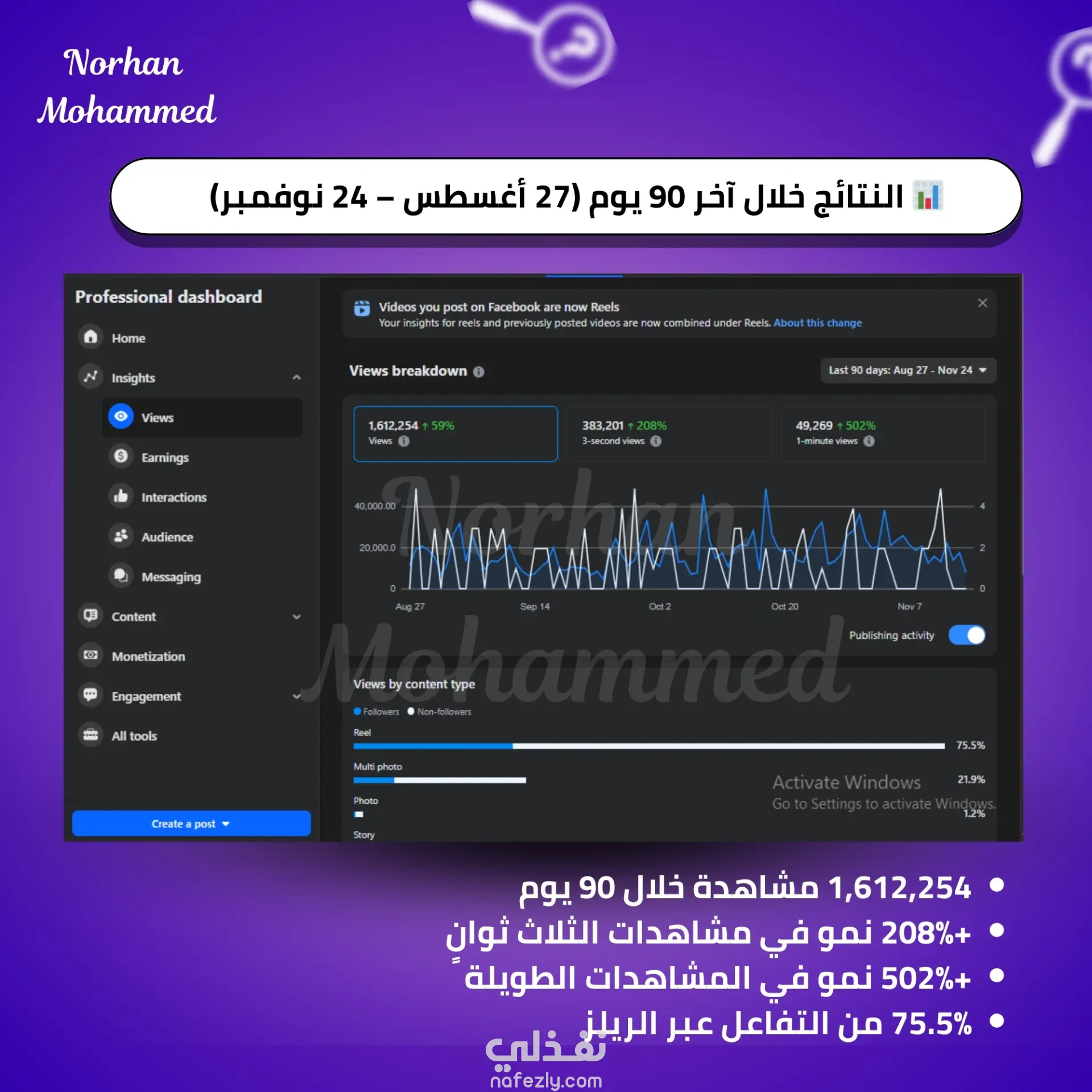 خلال آخر 90 يوم، شهدت الصفحة نموًا ملحوظًا في الأداء الرقمي بفضل التركيز على محتوى الفيديو القصير (Reels)، حيث وصلت المشاهدات إلى 1.6 مليون مشاهدة بزيادة 59%، وارتفعت مشاهدات الدقيقة الواحدة بنسبة +502%.
