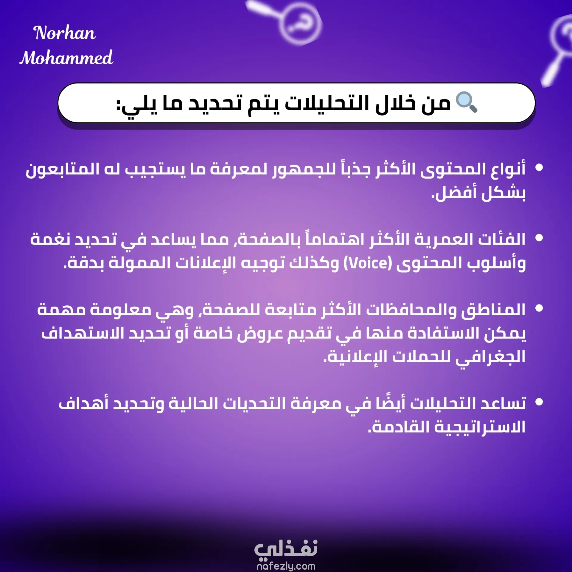 الفئات العمرية الأكثر اهتماماً بالصفحة، مما يساعد في تحديد نغمة وأسلوب المحتوى (Voice) وكذلك توجيه الإعلانات الممولة بدقة.