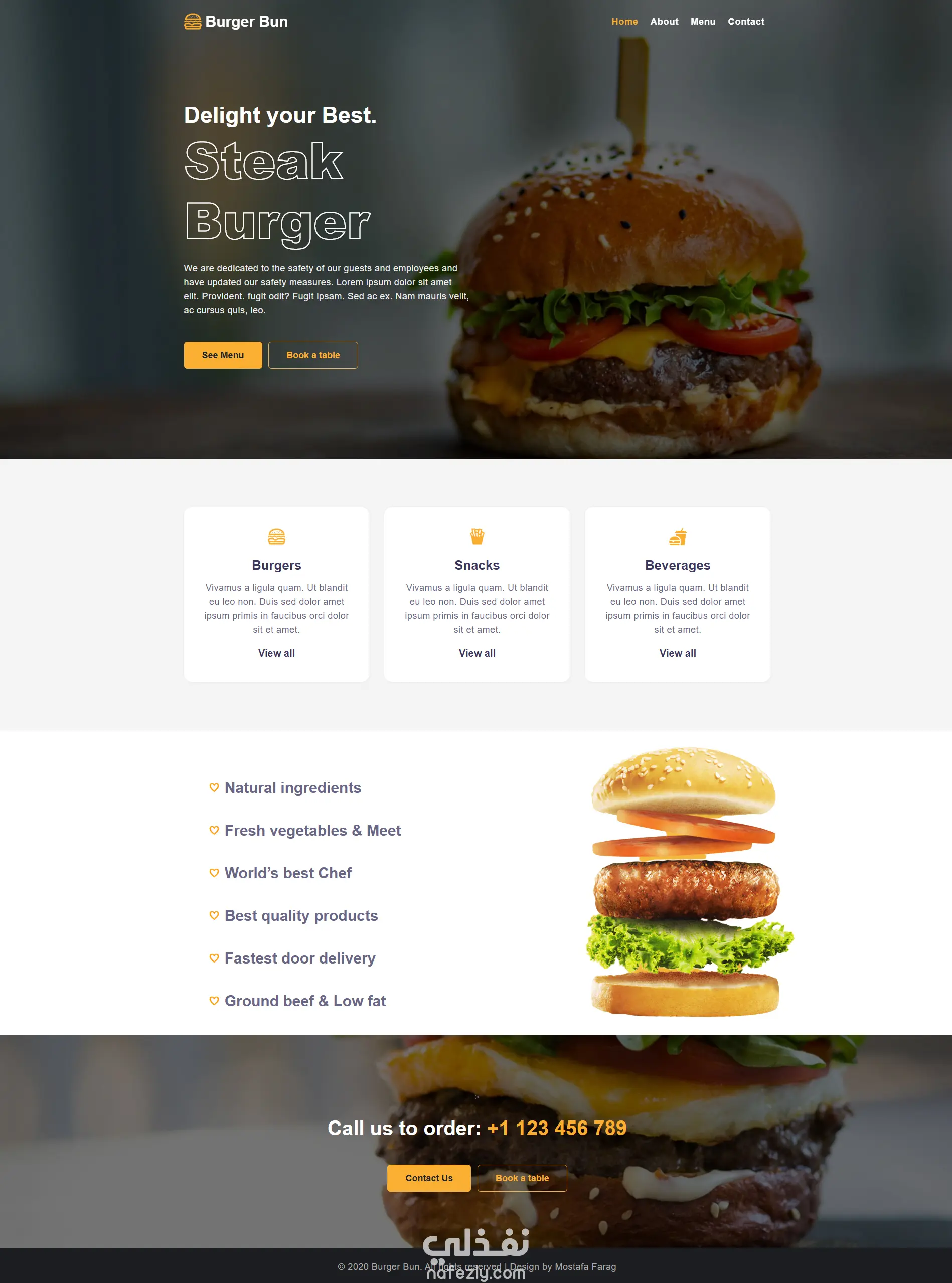 سأقوم بتصميم موقع مطعم برغر أو مطعم وجبات سريعة غني بالتفاصيل، احترافي، سريع، ومتجاوب مع جميع الأجهزة باستخدام أحدث تقنيات الويب