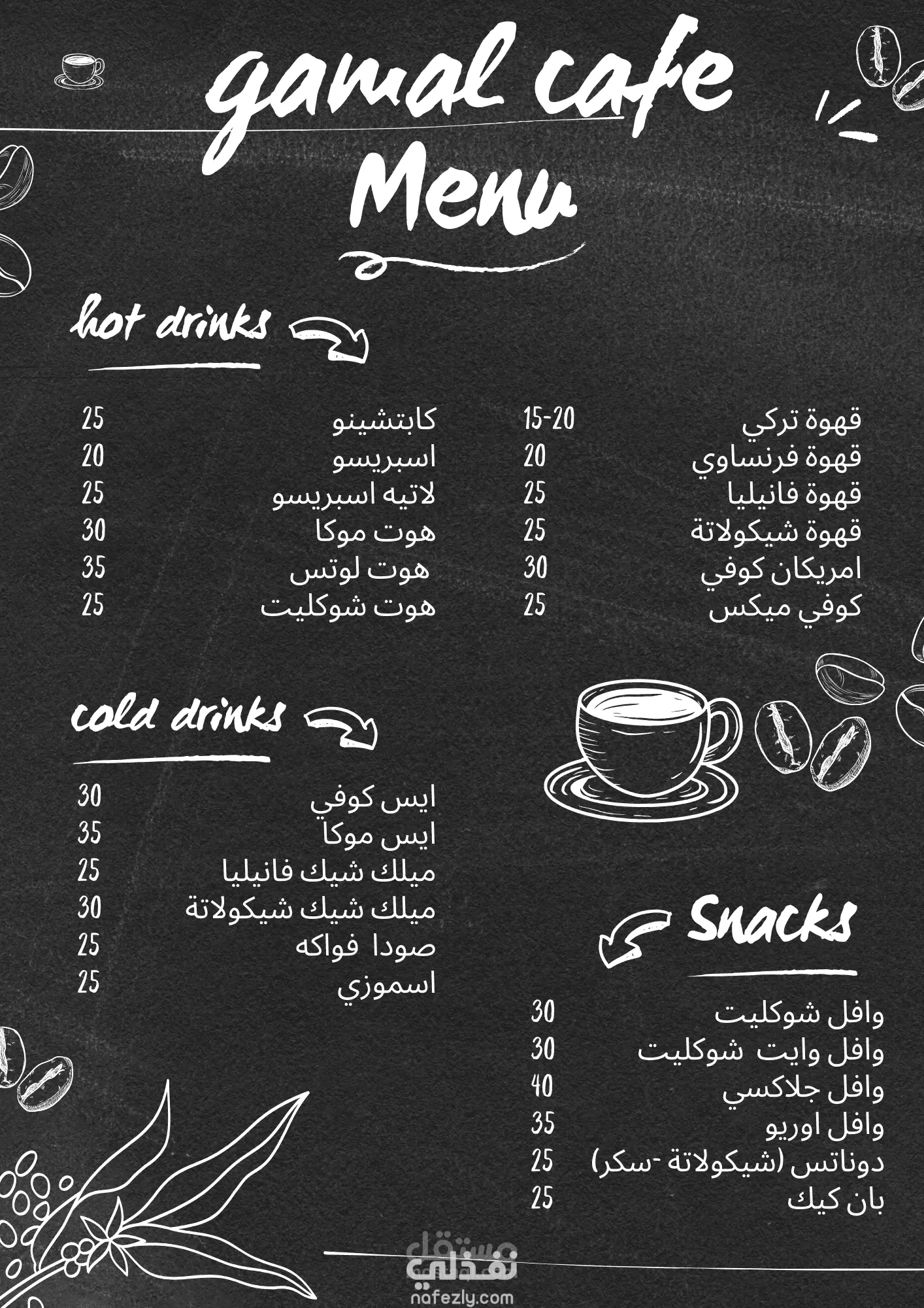 تصميم مبتكر ومتناسق لقائمة مقهى "جمال كافيه"، يجمع بين الجمال البصري والتظيم الواضح لتقديم تجربة مستخدم ممتعة للعملاء.