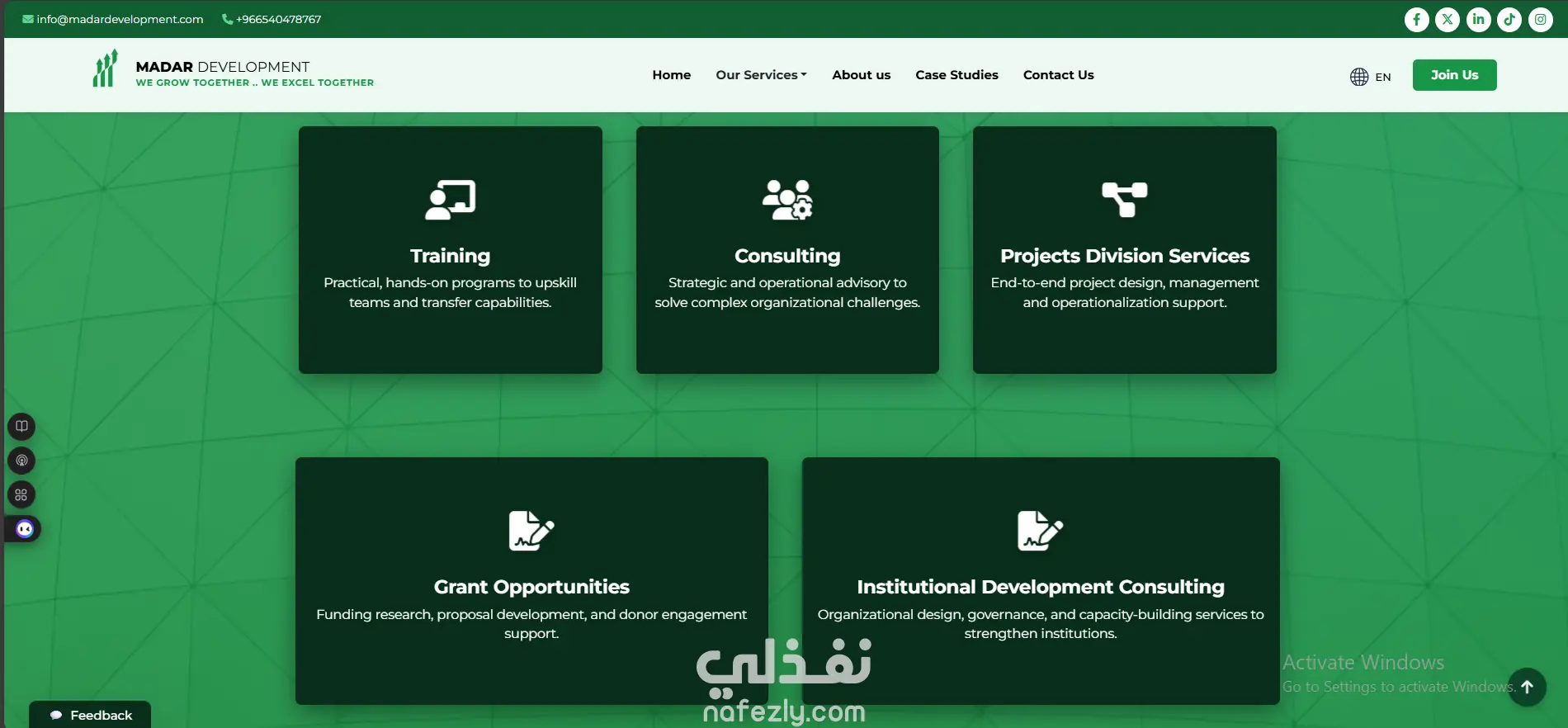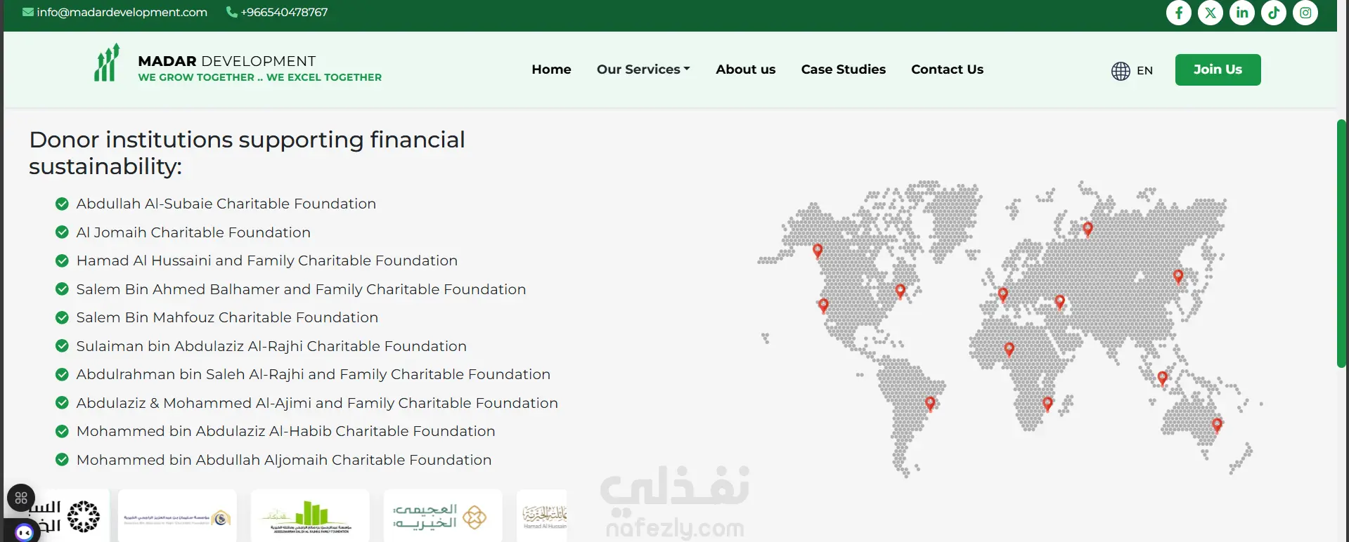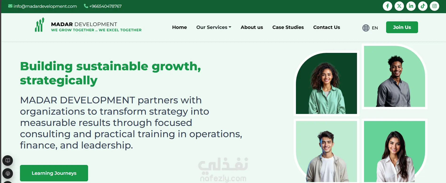 قمت بتطوير الواجهة الأمامية لموقع Madar Development، وهي شركة استشارات متكاملة تقدم خدمات لوجستية ومالية وإدارية للمنظمات غير الربحية والشركات الناشئة والجهات الحكومية. تم بناء الواجهة باستخدام React مع دعم لغتين (عربي – إنجليزي)، مع التركيز على الأداء، وسهولة الاستخدام، وتجربة مستخدم سلسة عبر جميع الأجهزة. كما تم تنظيم هيكل الصفحات وربط المكونات ديناميكيًا بطريقة مرنة تسهّل إدارة المحتوى وتعدد اللغات.