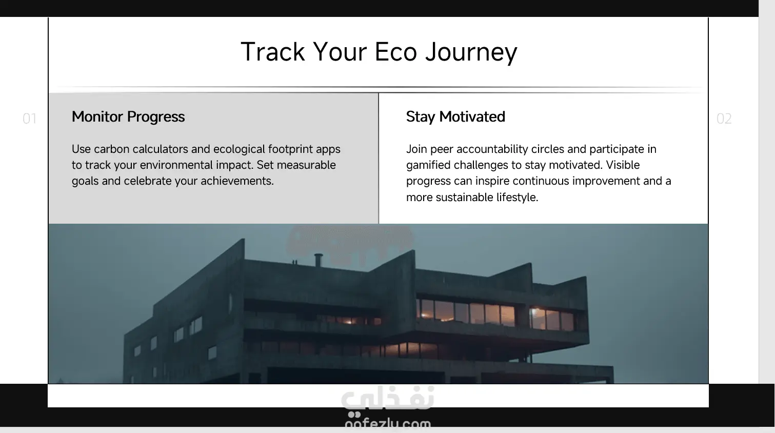 وصف عمل: عرض تقديمي عن الحياة الصديقة للبيئة Eco-Friendly Living نبذة عن العمل قمت بتصميم وإعداد عرض تقديمي احترافي بعنوان Eco-Friendly Living يهدف إلى نشر الوعي حول أساليب الحياة المستدامة وكيفية تقليل الأثر البيئي في حياتنا اليومية. ركّز العرض على تقديم معلومات علمية مبسطة مع تصميم بصري جذاب يشجع المشاهد على تبني عادات أكثر صداقة للبيئة. المهام التي قمت بها 1. جمع المحتوى والبحث * البحث حول مبادئ الاستدامة وأهمية حماية البيئة. * اختيار أهم الموضوعات التي تهم الجمهور مثل تقليل النفايات، إعادة التدوير، وترشيد استهلاك الطاقة. * ترتيب المعلومات وتحويلها إلى نقاط واضحة وسهلة الفهم. 2. تصميم الشرائح * إنشاء تصميم حديث بألوان هادئة مرتبطة بالطبيعة مثل الأخضر والأزرق والأبيض. * استخدام أيقونات ورسومات تعبر عن البيئة والاستدامة. * توزيع المحتوى داخل الشرائح بشكل مرتب وواضح. * إضافة عناوين محفزة مثل Why Eco-Friendly Living Matters. 3. تنظيم هيكل العرض يتضمن العرض عدة أجزاء تشمل: * مقدمة تشرح معنى الحياة الصديقة للبيئة وأهميتها. * توضيح المشكلات البيئية الحالية مثل التلوث وتغير المناخ. * حلول بسيطة تساعد الفرد على تقليل بصمته الكربونية في المنزل والعمل والاستهلاك اليومي. * أفكار حول إعادة التدوير وكيفية تطبيقها. * كيفية اختيار المنتجات الصديقة للبيئة. * خاتمة تشمل خطوات عملية لتطبيق نمط حياة مستدام. 4. تحسين العرض * اختيار خط واضح وسهل القراءة. * إضافة انتقالات بسيطة واحترافية بين الشرائح. * الاهتمام بتوازن النصوص والصور لضمان الحفاظ على جاذبية العرض. نتيجة العمل * عرض تقديمي متكامل واحترافي مناسب للعروض التعليمية أو التوعية البيئية أو ورش العمل. * تصميم بصري جذاب يساعد على إيصال المعلومات بشكل بسيط وواضح. * تعزيز فهم الجمهور لمفهوم الحياة المستدامة وتشجيعهم على تطبيقها. المهارات المستخدمة * Presentation Design * PowerPoint / Google Slides * Research and Content Development * Visual Communication * Layout and Color Harmony