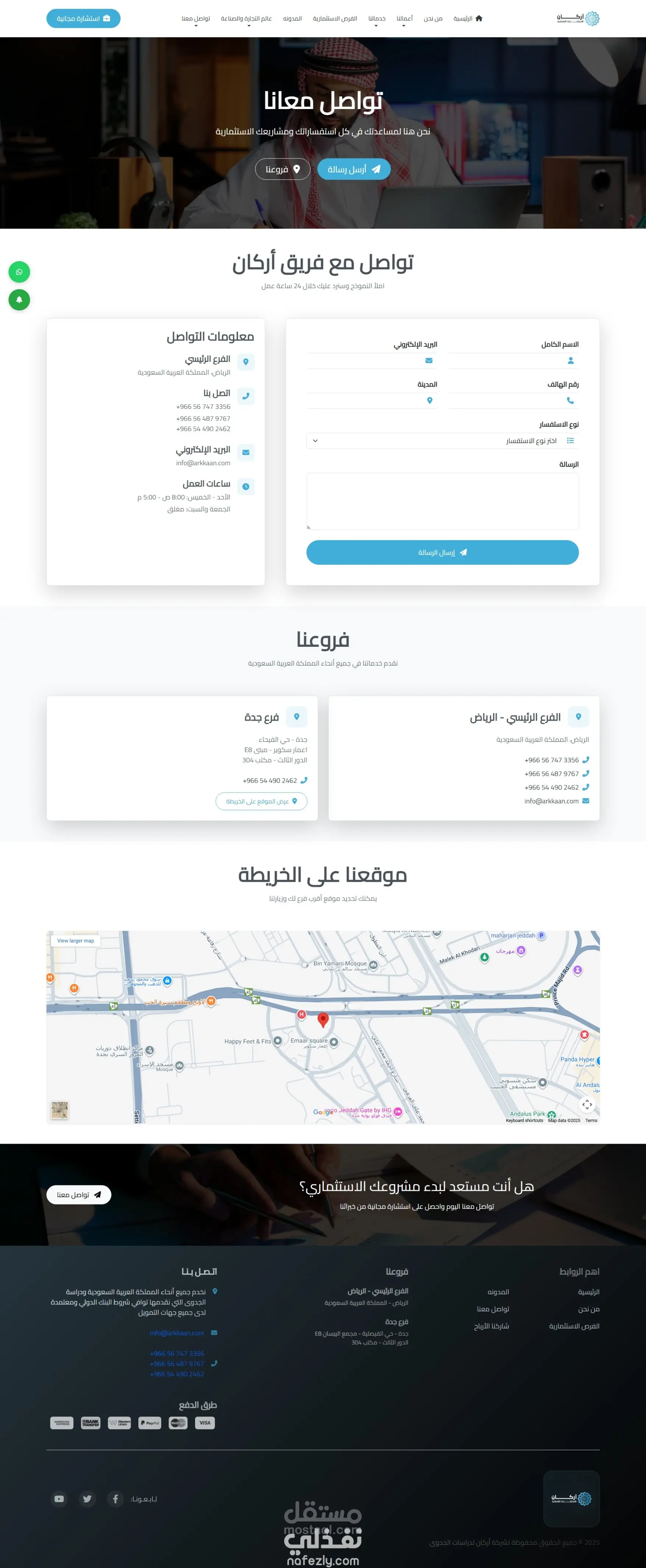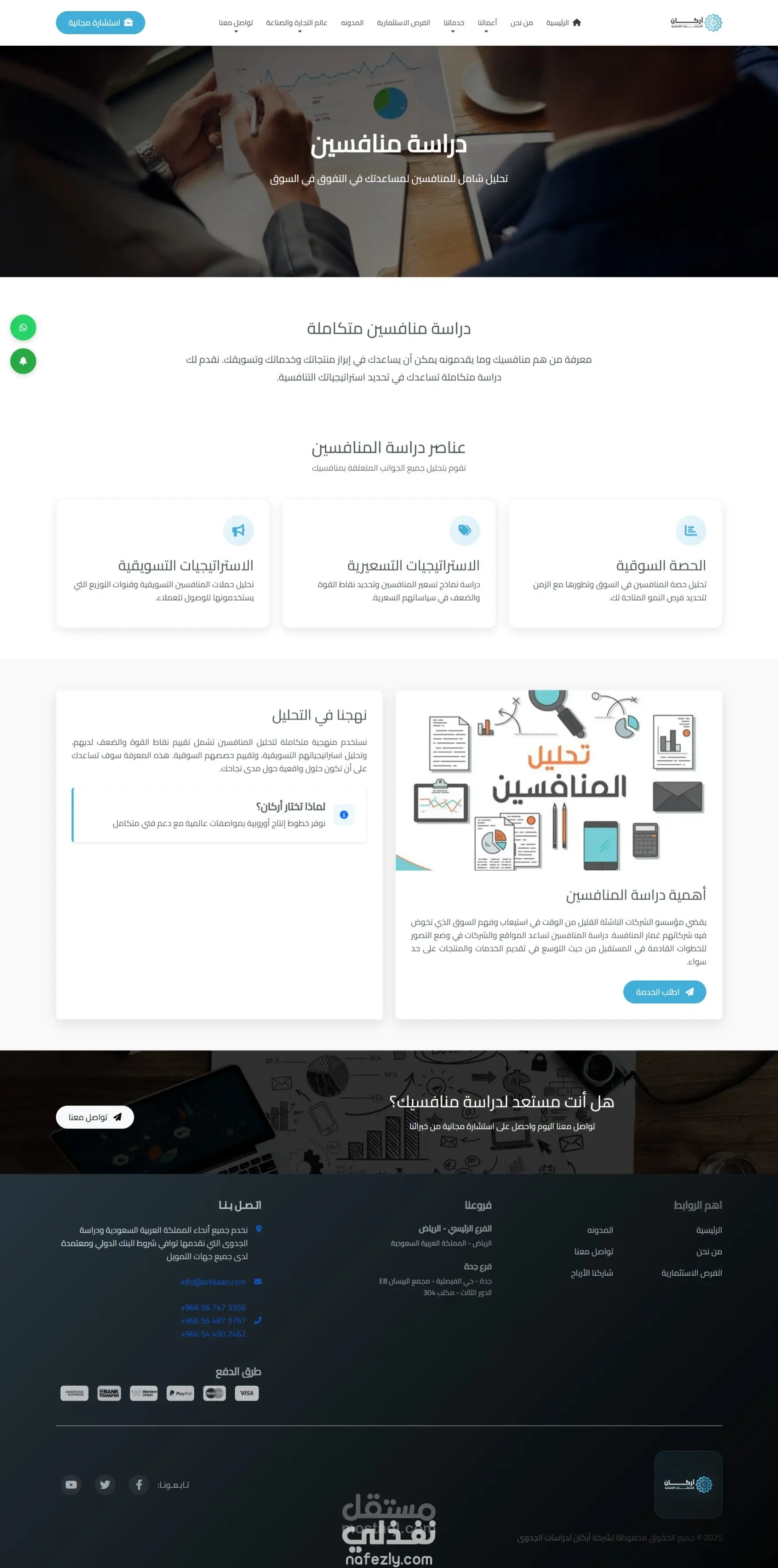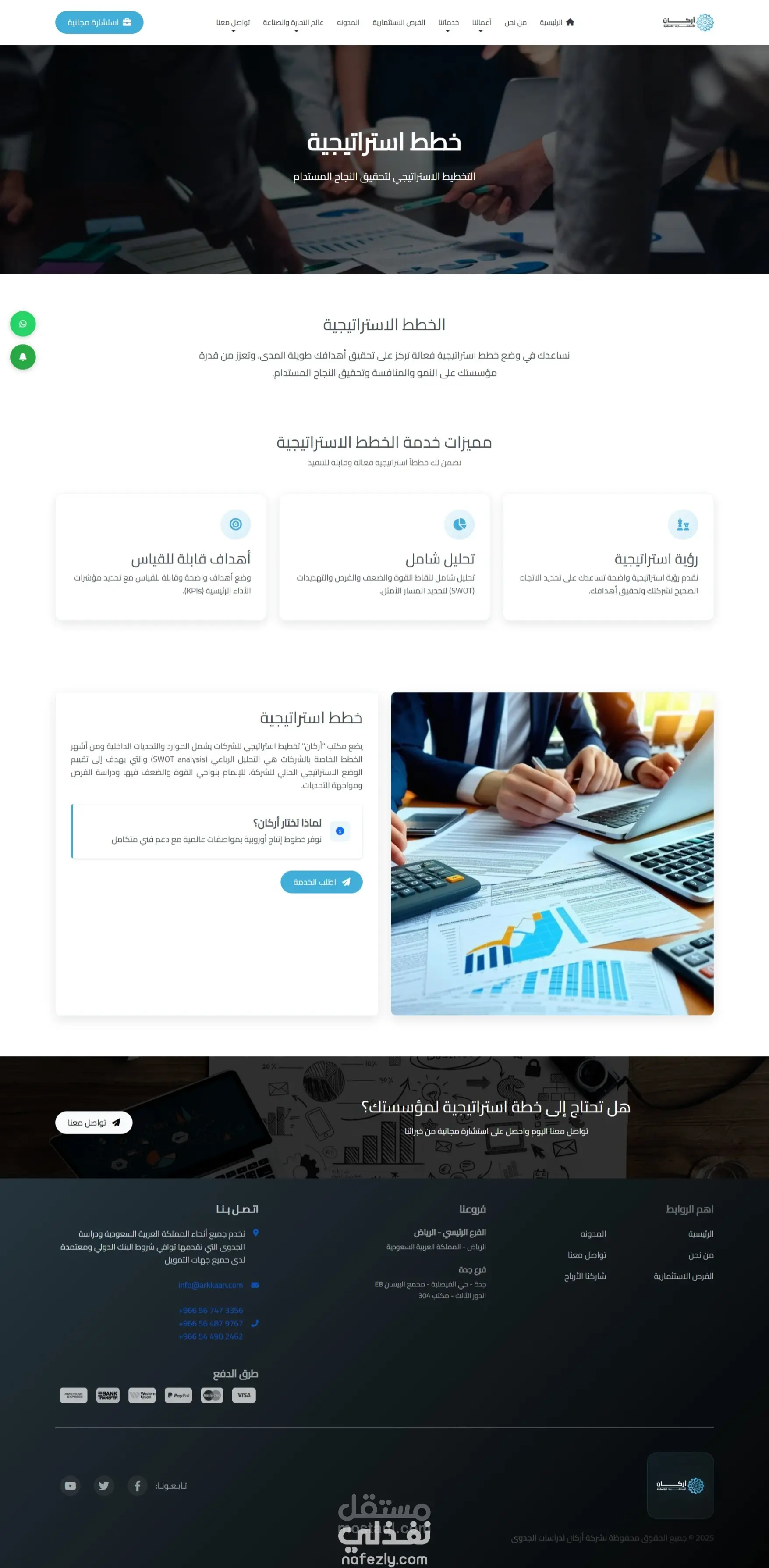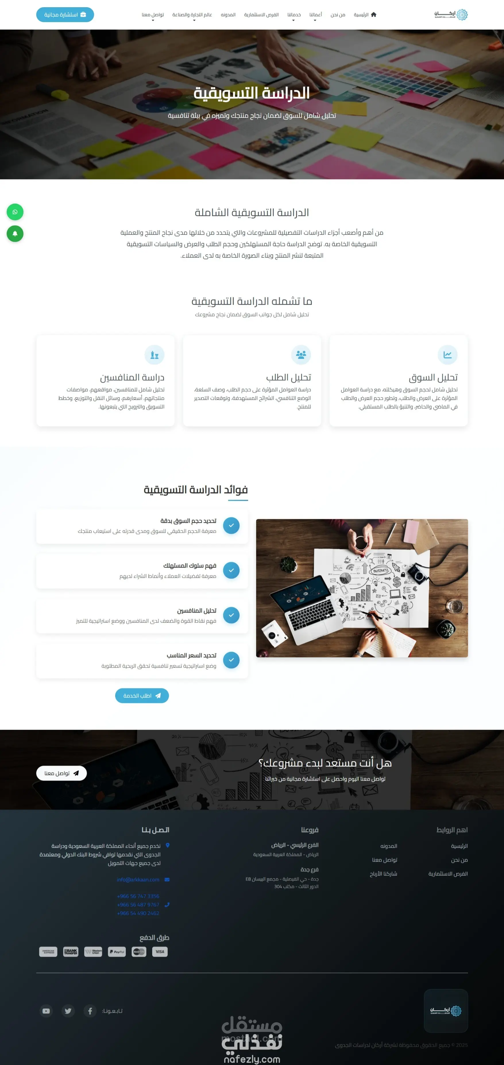 قمت بتطوير موقع ويب احترافي لشركة اركان السعودية المتخصصة في إعداد دراسات الجدوى، بحيث يحتوي الموقع على عدة أقسام أساسية تشمل: